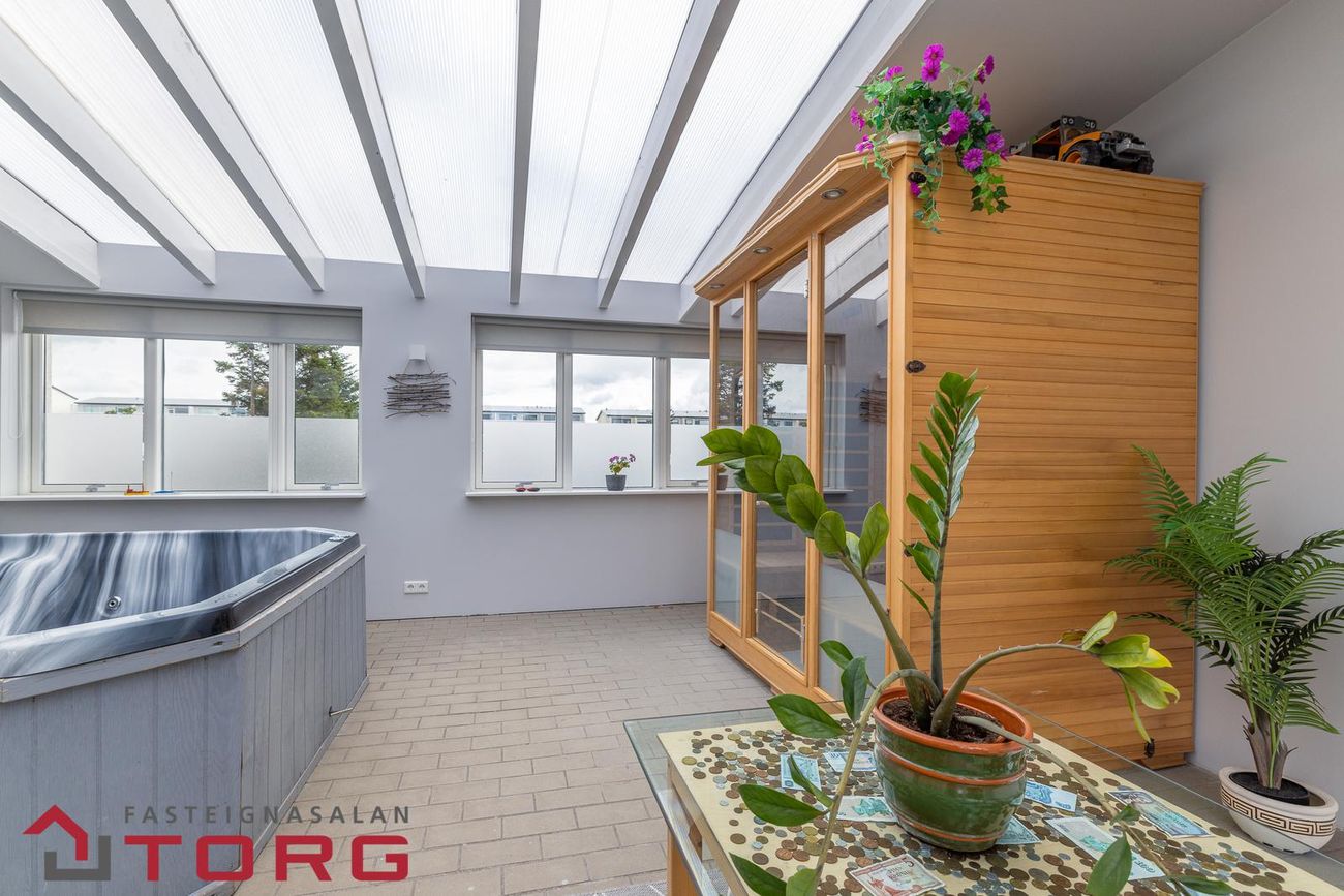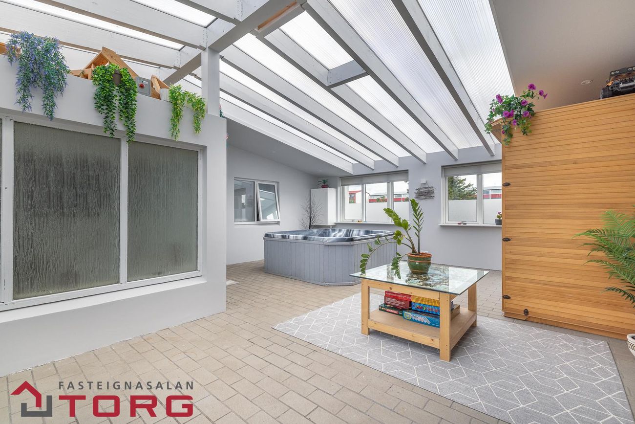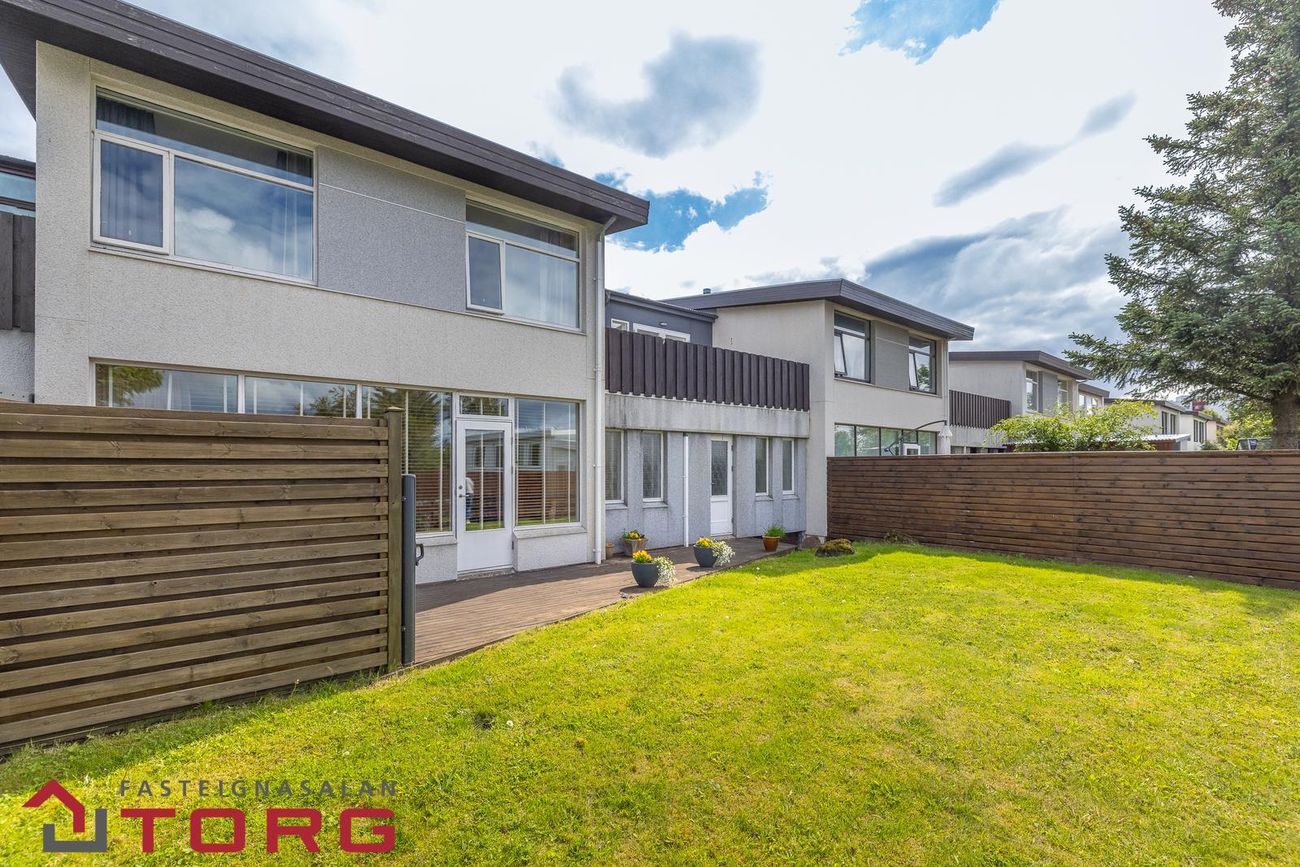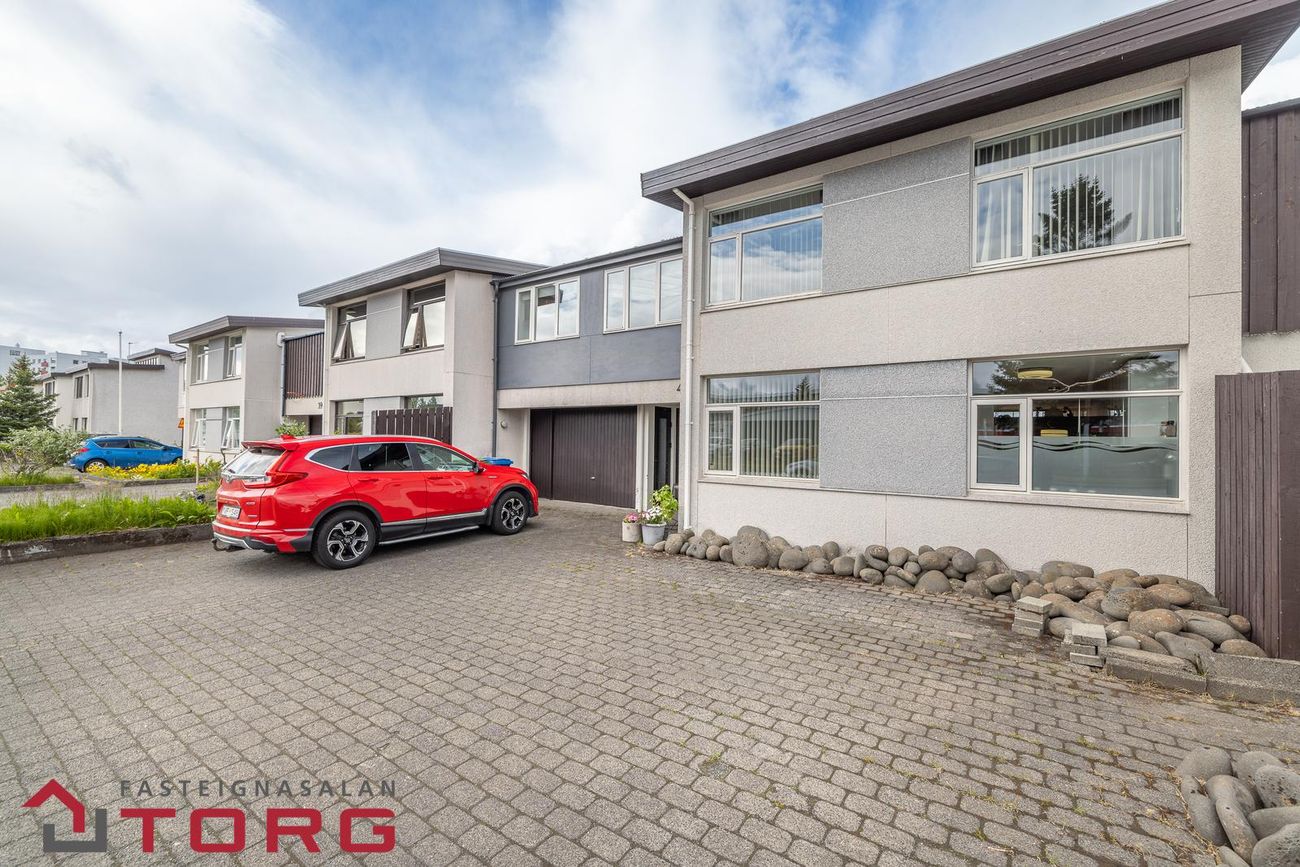 Gott vel skipulagt 206fm. raðhús, þar af er bílskúr 36.fm, og ásamt 30.fm sólstofu, hún er ekki inni í heildar fermetra fjölda sem er með sólstofunni 236fm. Húsið er á tveimur hæðum og hefur fengið gott viðhald í gegnum árin og er mikið endurnýjað, það er klætt að utan og því viðhaldslitið. 4 svefnherbergi, auðvelt að bæta 5. herb við. Gestasnyrting. Eins viðar parket er á öllum parketlögðum gólfum í húsinu. Rúmgott bílastæði með snjóbræðslu að hluta, bílastæðið rúmar allt að 4-5 bíla. Skjól góður garður með sólpalli til suð/vestur. Ofan á bílskúr er nýleg 30.fm. sólstofa sem er ekki inni í fermetrafjölda hússins þar er heitur pottur og gengið út á stórar svalir. Gluggar eru endurnýjaðir að hluta til.