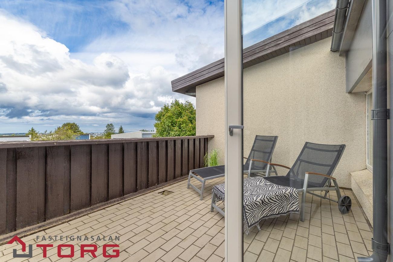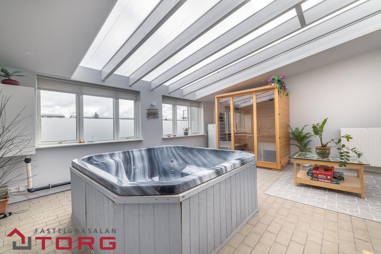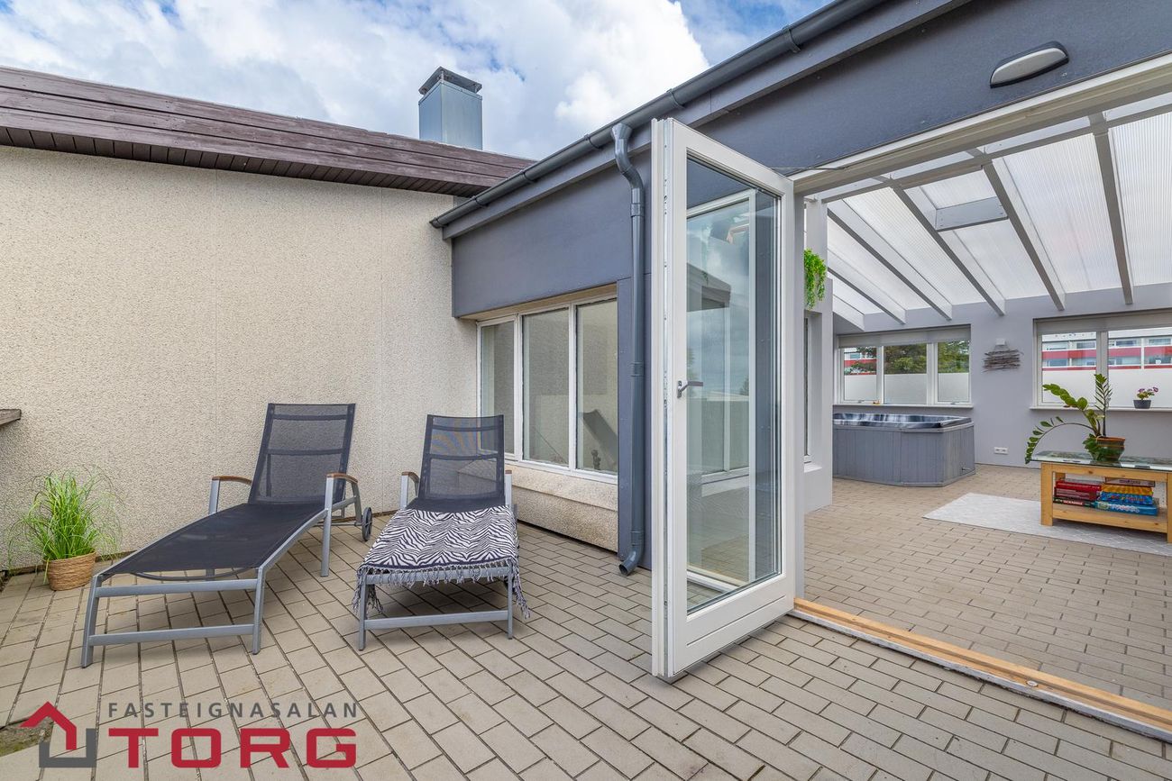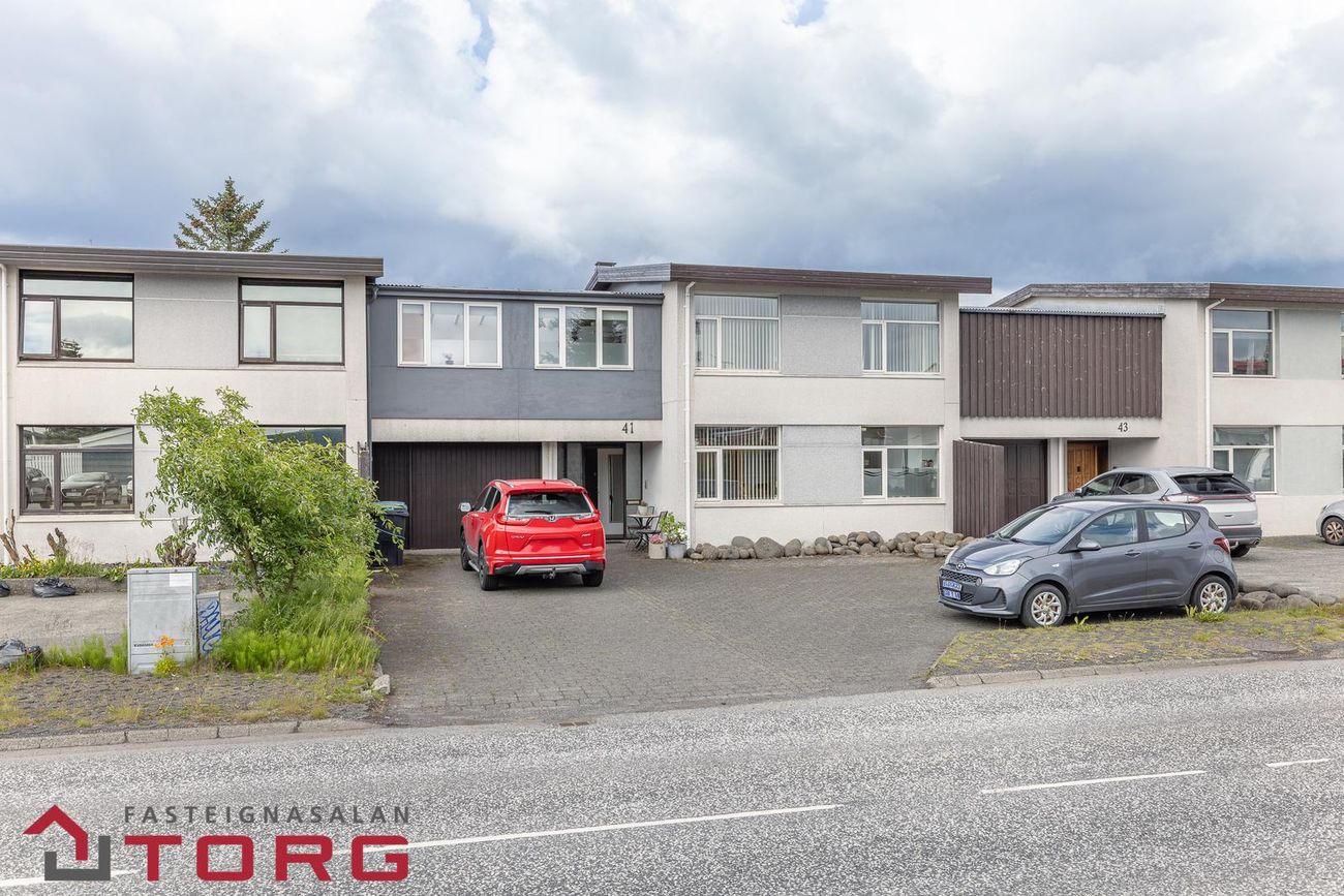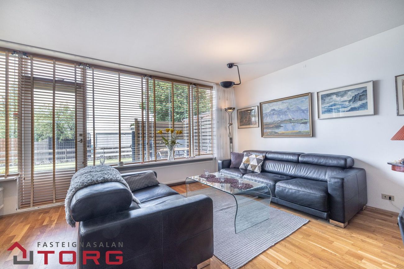 Gott vel skipulagt 206fm. raðhús, þar af er bílskúr 36.fm, og ásamt 30.fm sólstofu, hún er ekki inni í heildar fermetra fjölda sem er með sólstofunni 236fm. Húsið er á tveimur hæðum og hefur fengið gott viðhald í gegnum árin og er mikið endurnýjað, það er klætt að utan og því viðhaldslitið. 4 svefnherbergi, auðvelt að bæta 5. herb við. Gestasnyrting. Eins viðar parket er á öllum parketlögðum gólfum í húsinu. Rúmgott bílastæði með snjóbræðslu að hluta, bílastæðið rúmar allt að 4-5 bíla. Skjól góður garður með sólpalli til suð/vestur. Ofan á bílskúr er nýleg 30.fm. sólstofa sem er ekki inni í fermetrafjölda hússins þar er heitur pottur og gengið út á stórar svalir. Gluggar eru endurnýjaðir að hluta til.