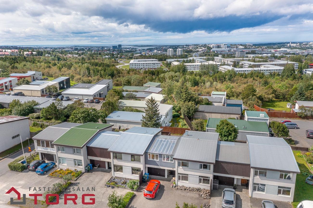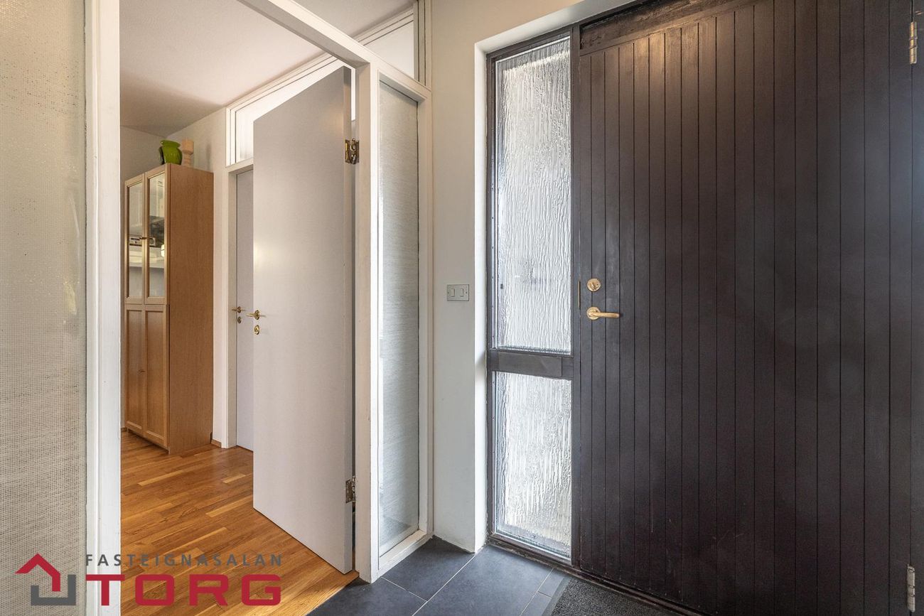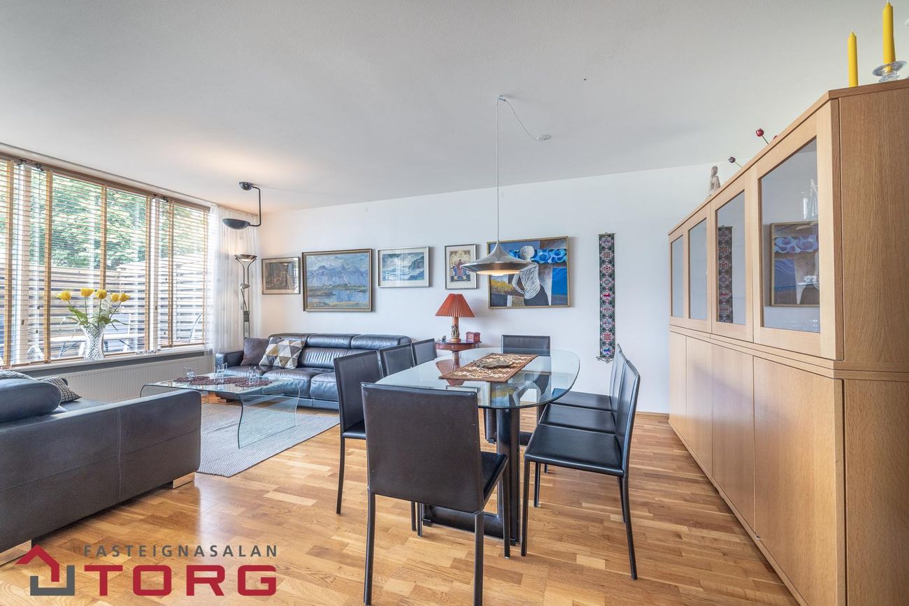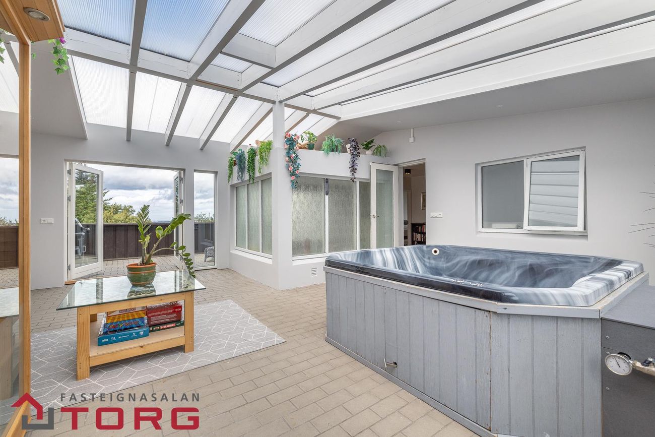 Gott vel skipulagt 206fm. raðhús, þar af er bílskúr 36.fm, og ásamt 30.fm sólstofu, hún er ekki inni í heildar fermetra fjölda sem er með sólstofunni 236fm. Húsið er á tveimur hæðum og hefur fengið gott viðhald í gegnum árin og er mikið endurnýjað, það er klætt að utan og því viðhaldslitið. 4 svefnherbergi, auðvelt að bæta 5. herb við. Gestasnyrting. Eins viðar parket er á öllum parketlögðum gólfum í húsinu. Rúmgott bílastæði með snjóbræðslu að hluta, bílastæðið rúmar allt að 4-5 bíla. Skjól góður garður með sólpalli til suð/vestur. Ofan á bílskúr er nýleg 30.fm. sólstofa sem er ekki inni í fermetrafjölda hússins þar er heitur pottur og gengið út á stórar svalir. Gluggar eru endurnýjaðir að hluta til.