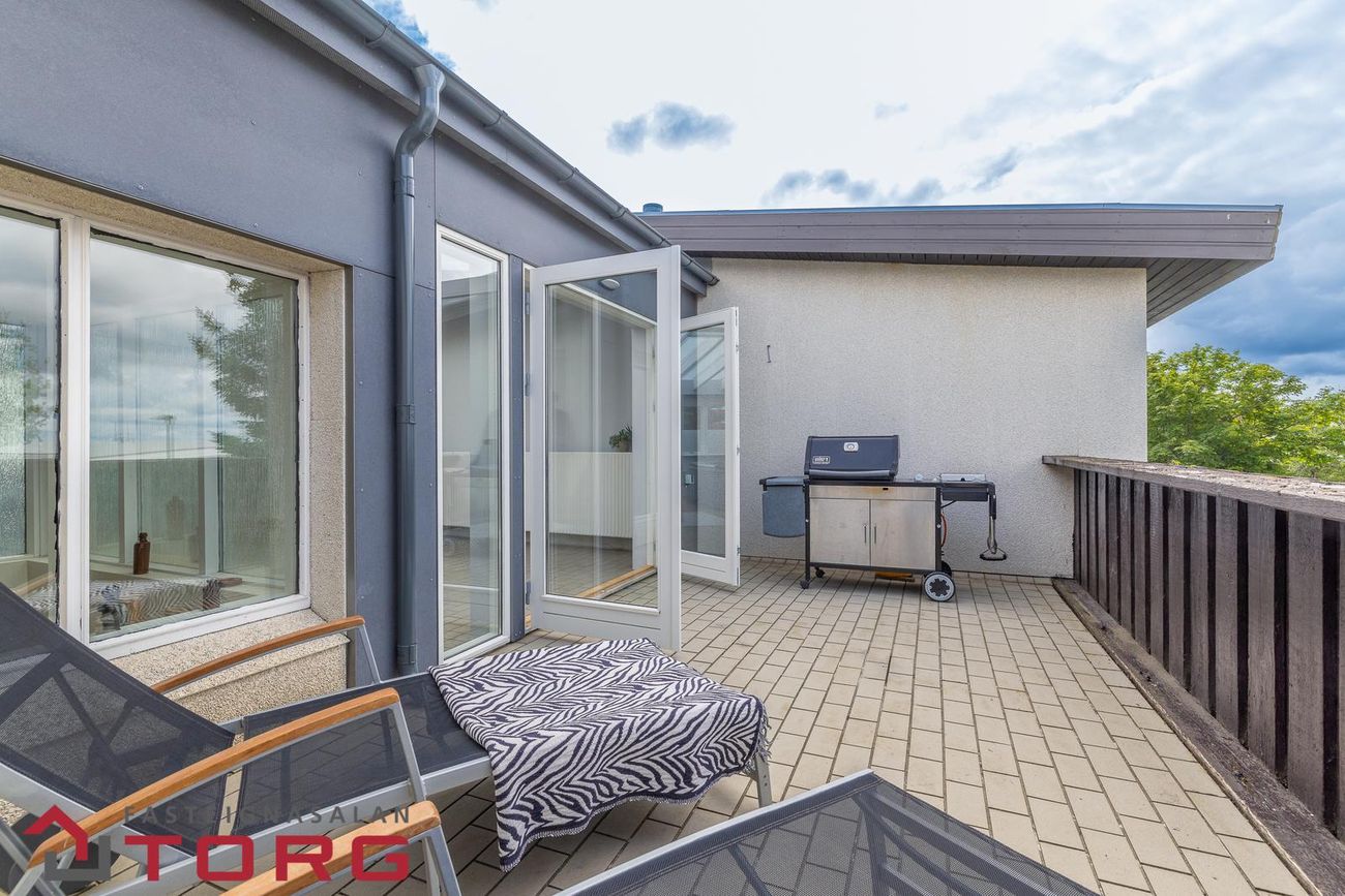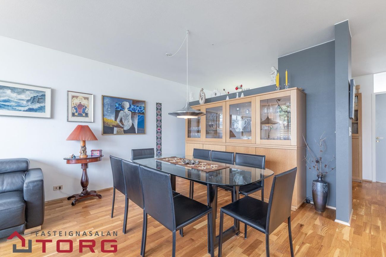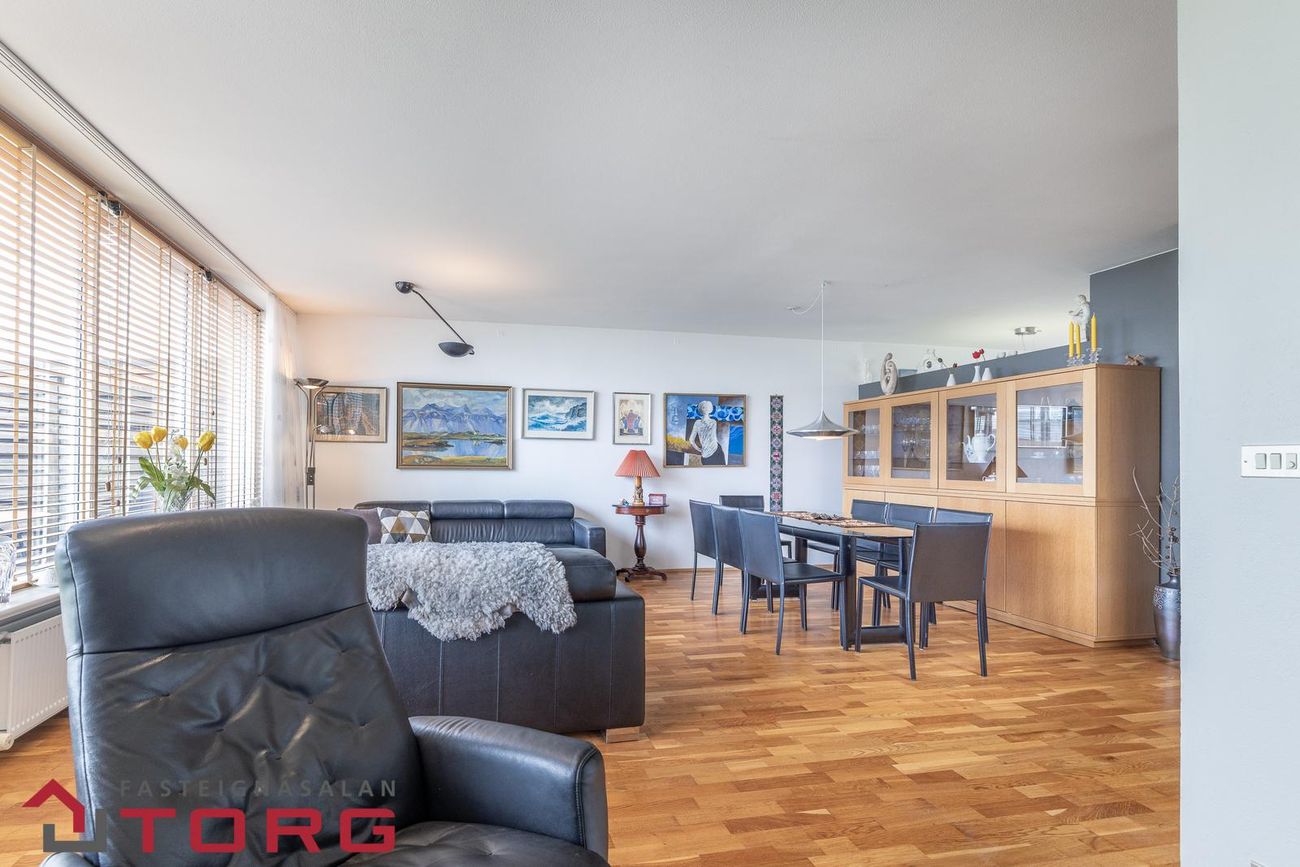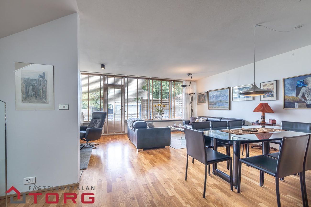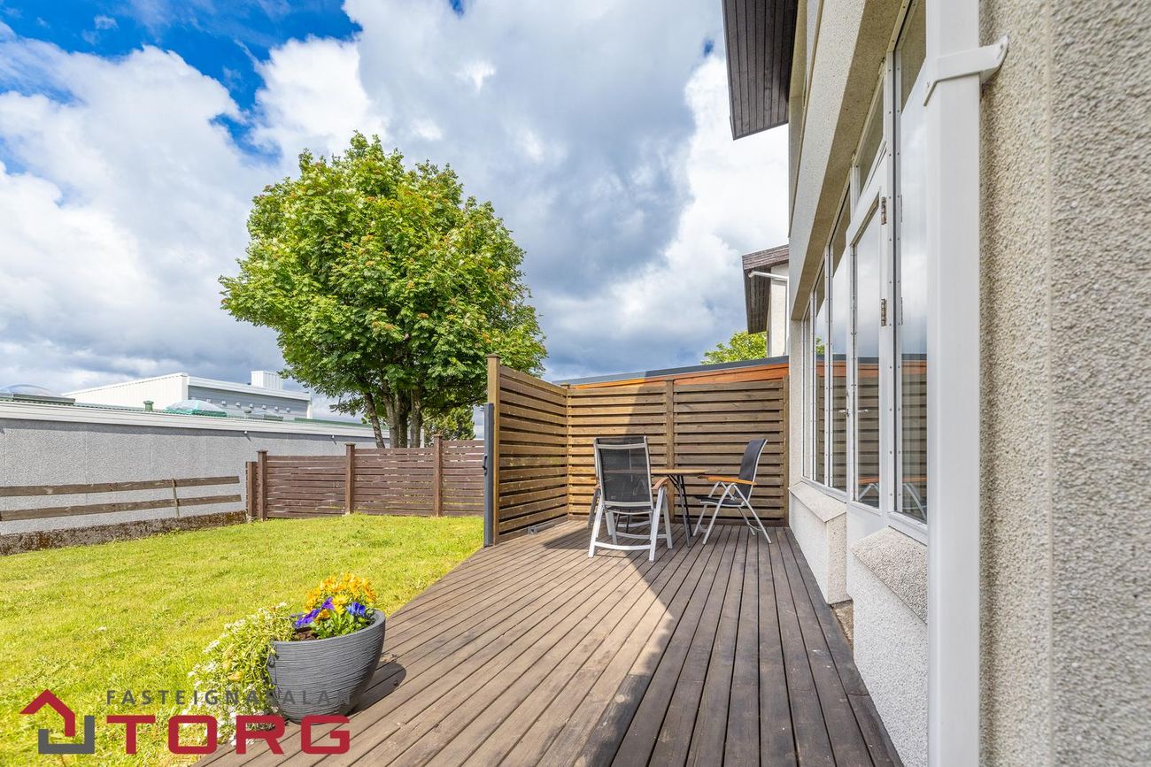 Gott vel skipulagt 206fm. raðhús, þar af er bílskúr 36.fm, og ásamt 30.fm sólstofu, hún er ekki inni í heildar fermetra fjölda sem er með sólstofunni 236fm. Húsið er á tveimur hæðum og hefur fengið gott viðhald í gegnum árin og er mikið endurnýjað, það er klætt að utan og því viðhaldslitið. 4 svefnherbergi, auðvelt að bæta 5. herb við. Gestasnyrting. Eins viðar parket er á öllum parketlögðum gólfum í húsinu. Rúmgott bílastæði með snjóbræðslu að hluta, bílastæðið rúmar allt að 4-5 bíla. Skjól góður garður með sólpalli til suð/vestur. Ofan á bílskúr er nýleg 30.fm. sólstofa sem er ekki inni í fermetrafjölda hússins þar er heitur pottur og gengið út á stórar svalir. Gluggar eru endurnýjaðir að hluta til.