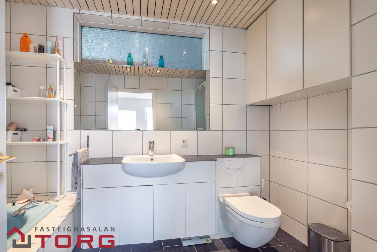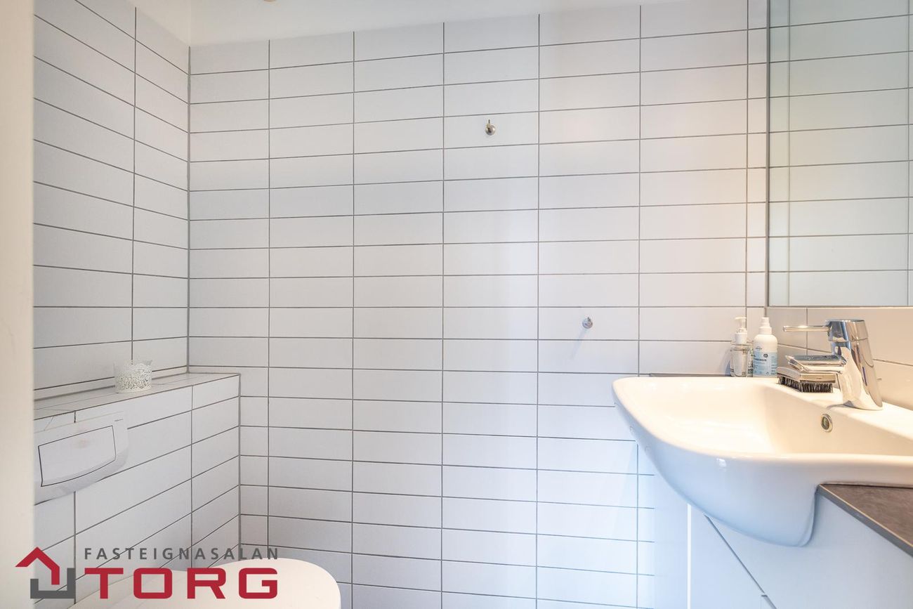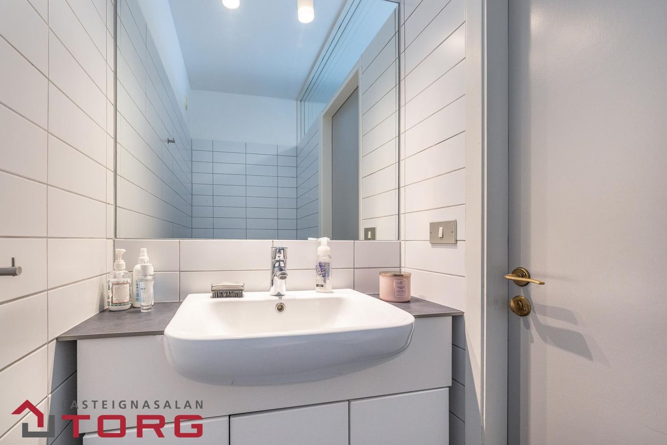 Gestasnyrting: Flísalögð í hóf og gólf, hvít innrétting með handlaug, spegill ofan við og upphengt salerni.