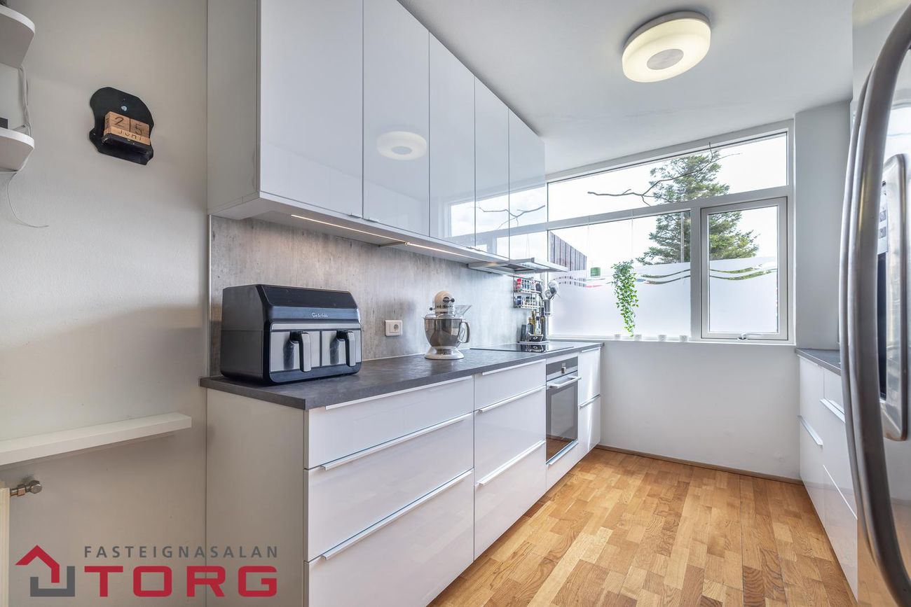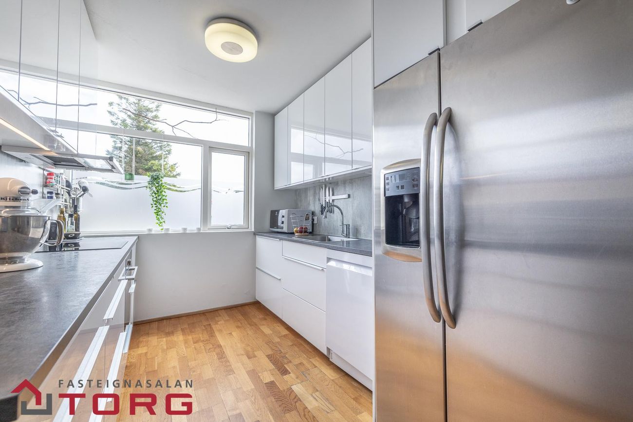 Eldhús hefur verið endurnýjað. Hvít innrétting með miklu skápa plássi er frá KVIK, span helluborð með gufugleypi ofan við. Simens bakarofn. uppþvottavél og Amerískur GE ísskápur með frysti. Rúmgóður borðkrókur. Hægt er að opna eldhús við stofu, gólf er parketlagt