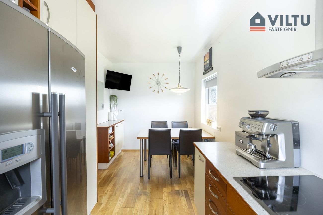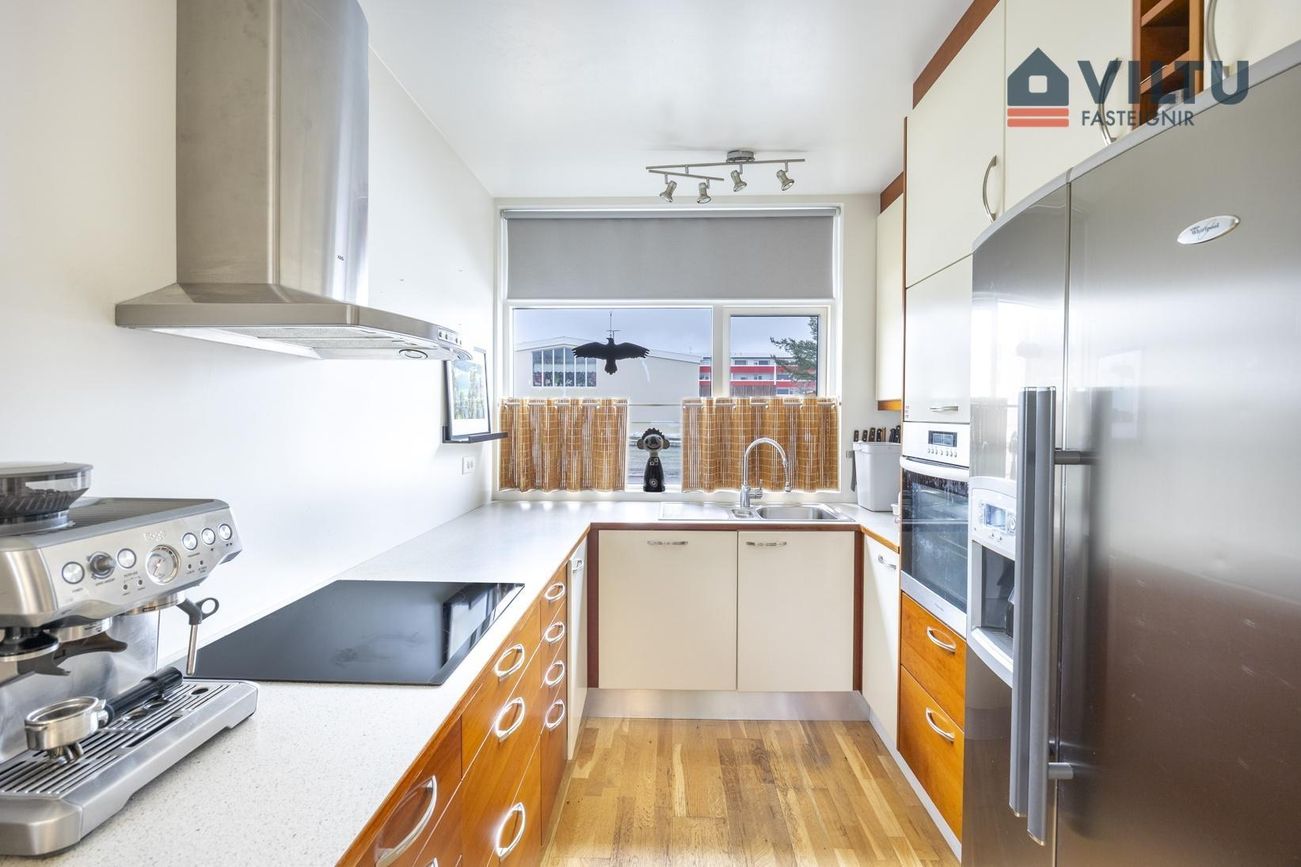 Eldhús Vönduð U-laga innrétting með ofn í vinnuhæð, innbyggða uppþvottavél og pláss fyrir amerískan ísskáp. Heimilstæki hafa verið endurnýjuð að hluta. Góður eldhúskrókur er við glugga í enda eldhúss..