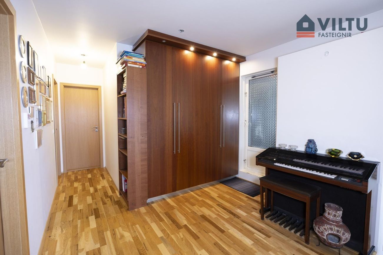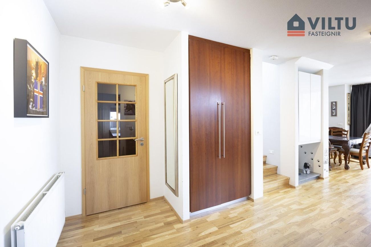Frá stiga er gengið í gott hol og þaðan í önnur rými hæðarinnar. Í holi er stór fjórfaldur innbyggður fata- og geymsluskápur.