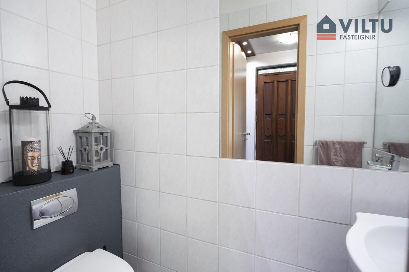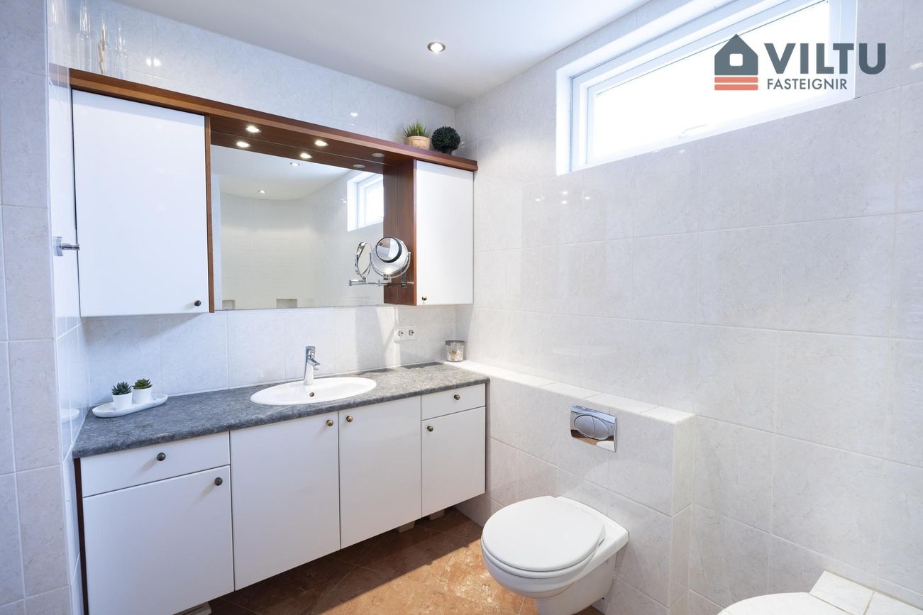 Gestasnyrting: Flísalögð í hóf og gólf. Upphengt salerni .