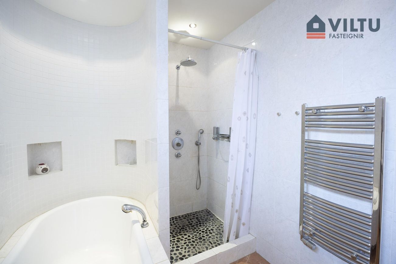 Baðherbergið: Það er flísalagt í hólf og gólf, góð innrétting með handlaug, baðkar og sér sturta. Upphengt salerni og handklæðaofn.