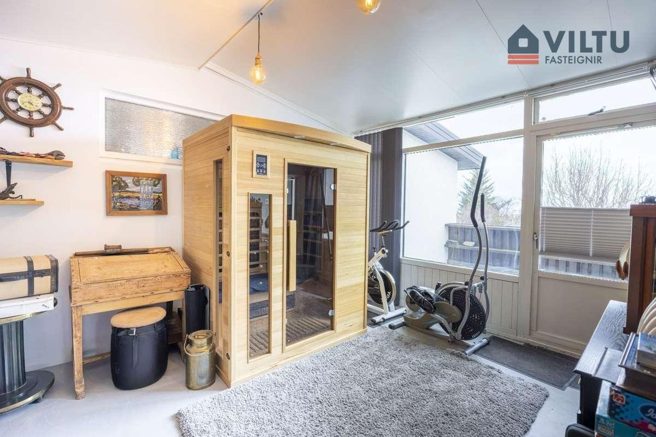 Bílskúr: 36m2. Steypt gólf, hiti og heitt/kalt vatn, vaskur. Hægt er að ganga í garðinn frá bílskúrnum.
