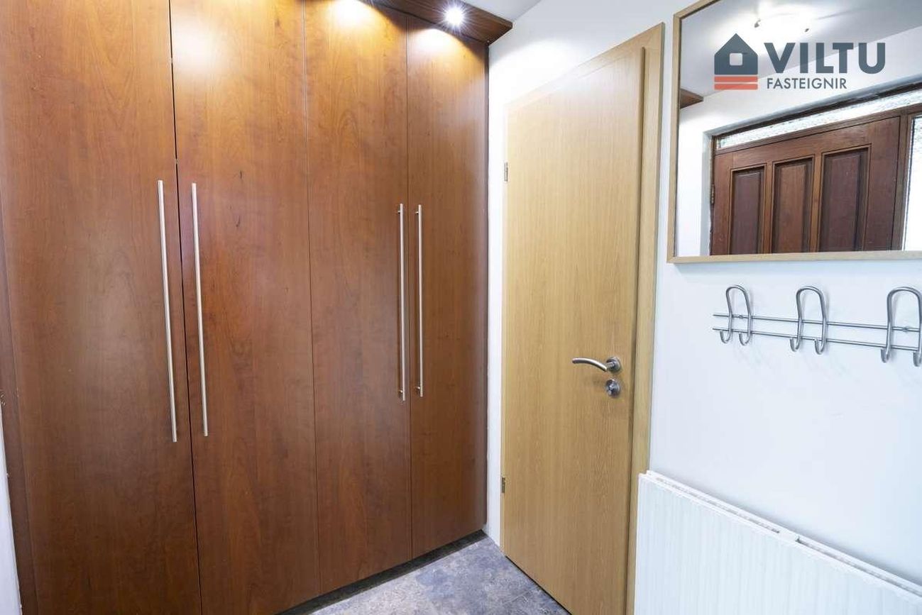 Anddyri: Flísalagt og með stórum innbyggðum fataskáp.