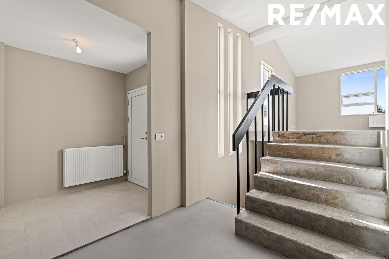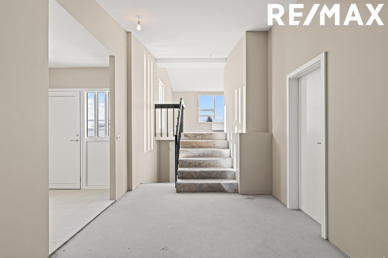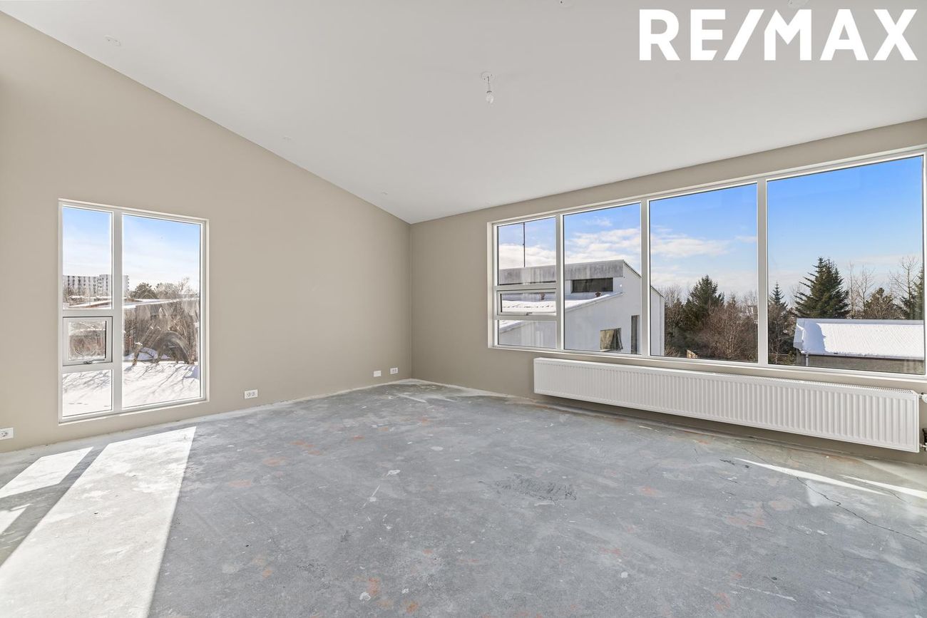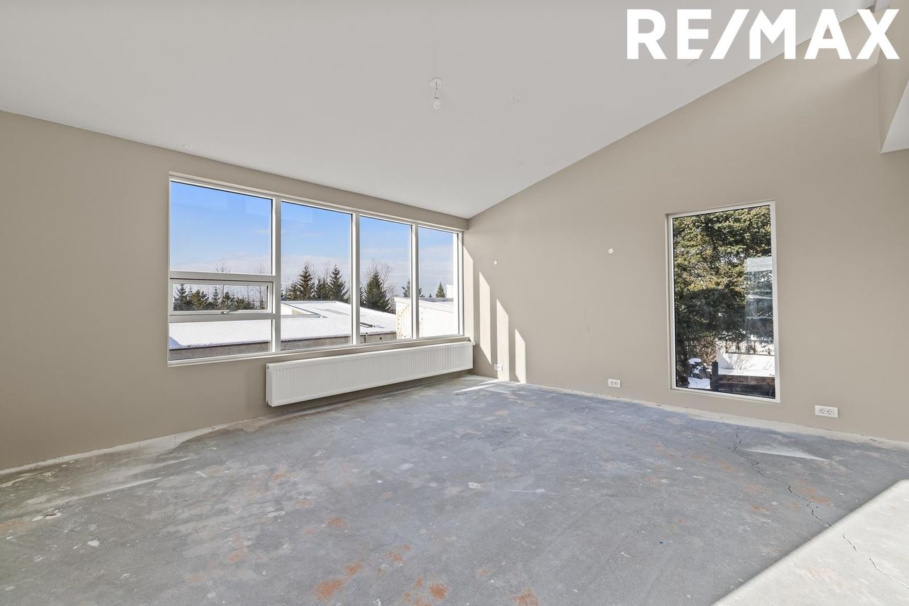 Stofa og borðstofa: Rúmgott og bjart alrými með mikilli lofthæð og stórum ál/tré gluggum sem veita mikið náttúruljós. Gólf flotuð, tilbúin fyrir gólfefni.