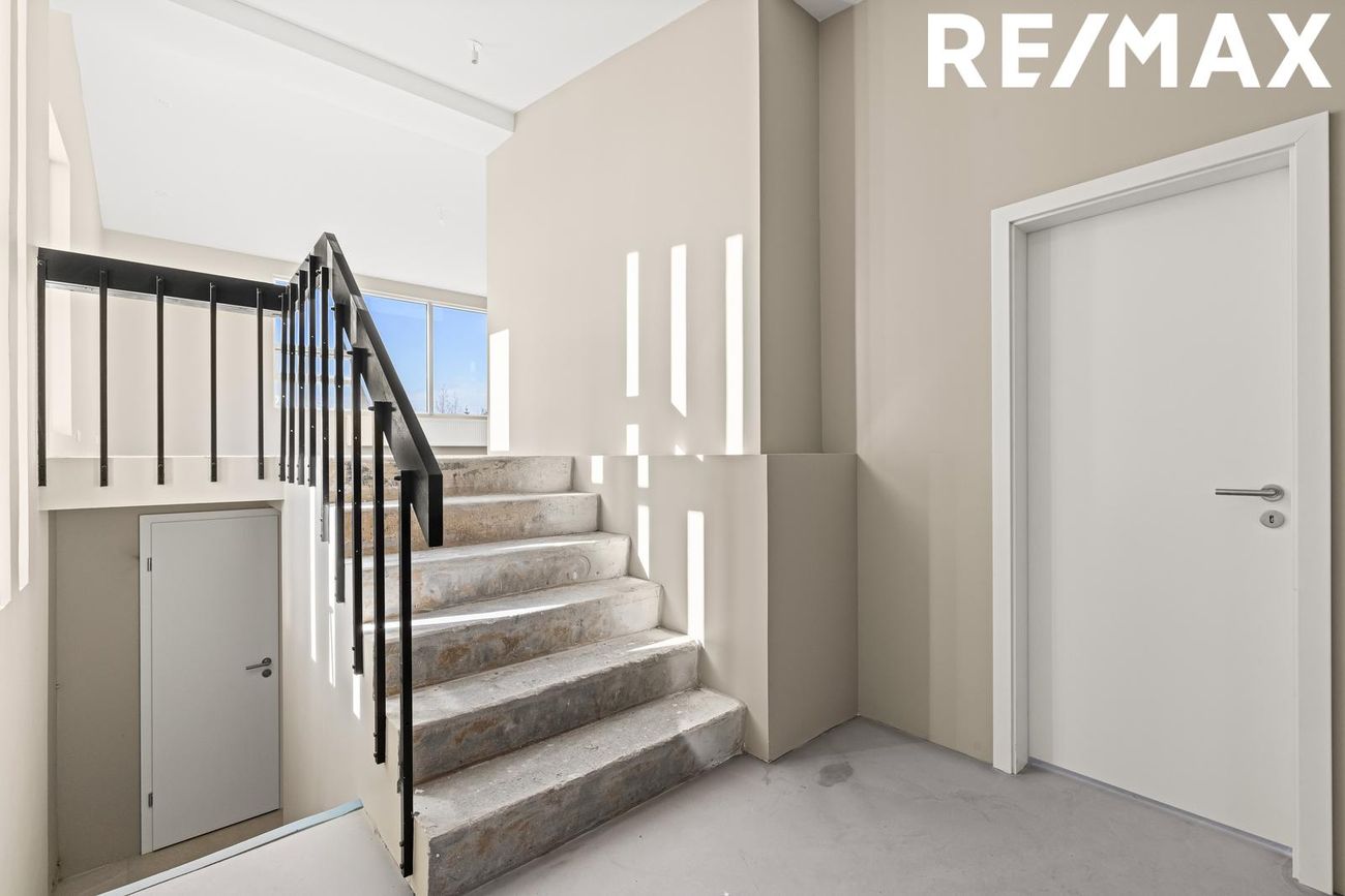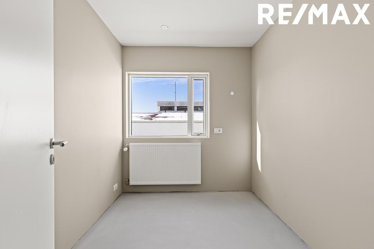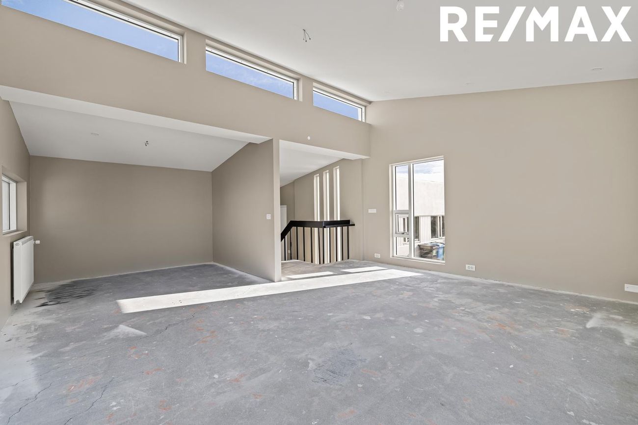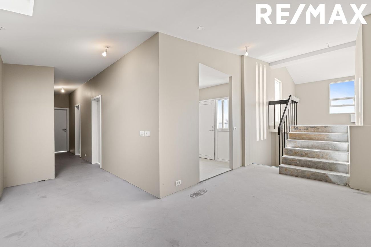 Stofa og borðstofa: Rúmgott og bjart alrými með mikilli lofthæð og stórum ál/tré gluggum sem veita mikið náttúruljós. Gólf flotuð, tilbúin fyrir gólfefni.