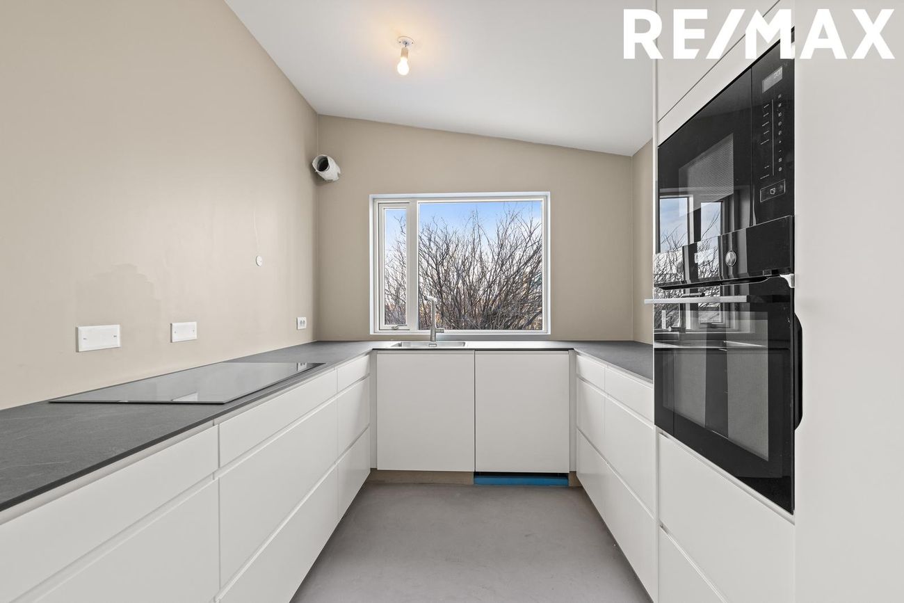 Eldhús: Ný, sérsmíðuð hvít innrétting með nýjum og vönduðum tækjum, innbyggður bakaraofn í vinnuhæð frá AEG. Nýtt spanhelluborð frá AEG. Nýr vaskur og Grohe blöndunartæki. Uppþvottavél frá AEG og gert ráð fyrir innbyggðum ísskáp.