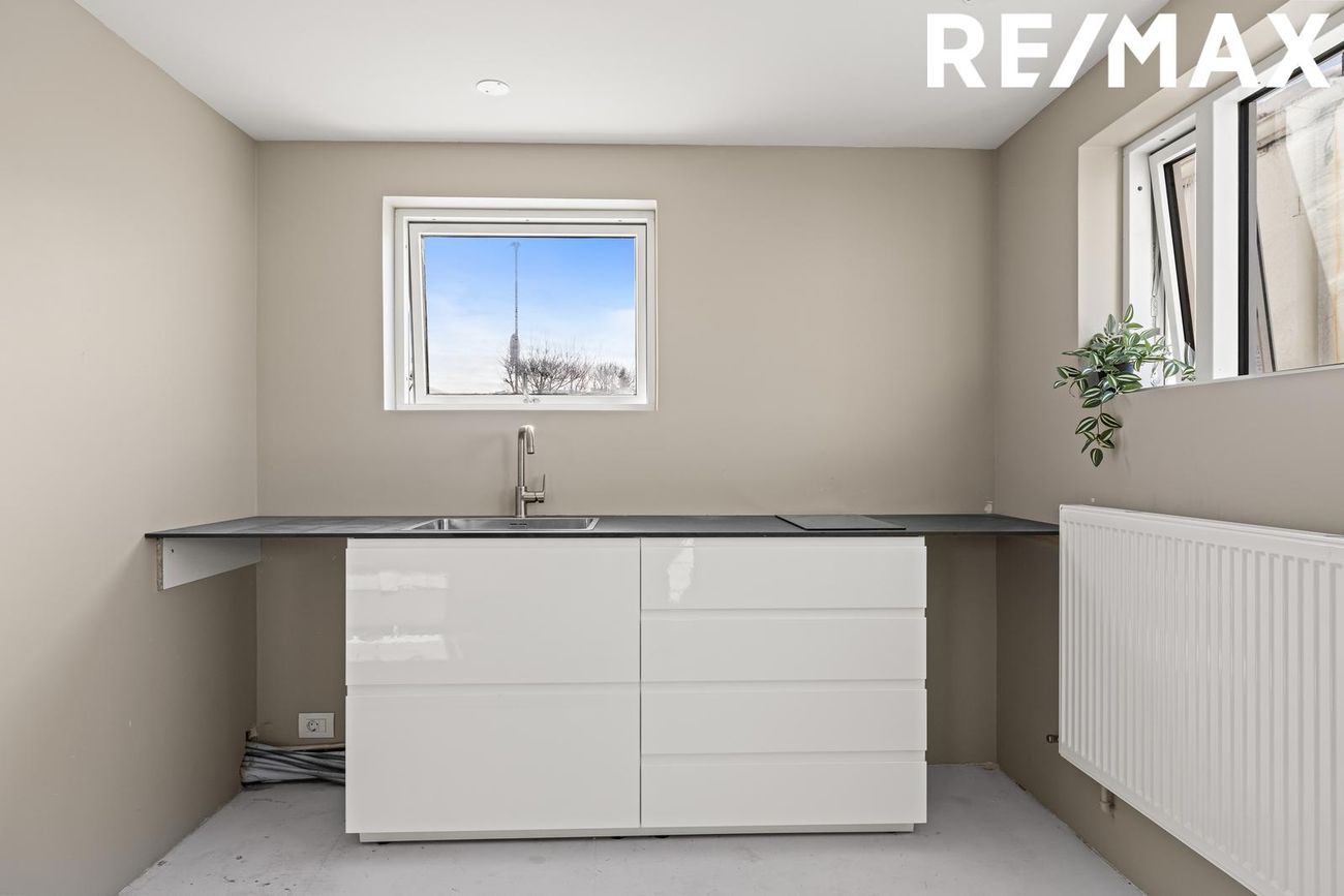 Neðri hæð: Mjög lítið mál að útbúa aukaíbúð á neðri hæð með sér inngangi.Stúdíoíbúð: Stórt herbergi á neðri hæð með nýrri eldhúsinnréttingu, helluborði og vaski. Sérinngangur og hægt að útbúa auka íbúð, í dag er opið á milli.