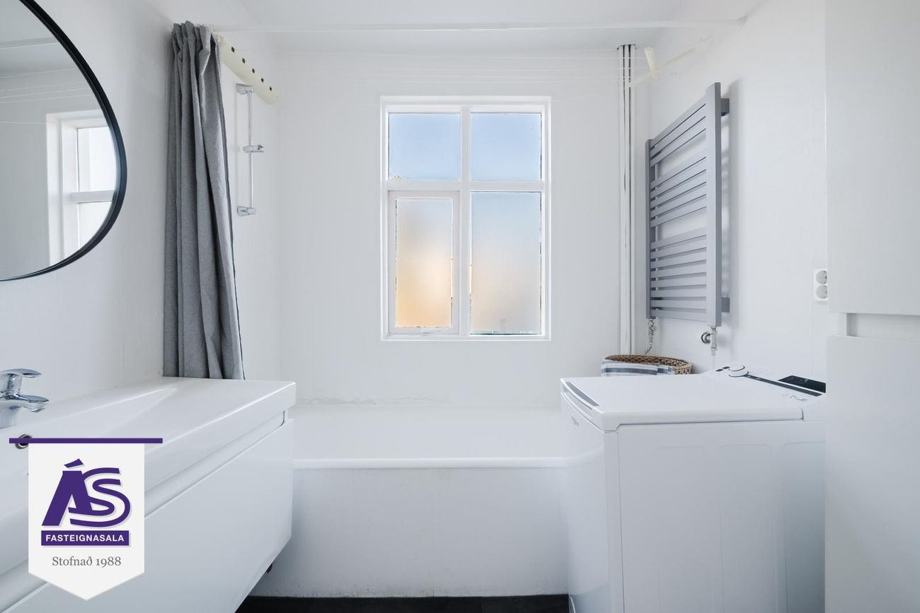 Baðherbergi með opnanlegum glugga, baðkar og vaskinnrétting. Þvottaaðstaða er á baðinu.