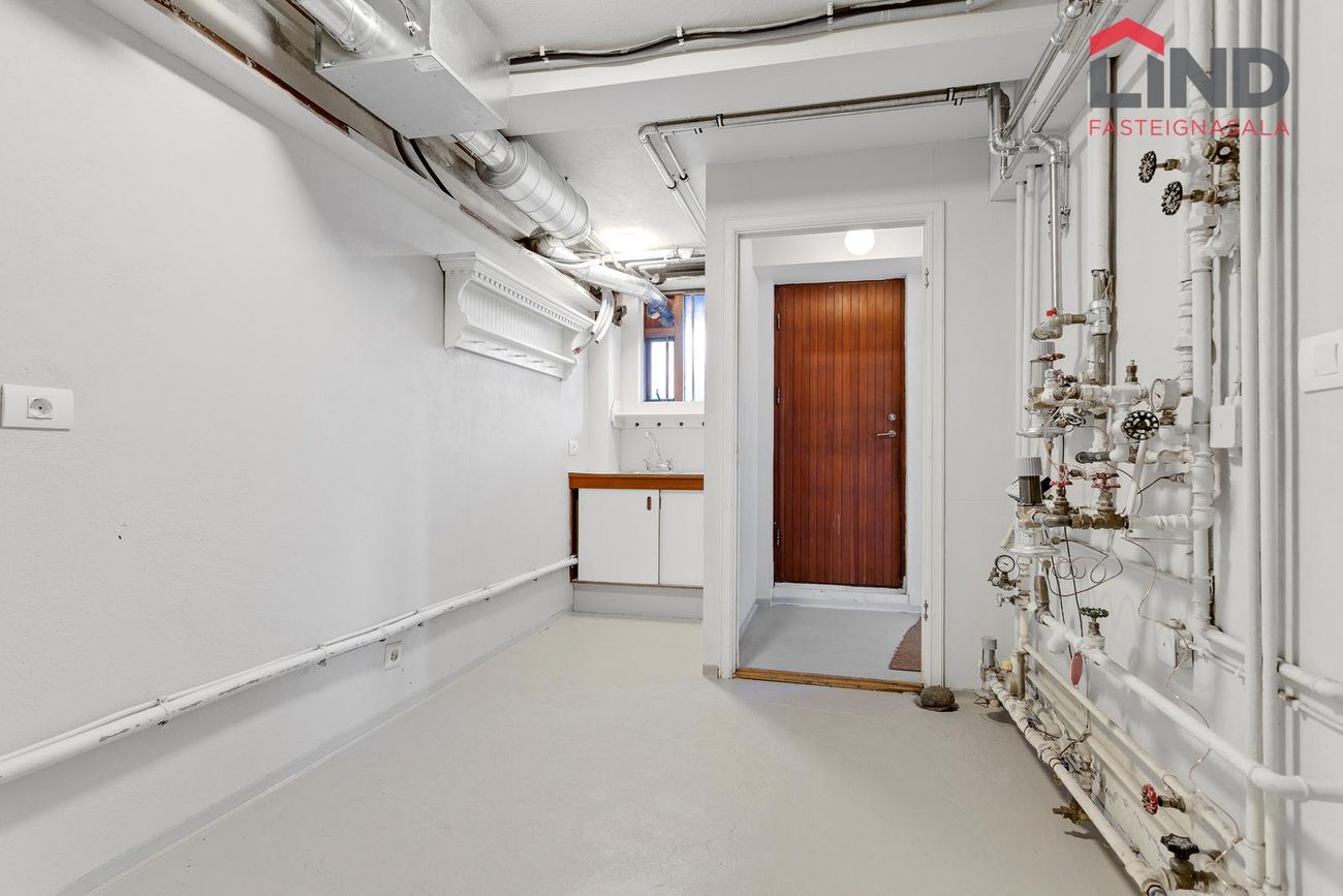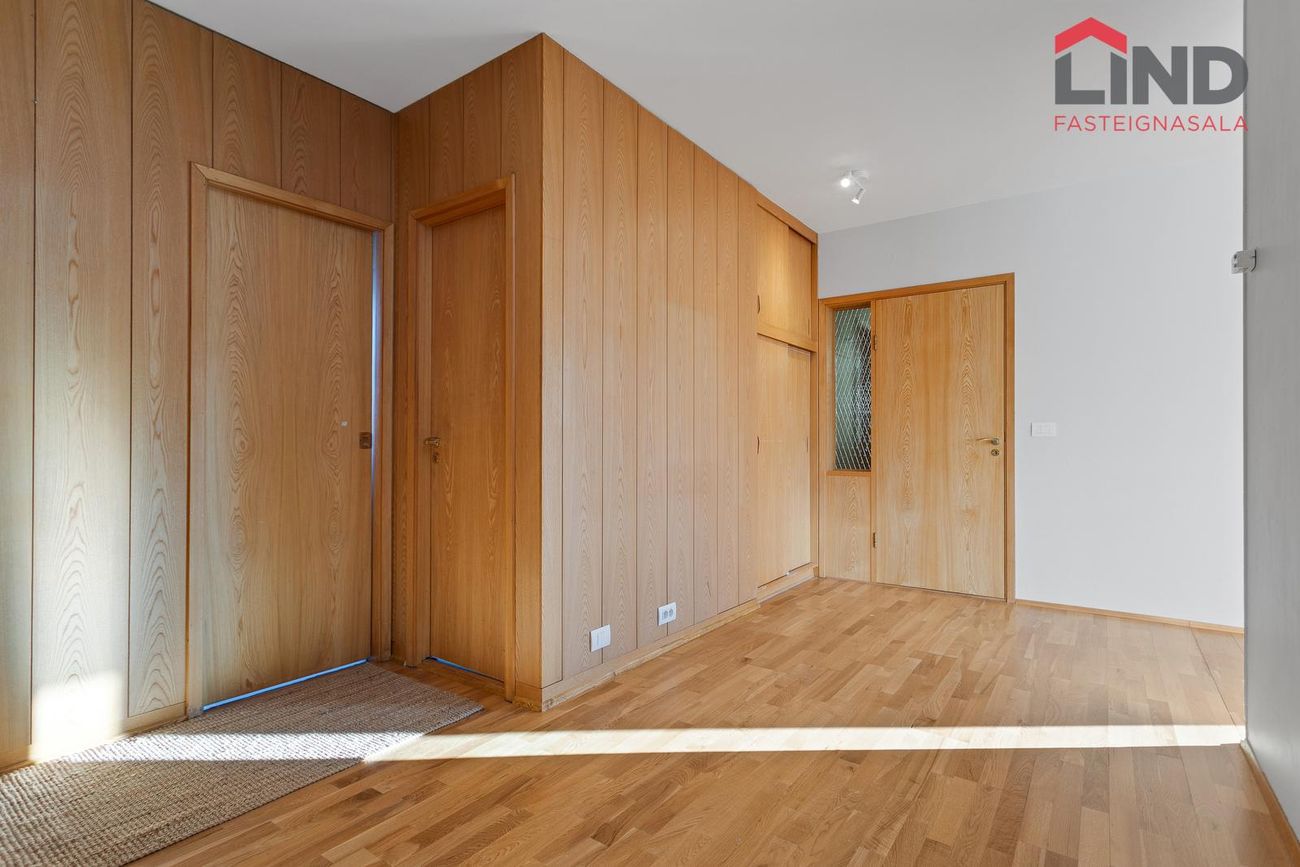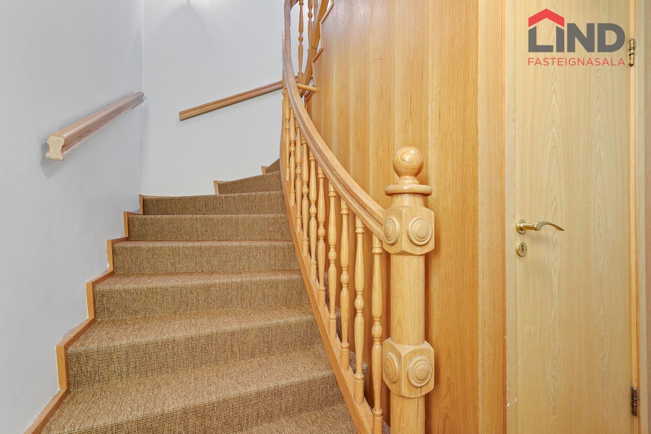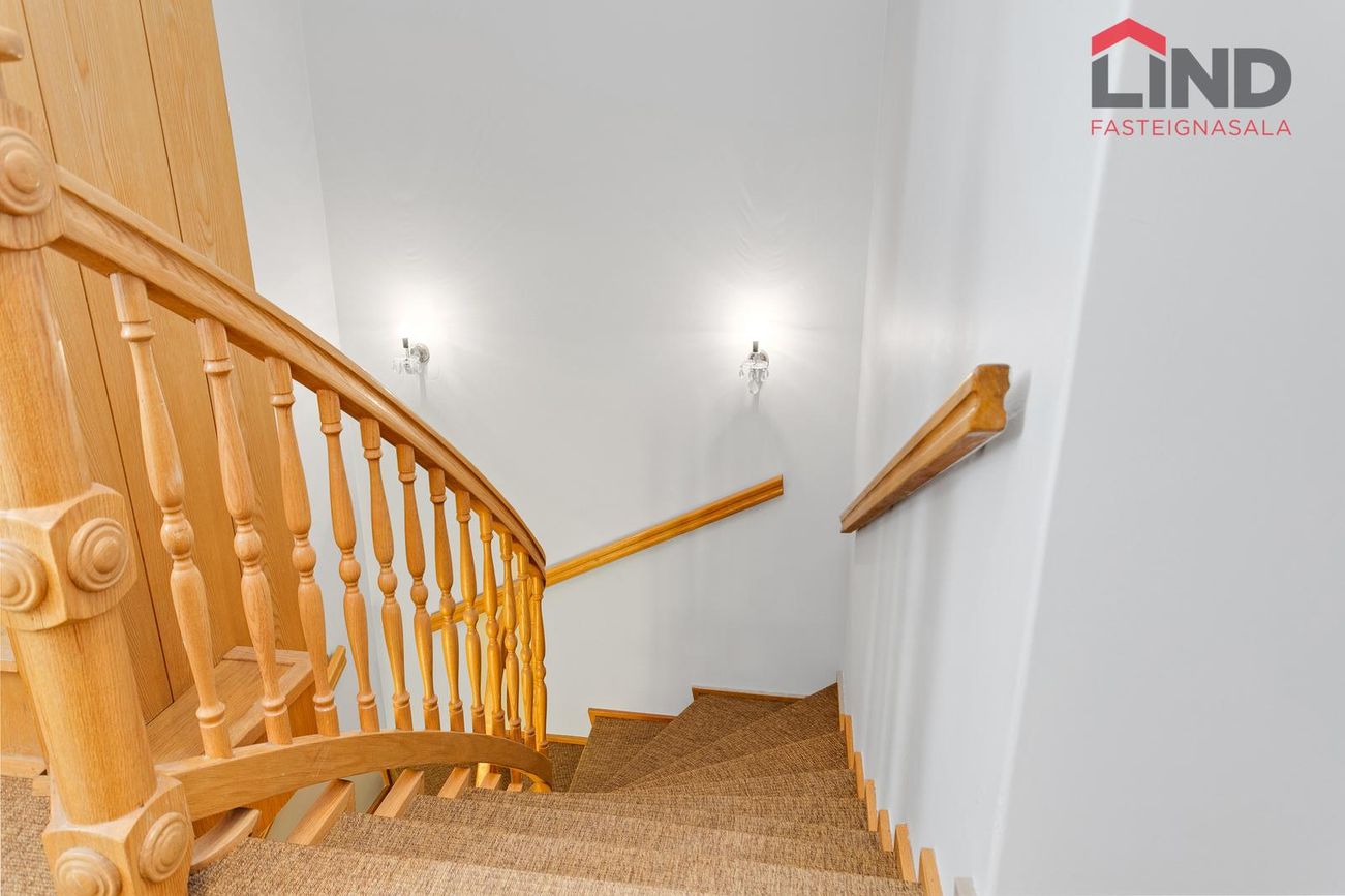 Nánari lýsing. Fjögur rúmgóð svefnherbergi (möguleiki að loka af 5. Svefnherberginu), tvö baðherbergi og eitt gestasalerni, stofa, möguleiki á sjónvarpsstofu. Sérinngangur á austurgafli hússins þar sem gengið er bæði upp á hæð og niður í kjallara. Stigapallur: Rúmgott herbergi, gestasnyrting og útgengi á austur svalir. Hol: Rúmgott, parketlagt hol þaðan sem gengt er í önnur rými íbúðar. Stofa: Bjart, parketlagt rými. Skv. teikningu er gert ráð fyrir stofu og borðstofu í opnu rými en borðstofan hefur verið stúkuð af sem herbergi. Eldhús: Hvít innrétting, borðkrókur og gluggi. Baðherbergi: Flísalagt baðherbergi með baðkari. Herbergi: Innan íbúðar eru samtals 4 svefnherbergi, öll rúmgóð Þvottahús: Innan íbúðar. Kjallari: Sérinngangur í kjallara Kjallarinn er samtals 61,6 fm og skiptist í stórt herbergi, baðherbergi þvottahús og geymslur/sjónvarpsrými. Allar upplýsingar veitir: Hannes Steindórsson hannes@fastlind.is