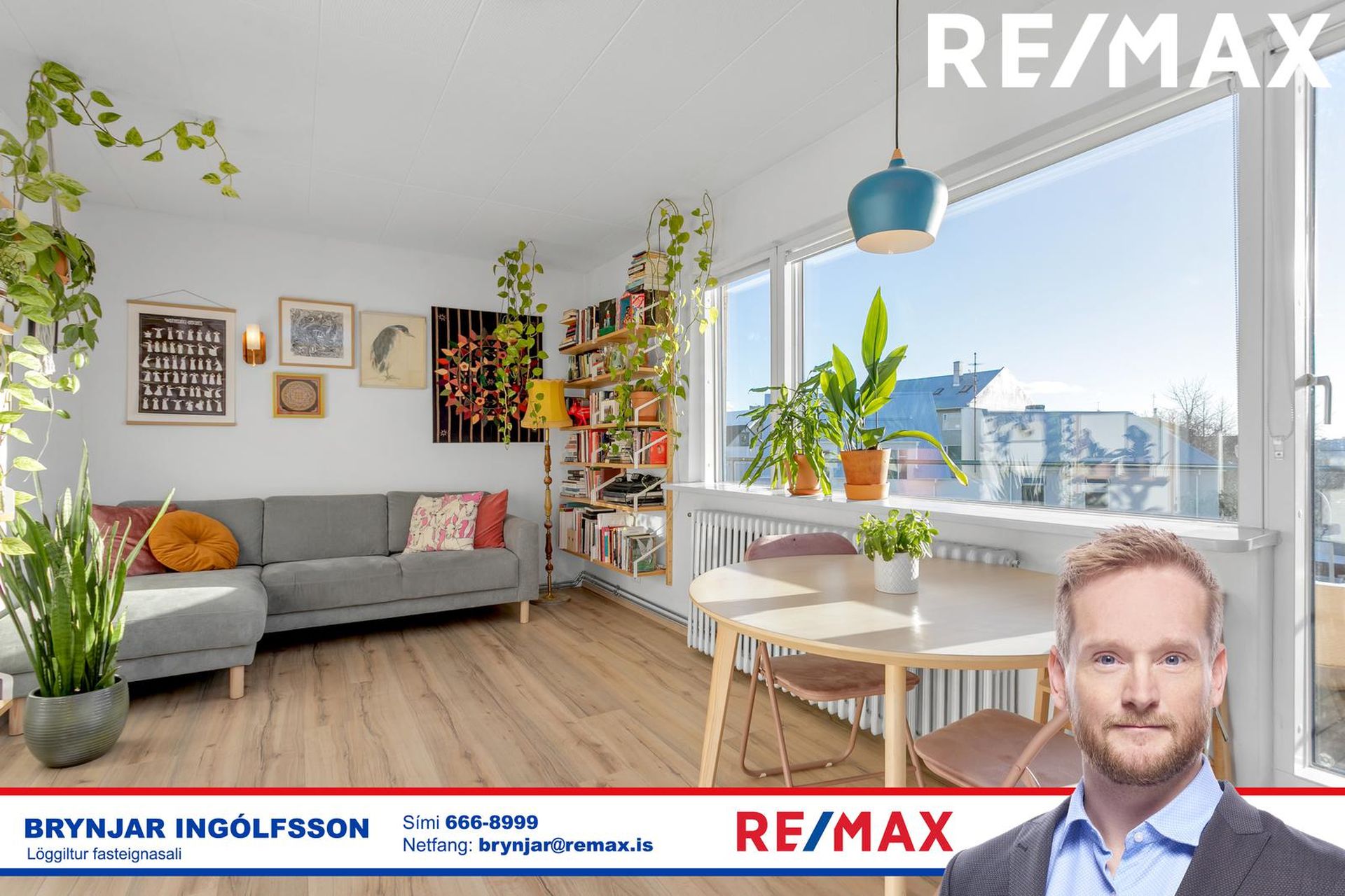 Stofa er saman í opnu, björtu rými með útsýni og er útgengt út á ágætis svalir.