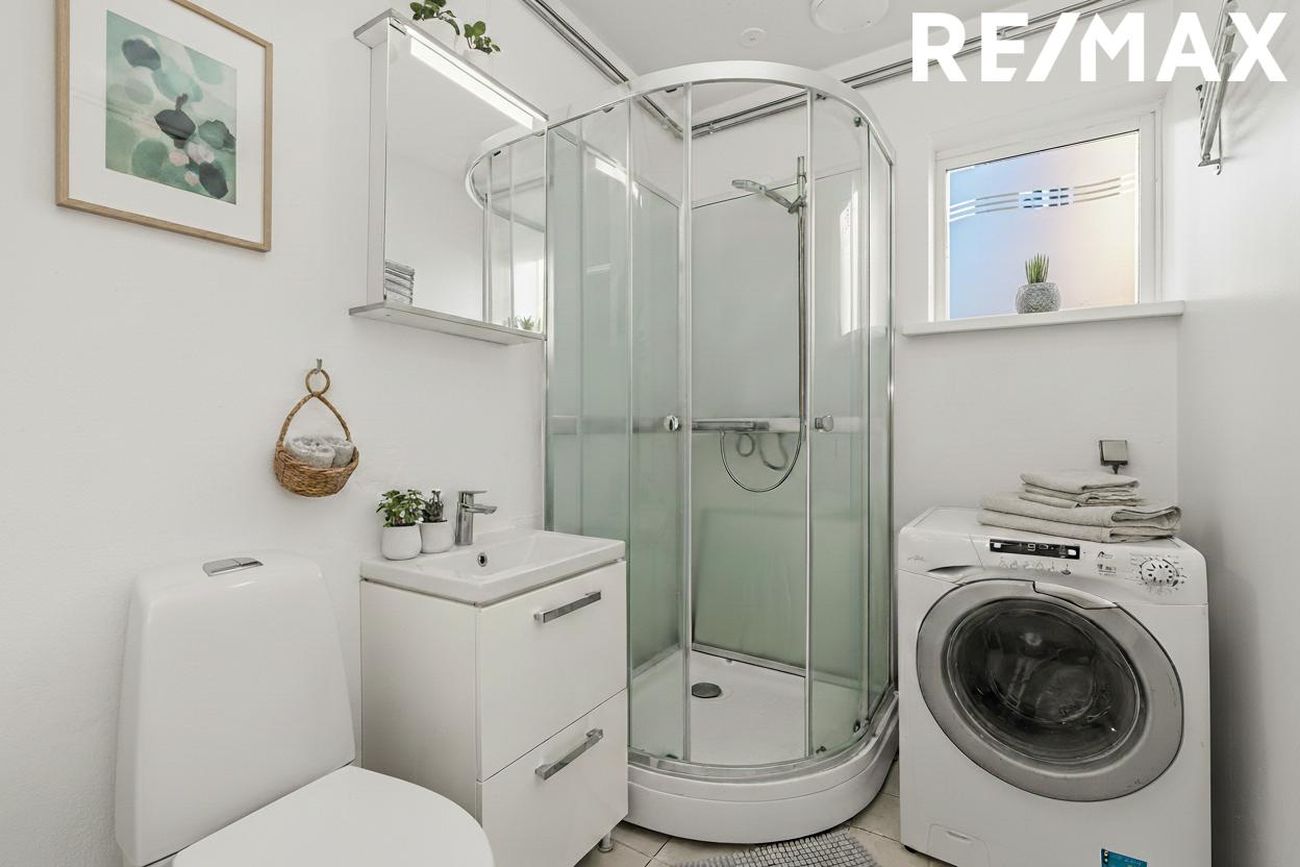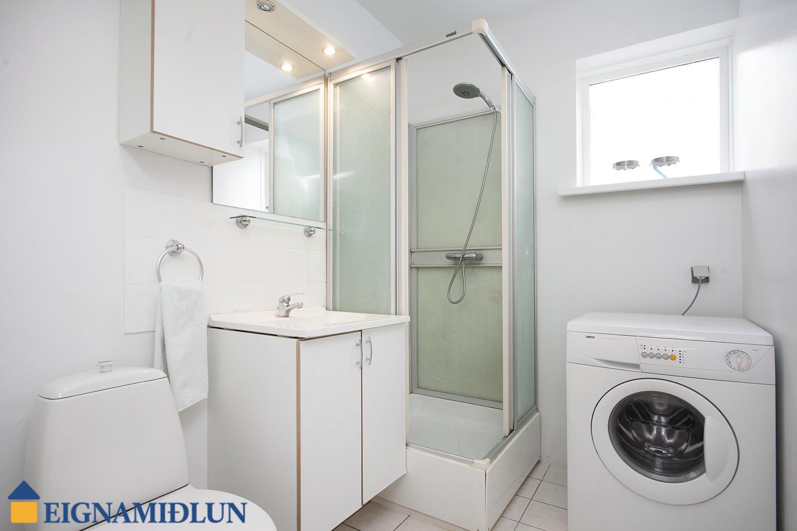Baðherbergið með flísar á gólfi, nettur hvítur vaskaskápur, sturtuklefa, tengi fyrir þvottavél og glugga með opnanlegu fagi.