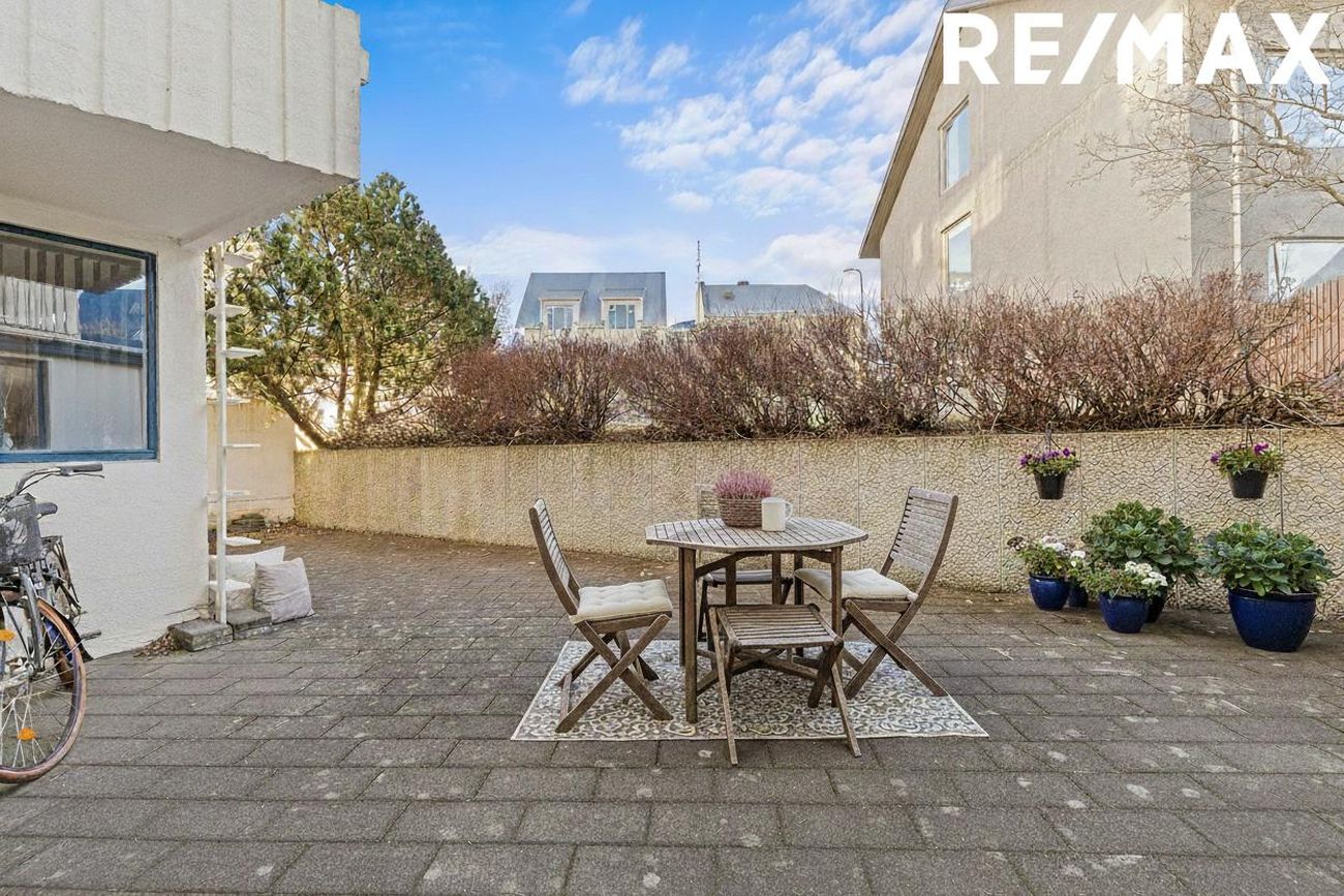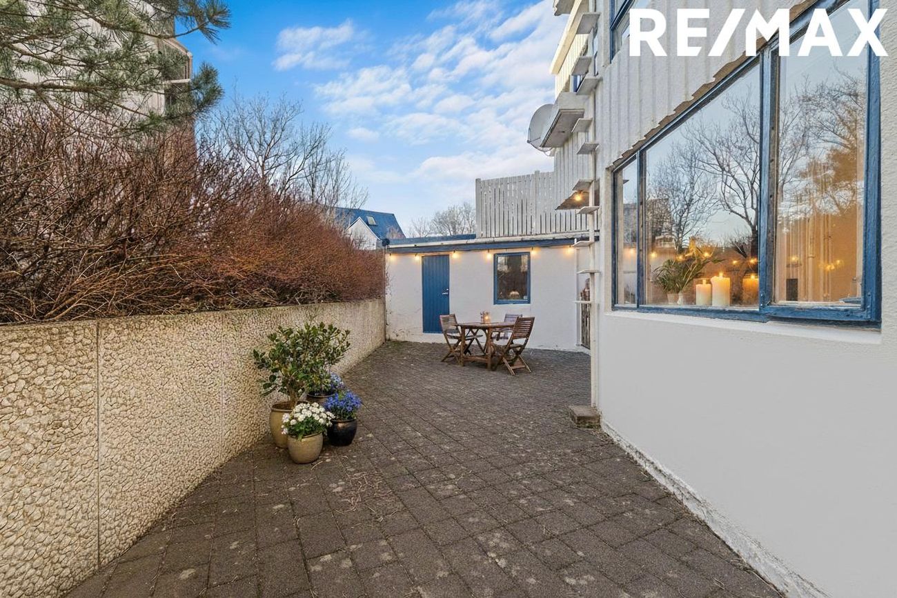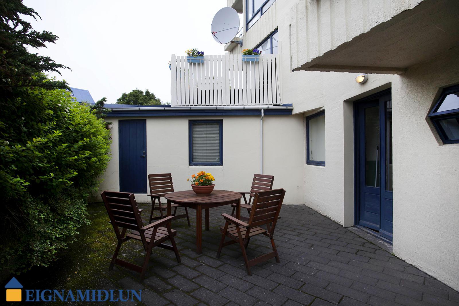 Hellulagður, skjólgóður sameiginlegur garður með steyptum veggjum er að bakatil og innangengur úr sameign.