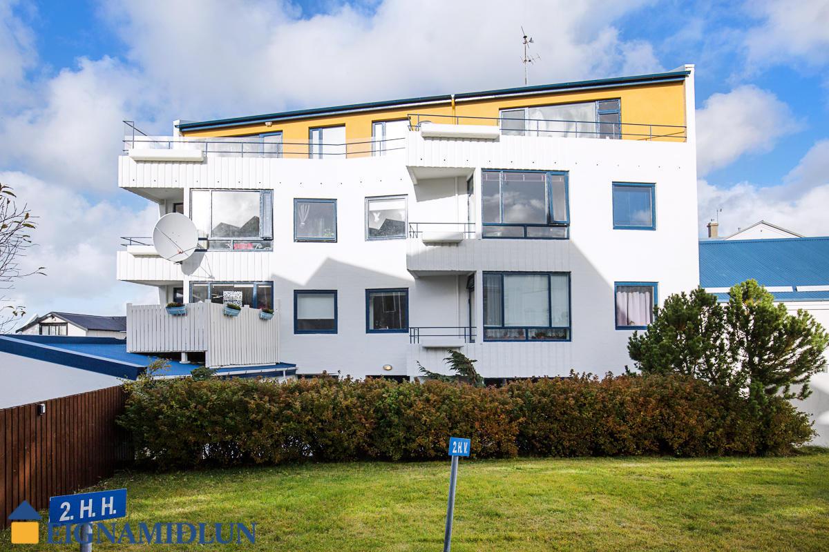 Sameignin er snyrtileg og nýlega máluð með nýlegu teppi. Sameiginlegur skjólgóður garður að bakatil.