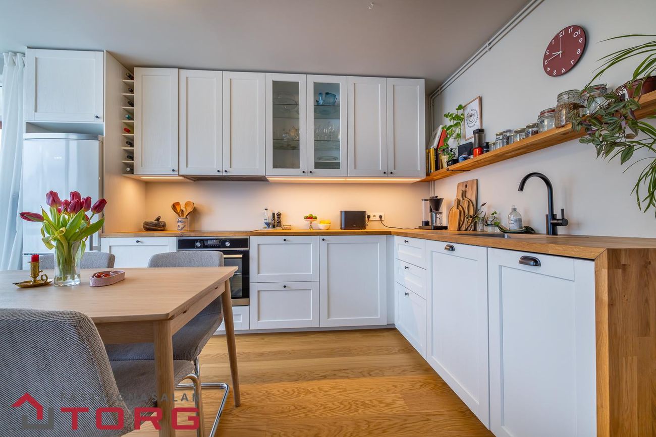 Eldhúsið er með huggulegri innréttingu með góðu skápaplássi, borðkrók og gluggum með opnanlegu fagi.