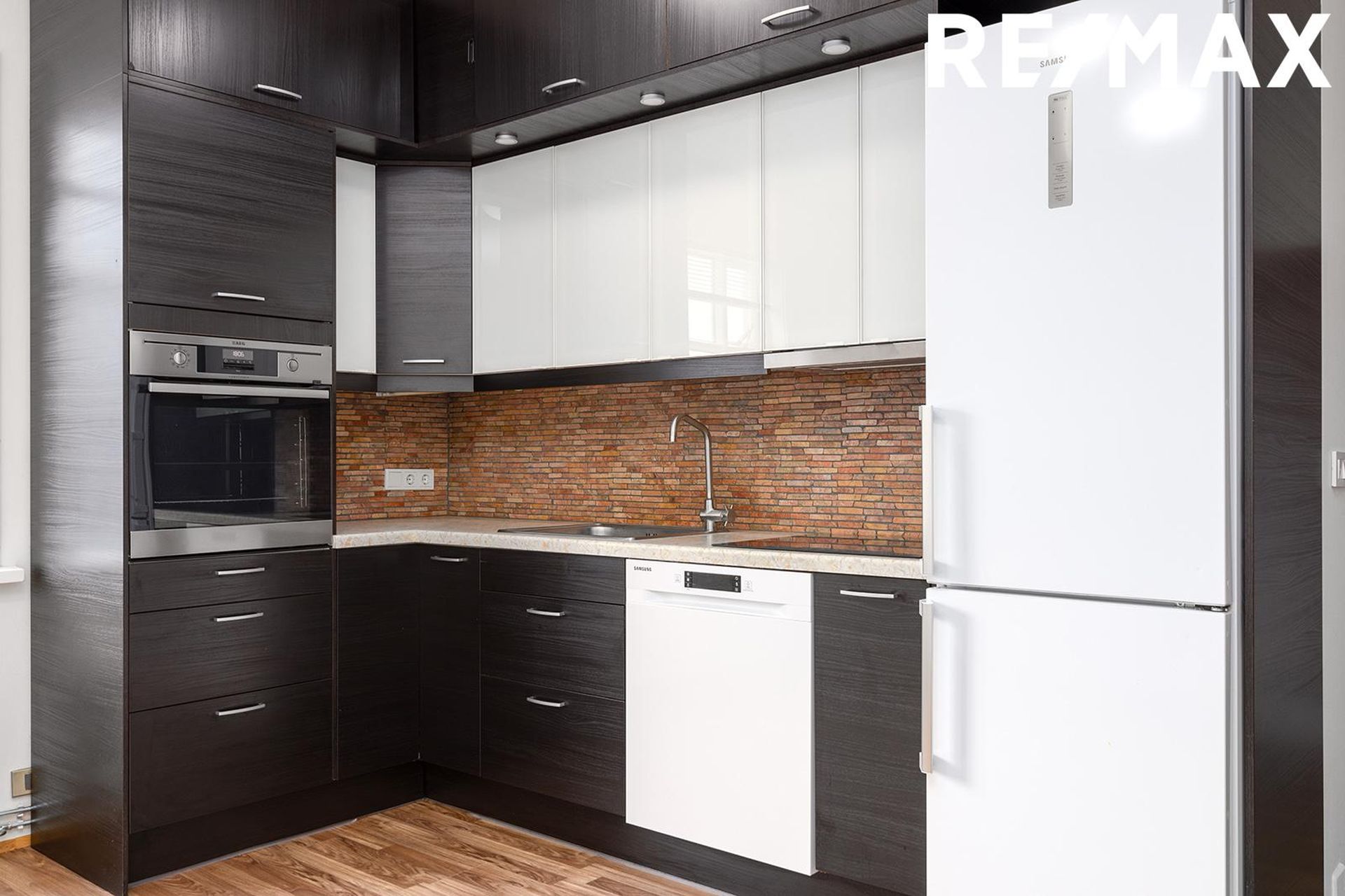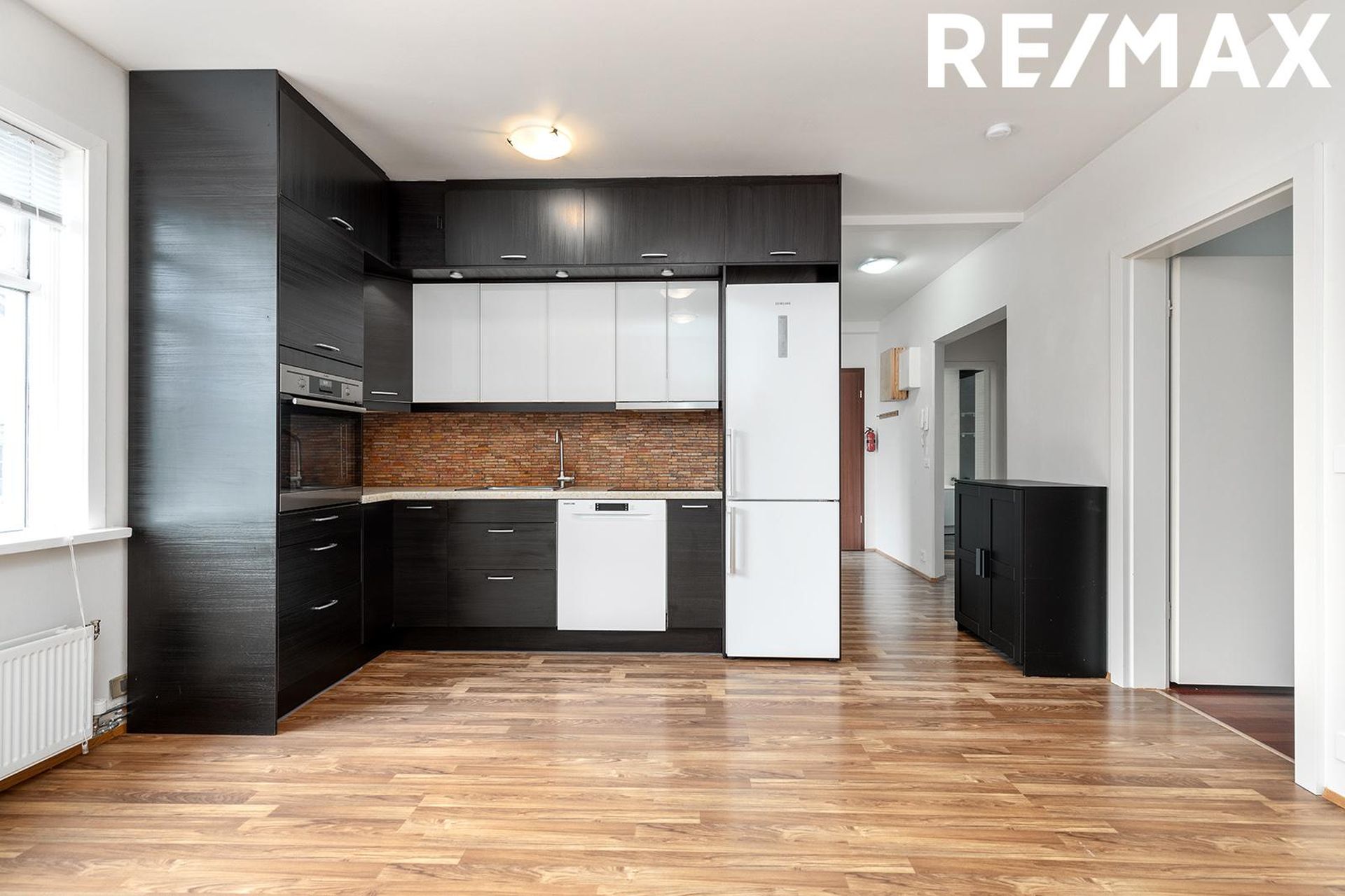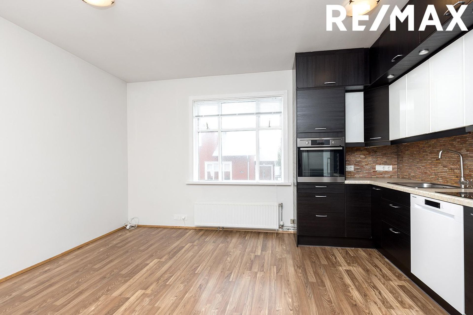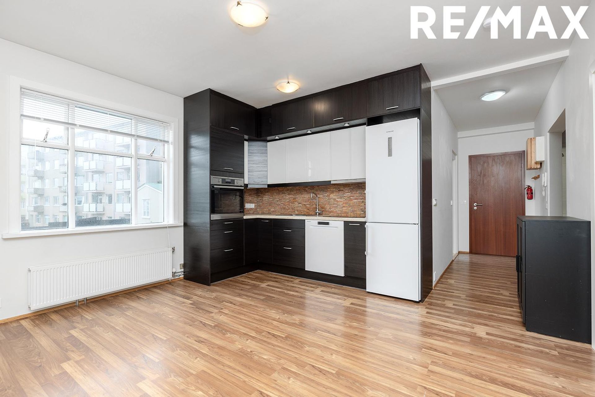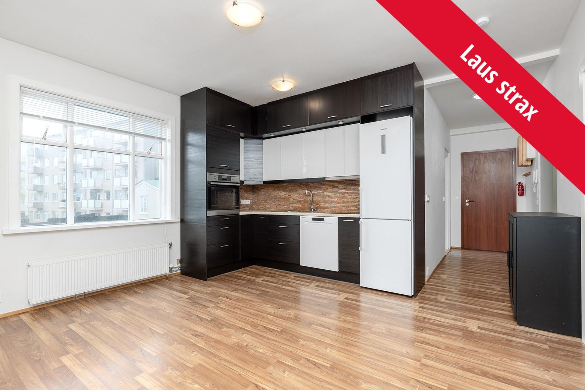 Stofan/eldhús: Bjart rými með parket á gólfi, góð lofthæð, eldhúsinnrétting með innbyggðri uppþvottavél, bökunarofn í vinnuhæð, helluborð og vifta.
