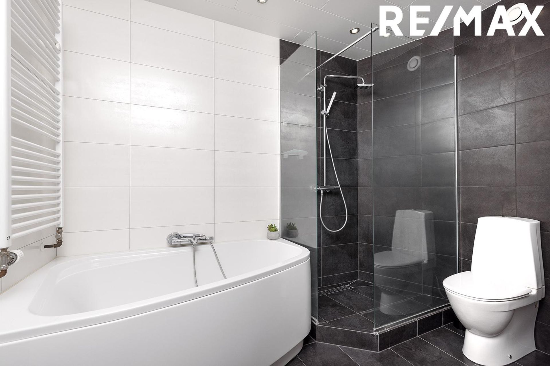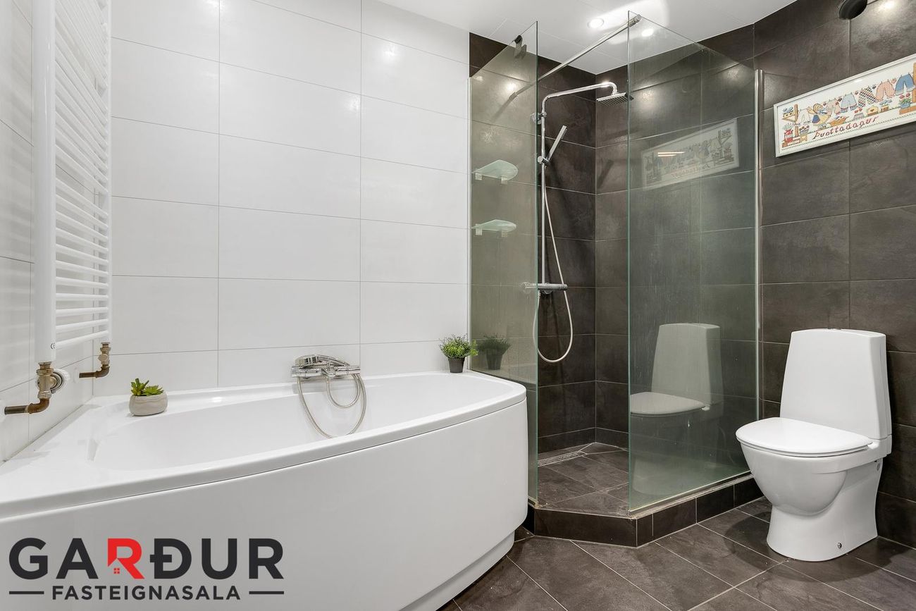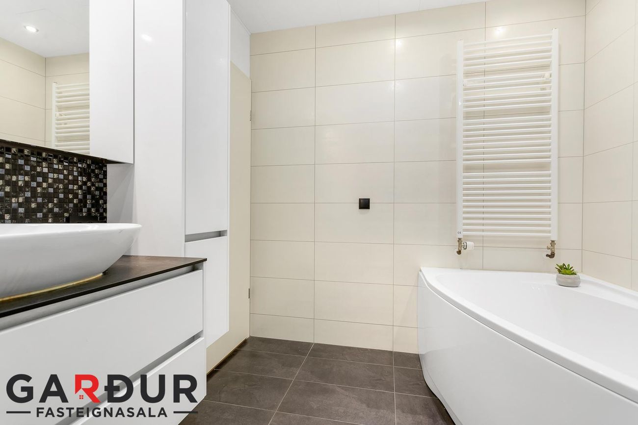 Baðherbergi: Flísalagt í hólf og gólf, innrétting með handlaug, baðkar og walk-in sturtu, handklæðaofn, og gólfhiti.