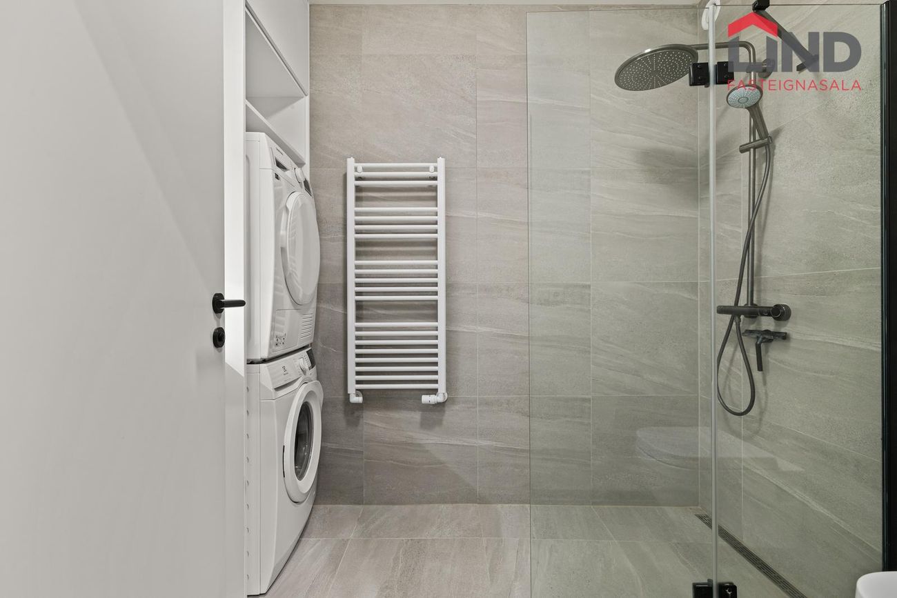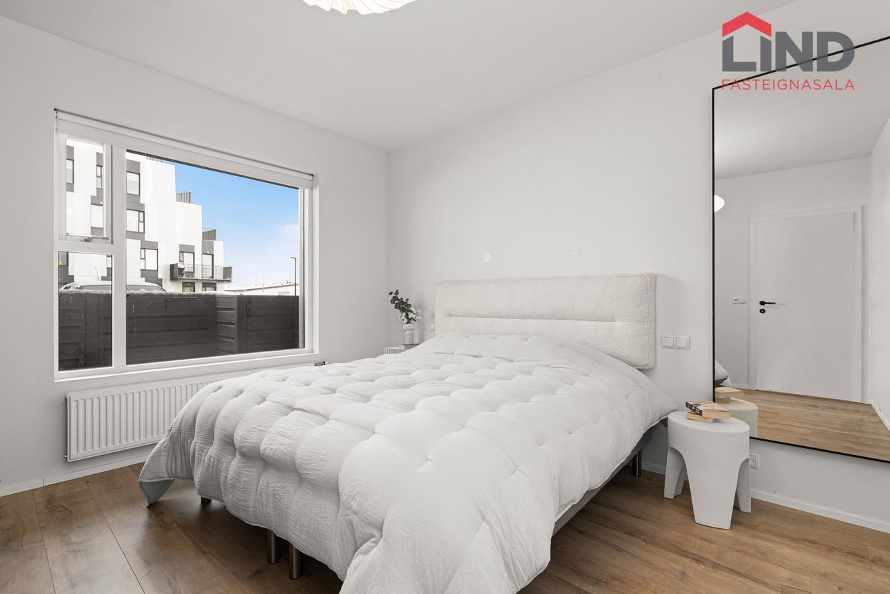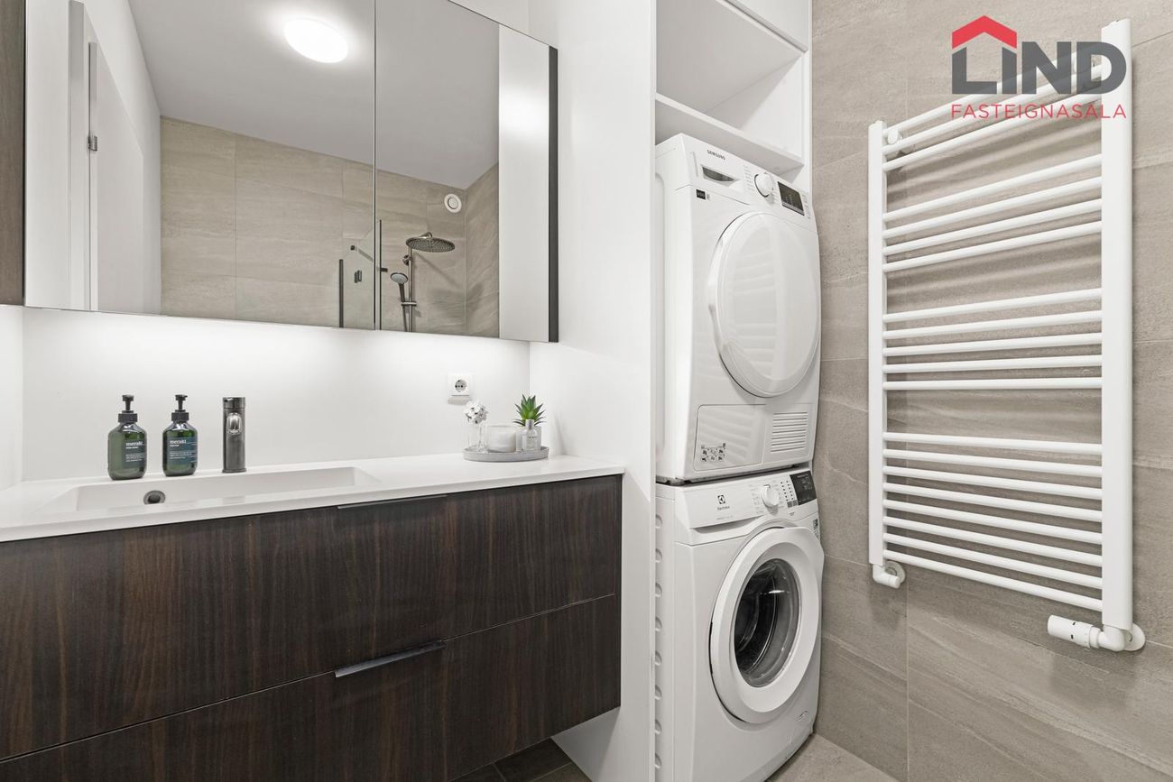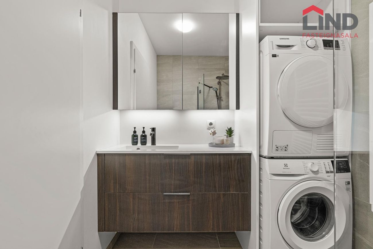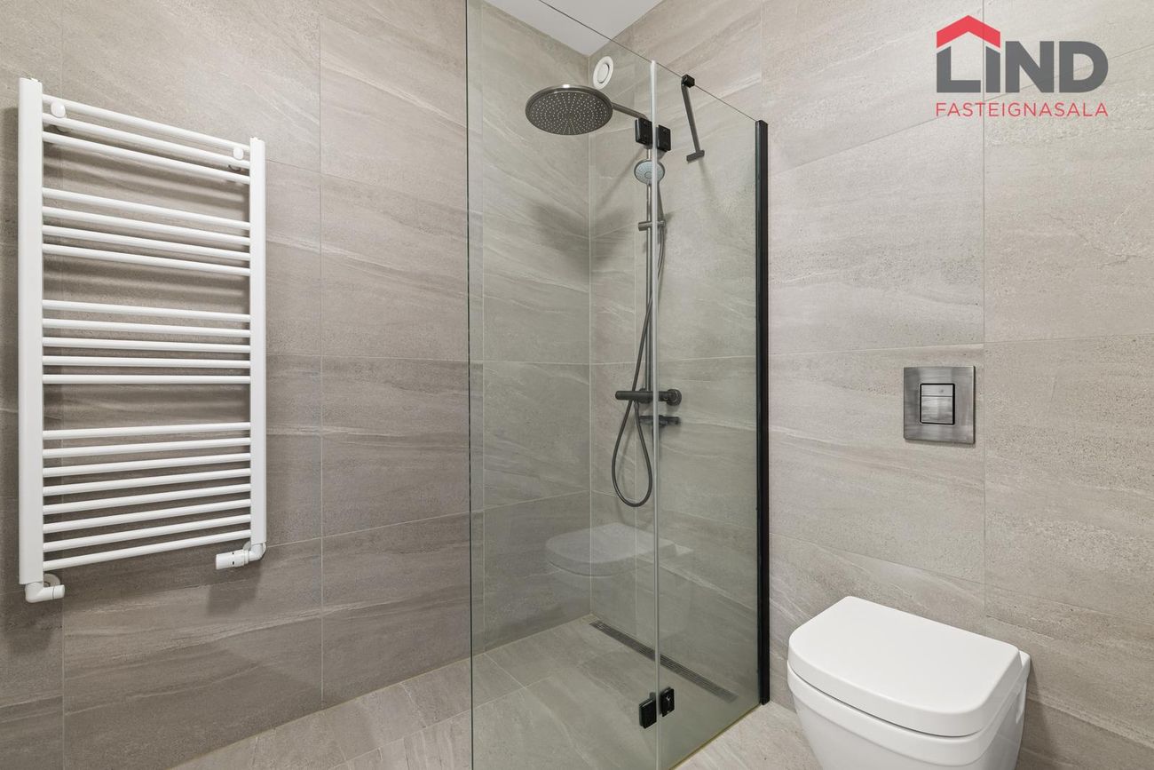 Baðherbergi: Með flísum á gólfi og hluta veggja. Flísalögð sturta með glerþili. Falleg innrétting við vask og speglaskápur fyrir ofan með lýsingu undir. Upphengt salerni, handklæðaofn og útloftun. Í innréttingu er gert ráð fyrir þvottavél og þurrkara ásamt geymslurými fyrir ofan.
