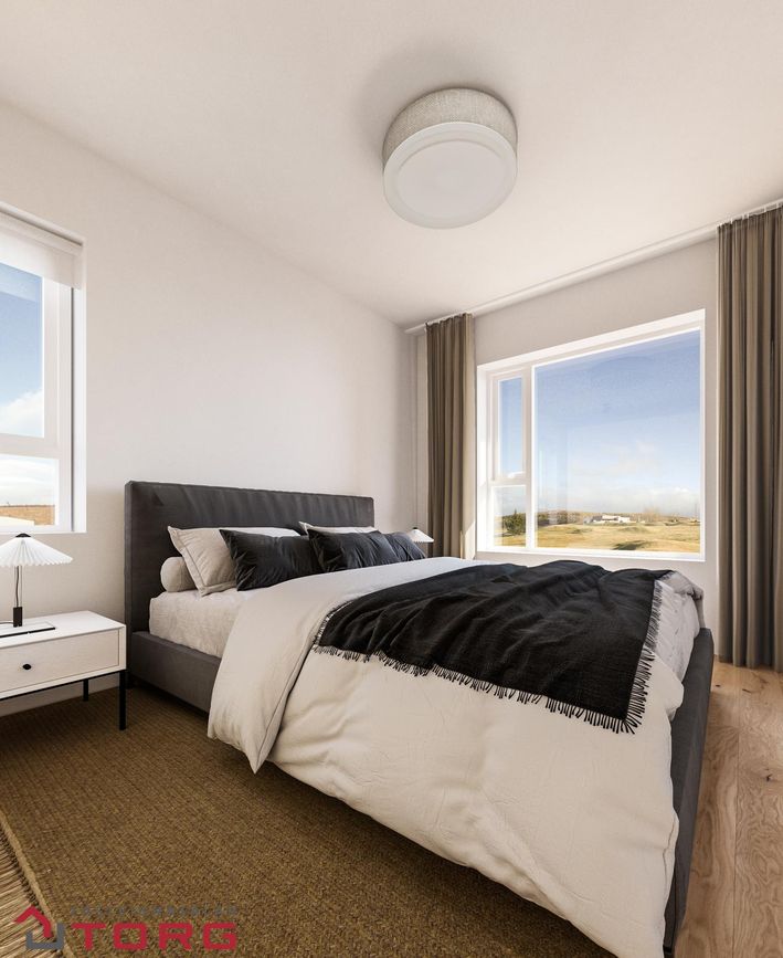 Gluggar og hurðir: Ál/tré gluggar og hurðir, hvítir að innan og koxgráir að utan.