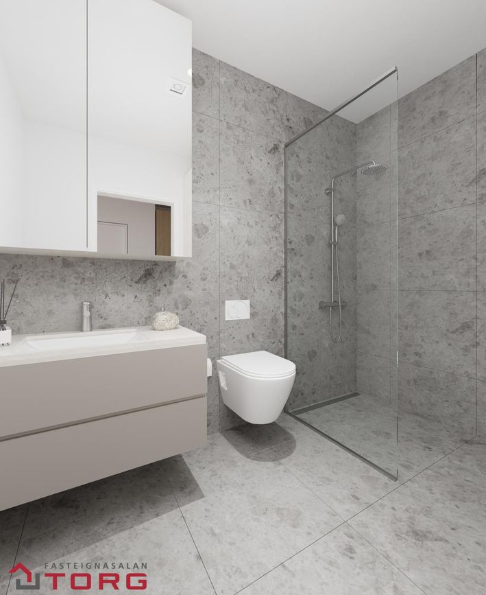 Veggir: Léttir innveggir með steinull, rakavörn í votrýmum, allir veggir sandspartlaðir og málaðir.