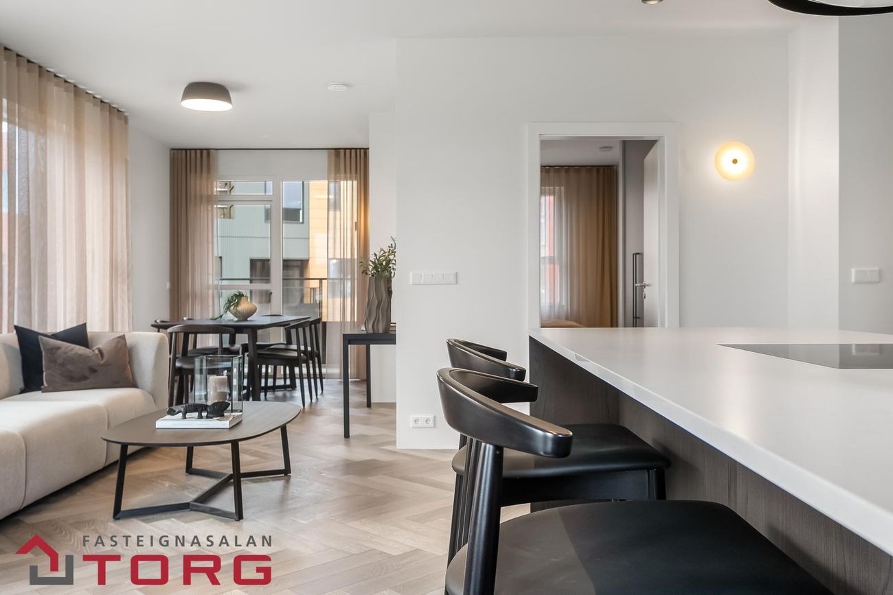 Skráð 64,6fm íbúð með anddyri, opnu alrými (eldhús og stofa) sem tengist svalum, 2 svefnherbergjum, baðherbergi, sér þvottahúsi og geymslu. Innanhúsinu er skipt með léttum innveggjum og yfirfelldum hvítum hurðum.