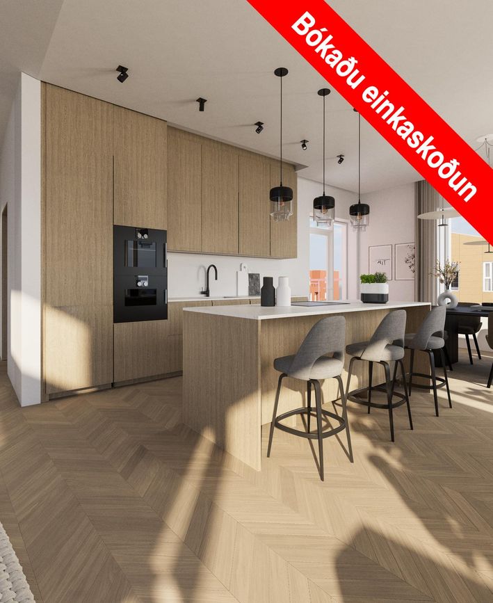 Eldhús er vel útbúið, sérsmíðaðar Voke III innréttingar, á borðplötum er kvarts steinn. Vönduð tæki eru í eldhúsi, innbyggður ísskápur og uppþvottavél. ofn í vinnuhæð. eldhús- og blöndunartæki að vandaðri gerð.