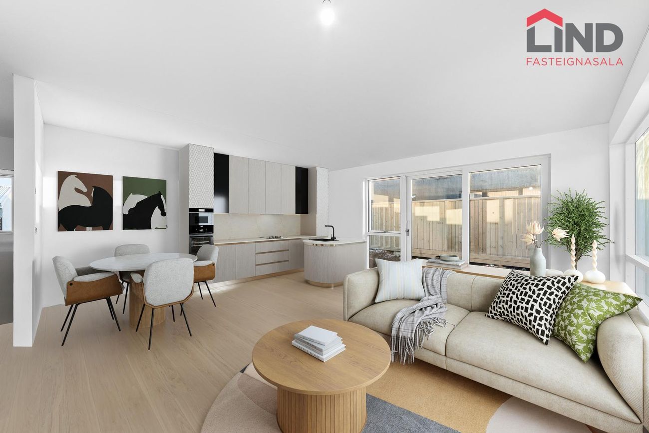 Stofa / eldhús: Stofa og eldhús eru í björtu og opnu alrými.
