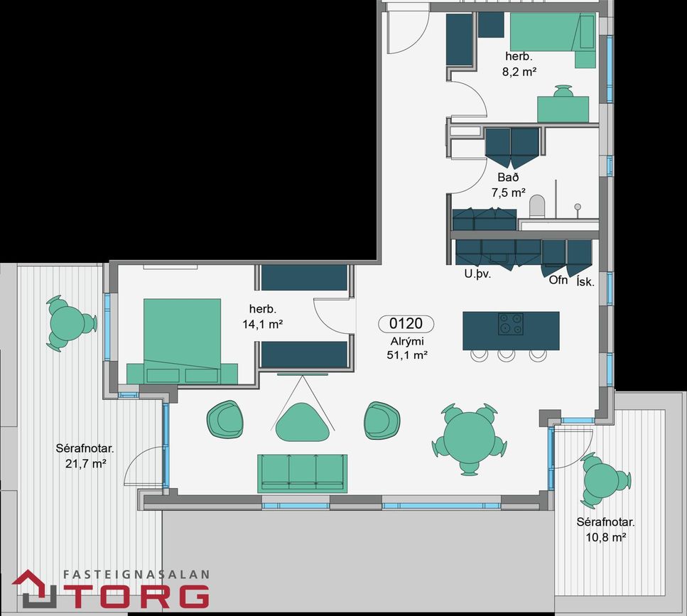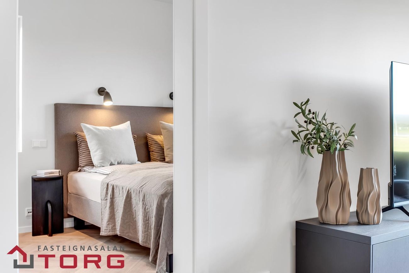 Íbúð á 1. hæð í lyftuhúsi með anddyri, opnu alrými (eldhús og stofa), 2 svefnherbergi (annað með fataherbergi), baðherbergi með þvottaaðstöðu. Hærri stöðlun í efnisvali og hönnun.