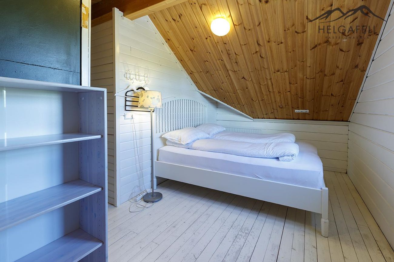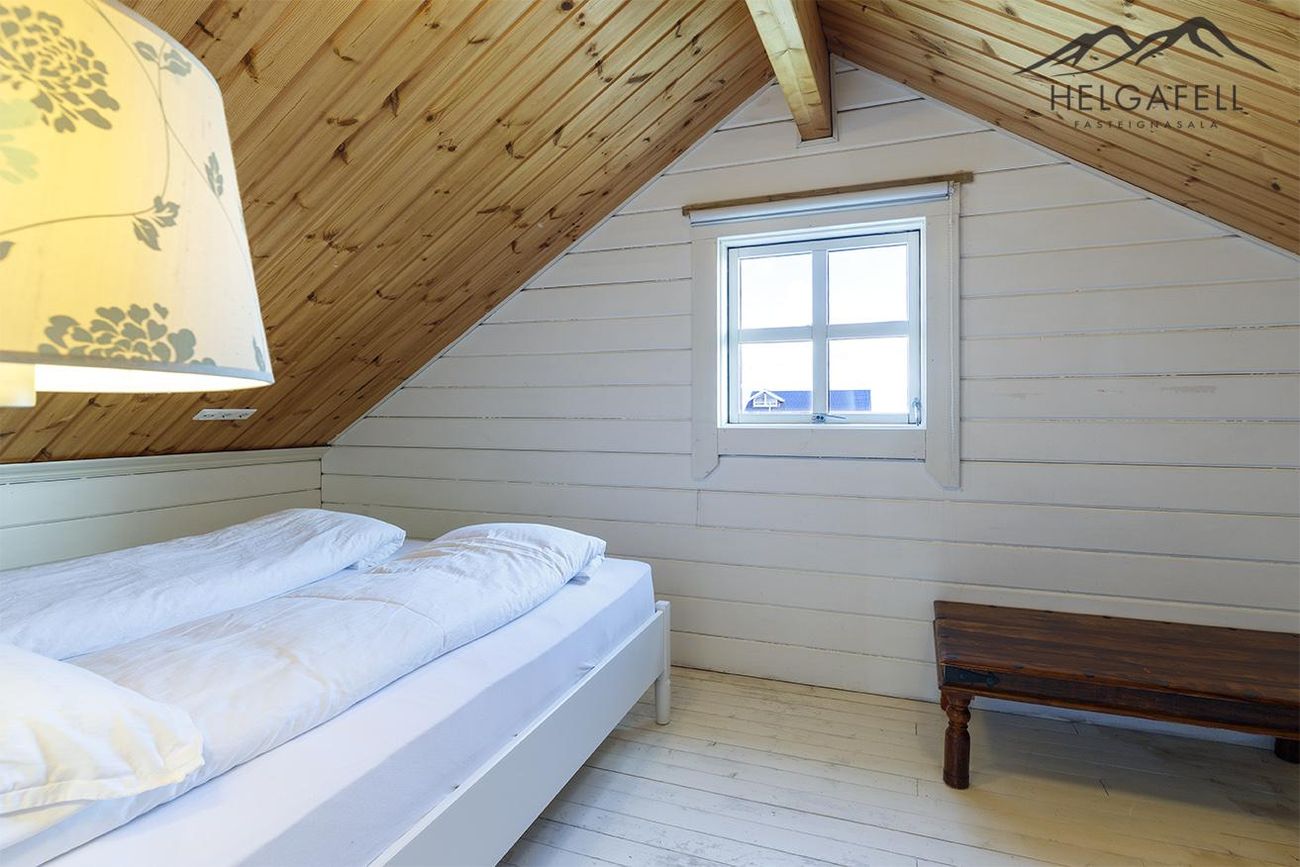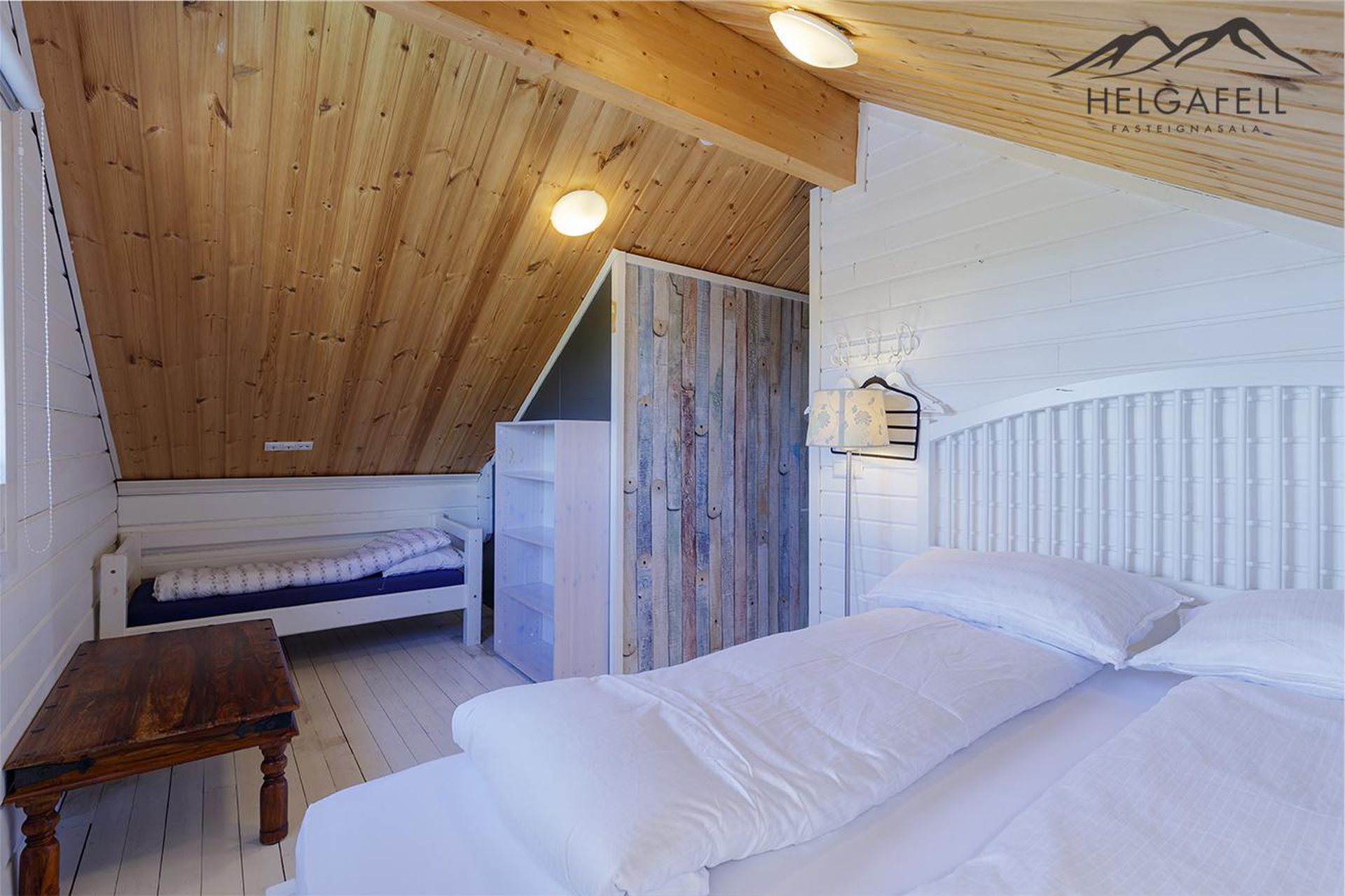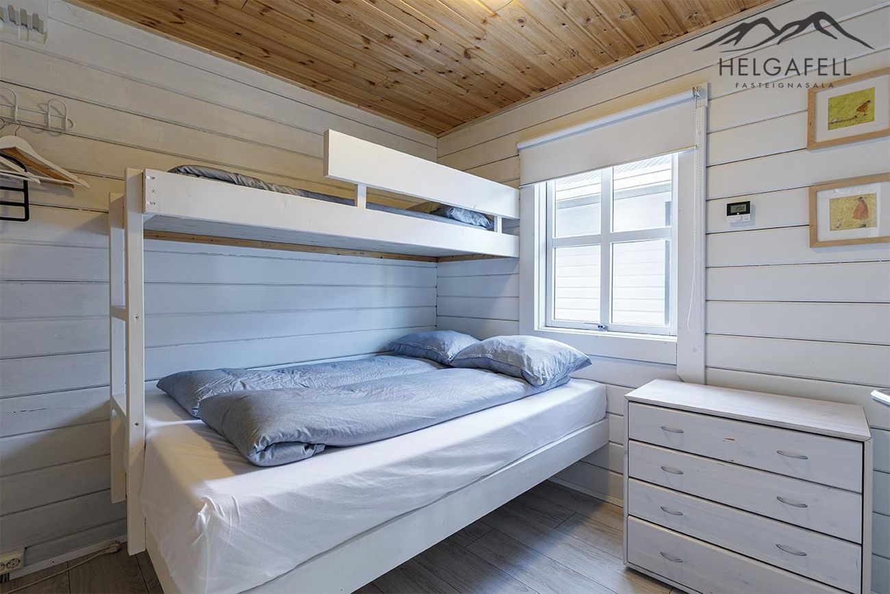 Svefnherbergi 2: Timburgólf. Í dag er hjónarúm ásamt barnarúmi í þessu herbergi.