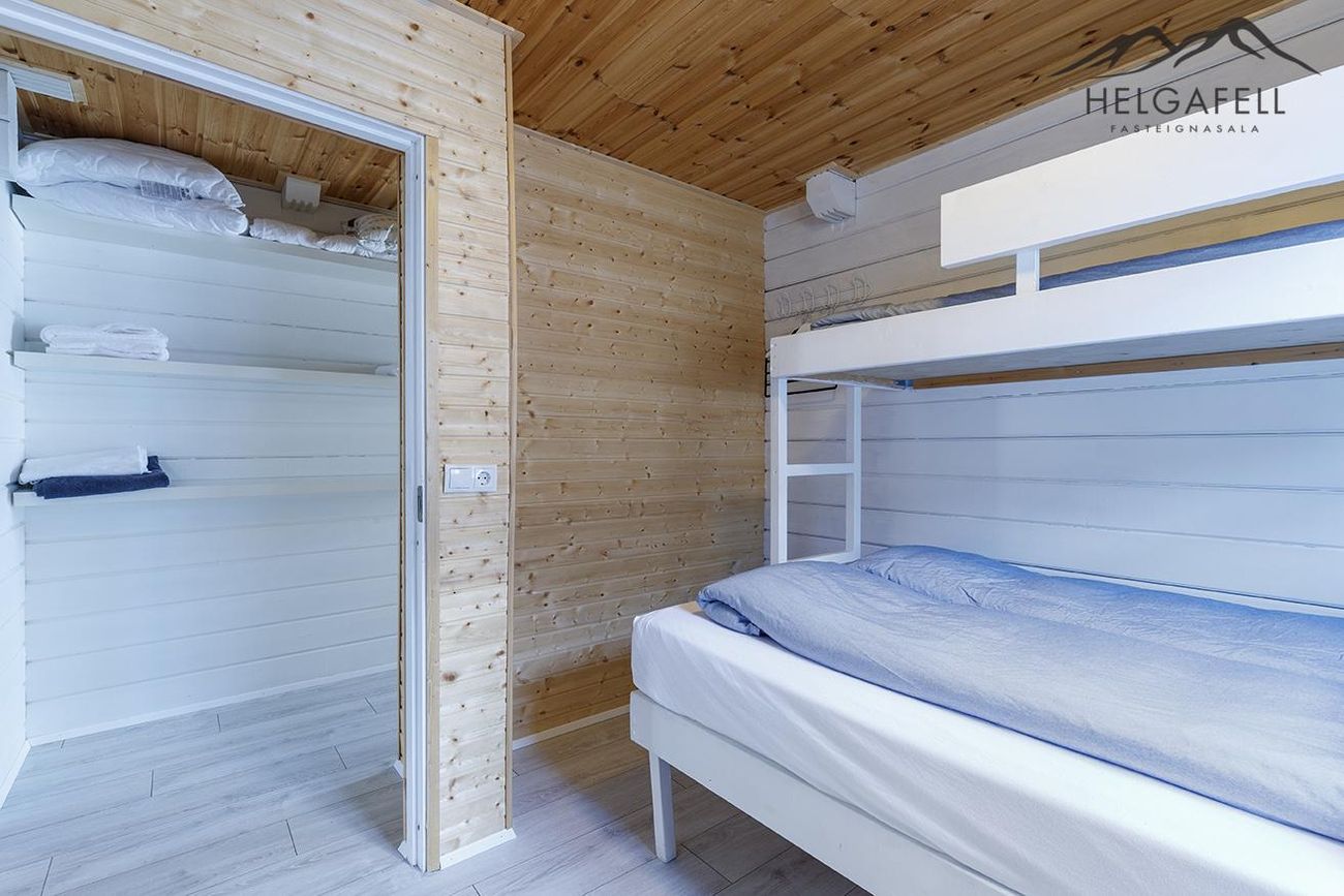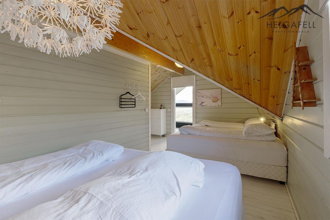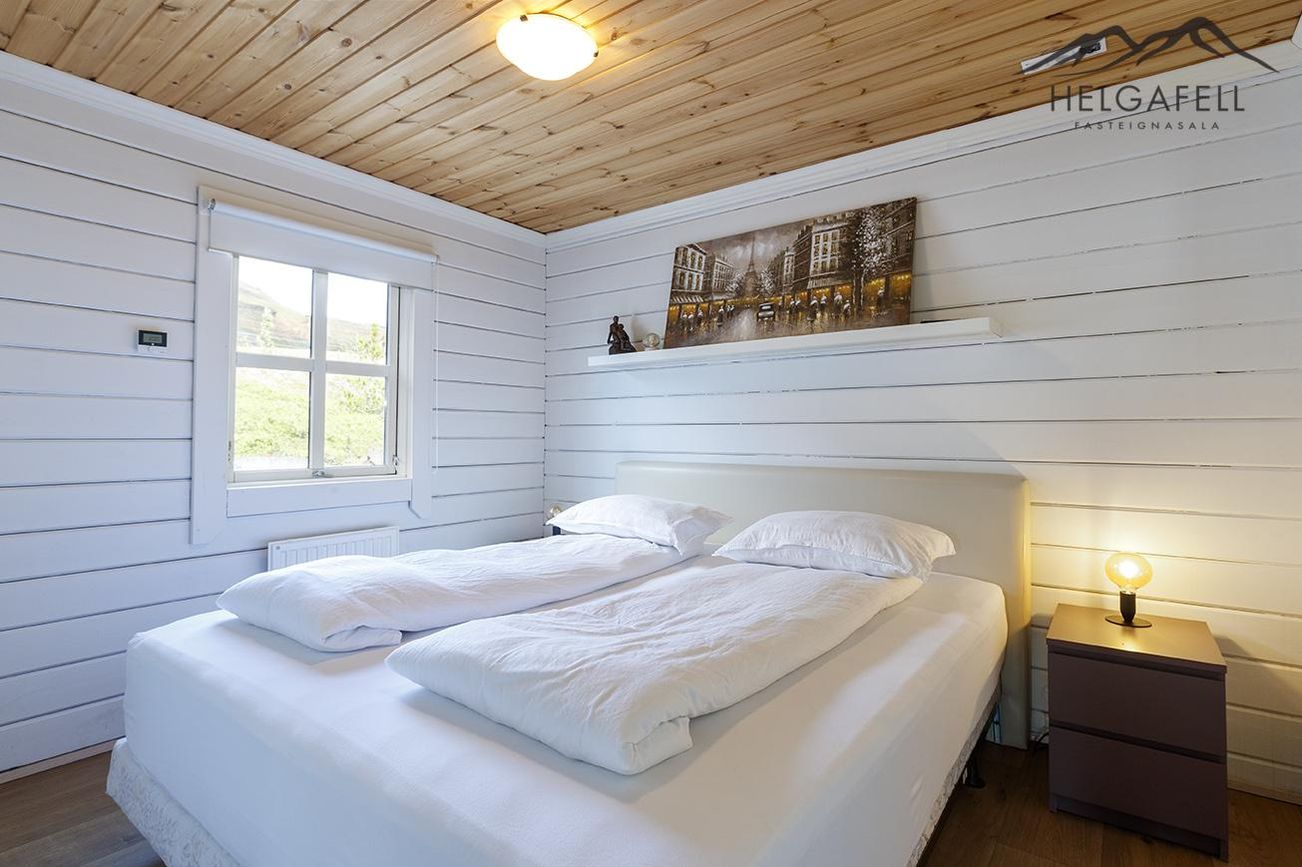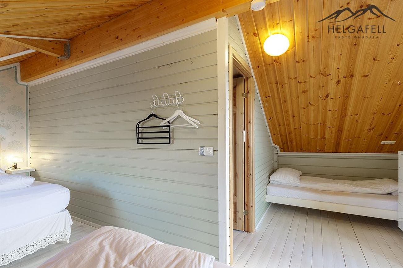 Svefnherbergi 2: Timburgólf. Í dag er hjónarúm ásamt barnarúmi í þessu herbergi.