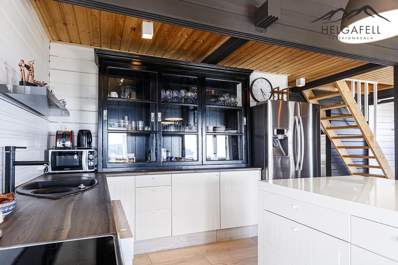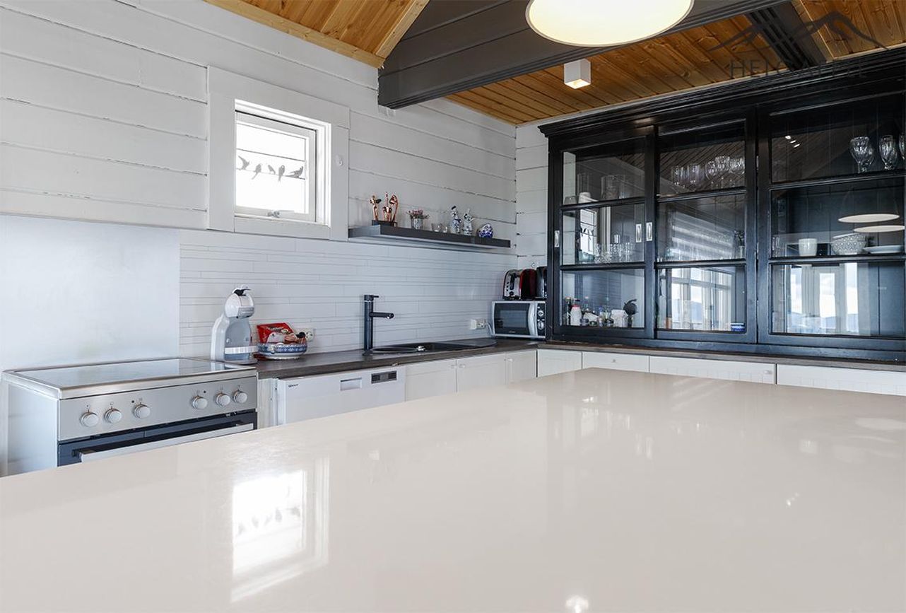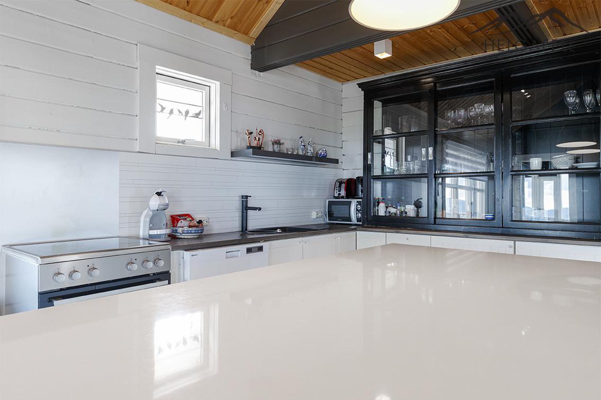 Eldhús er opið inn í stofu með stórri eyju og góðu skápaplássi. Stór eldavél, tengi fyrir uppþvottavél og tvöfaldan ísskáp. Harðparket á gólfi.