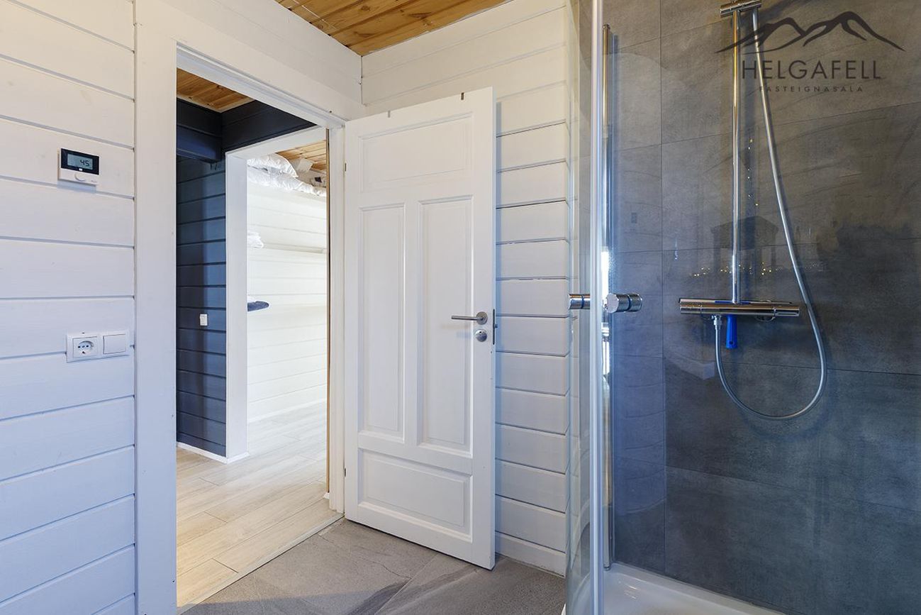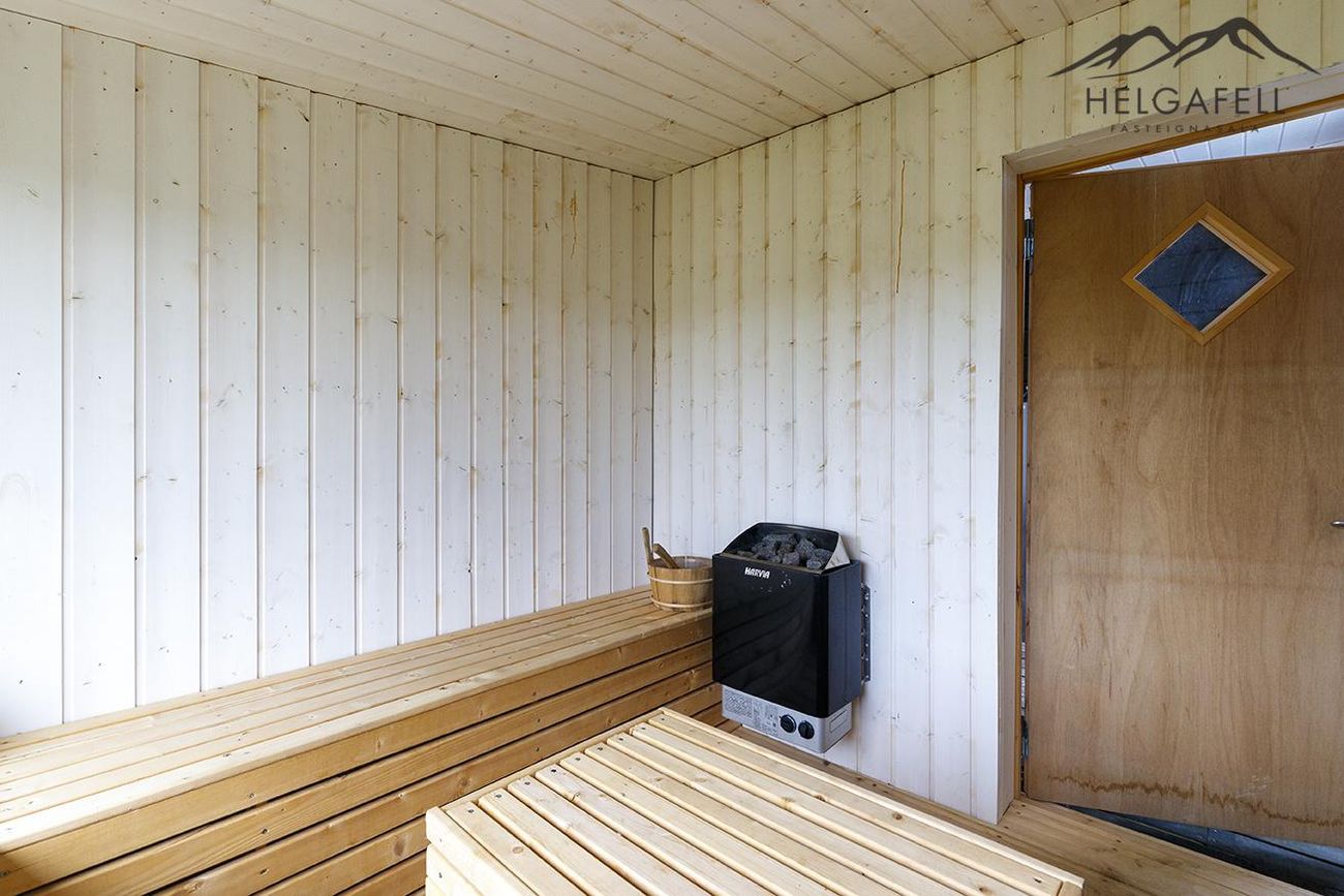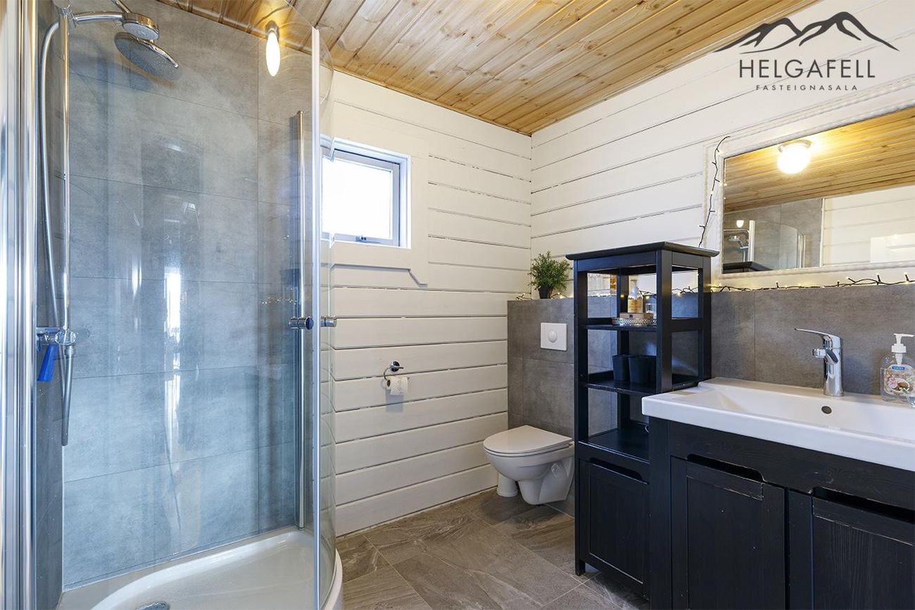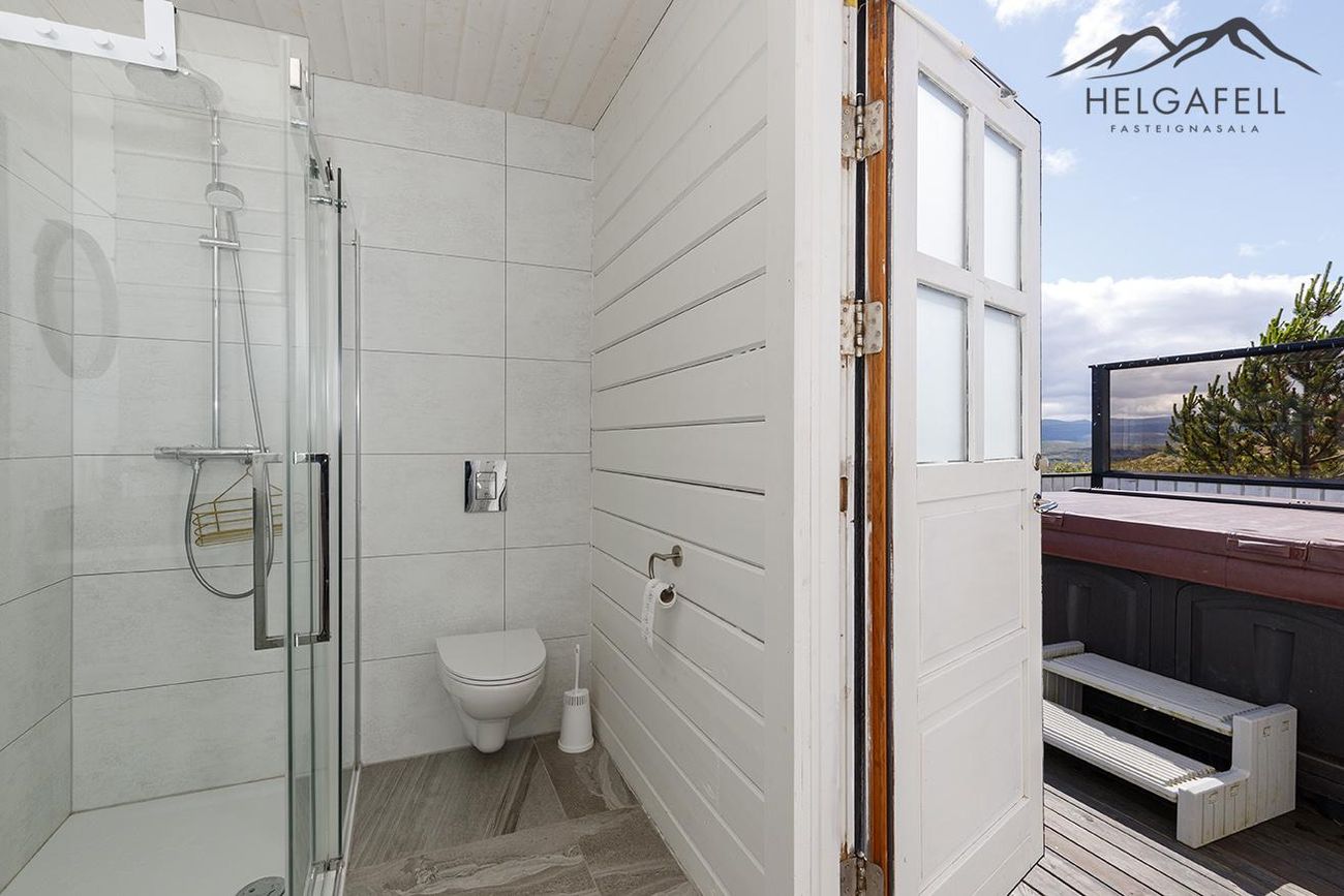 Baðherbergi 2: Flísar á gólfi, upphengt salerni ásamt "walk-in" sturtu. Útgengt úr baðherbergi út á pall þar sem heiti potturinn og saunan er.