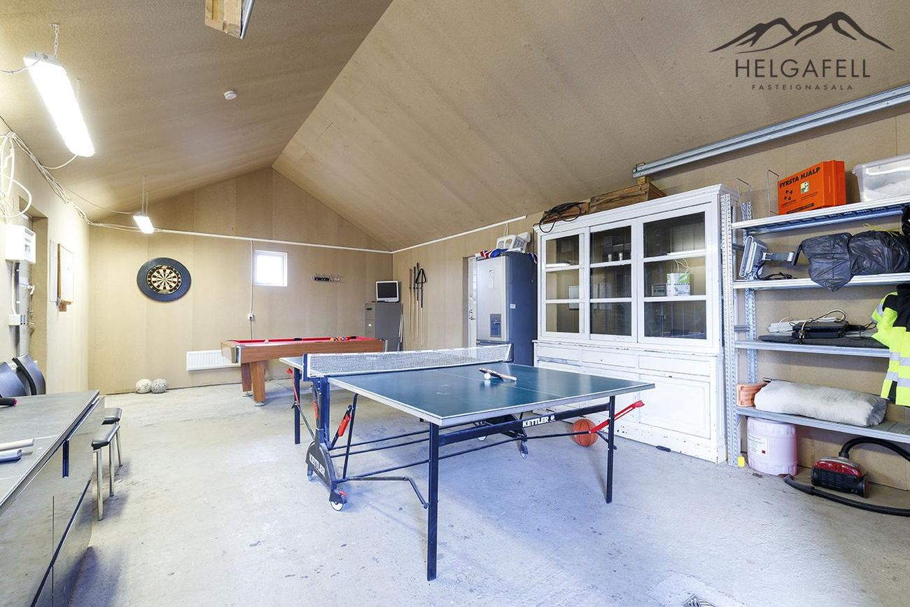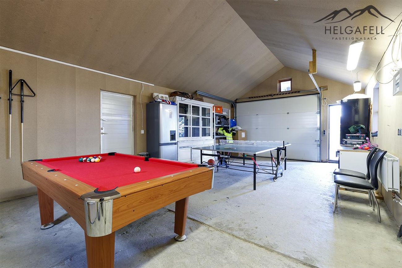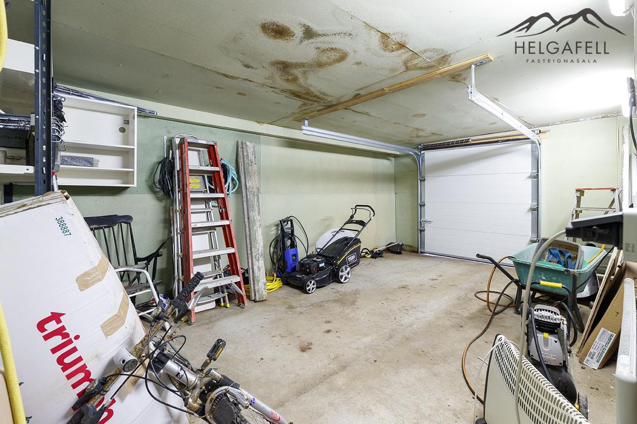BílskúrSteypt og lakkað gólf. Mikil lofthæð. Í dag er bílskúrinn notaður sem hobby herbergi. Sambyggt bílskúrnum er annar bílskúr sem notaður er sem geymsla en er með innkeyrsluhurð Innangengt er á milli bílskúranna.