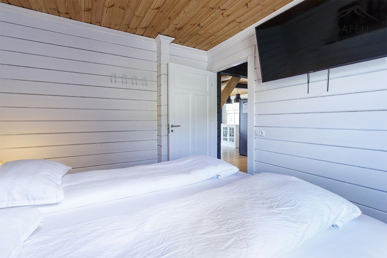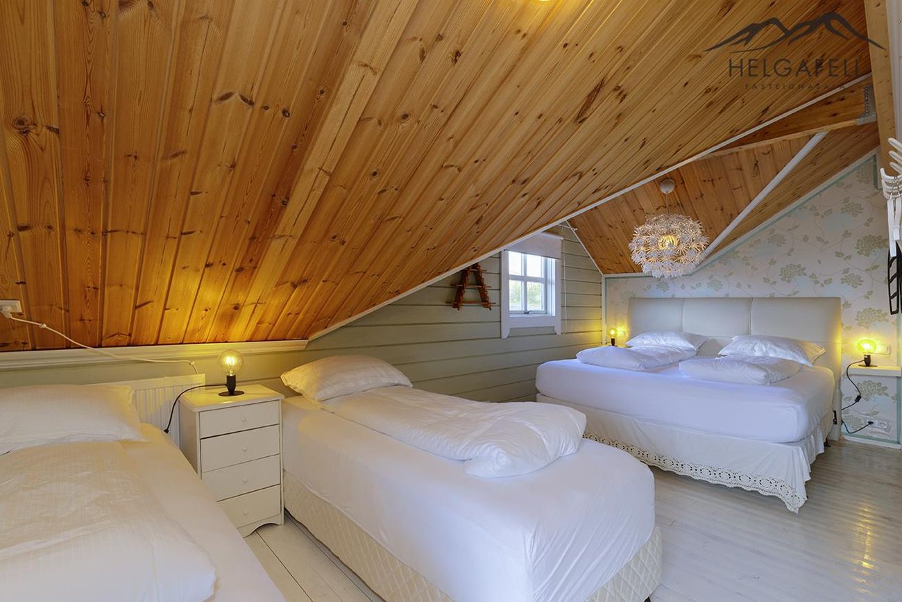 Svefnherbergi 1: Stórt fjölskylduherbergi með timburgólfi, útgengt á svalir úr herbergi. Í dag er svefnpláss og rúm fyrir fimm manneskjur í herberginu.