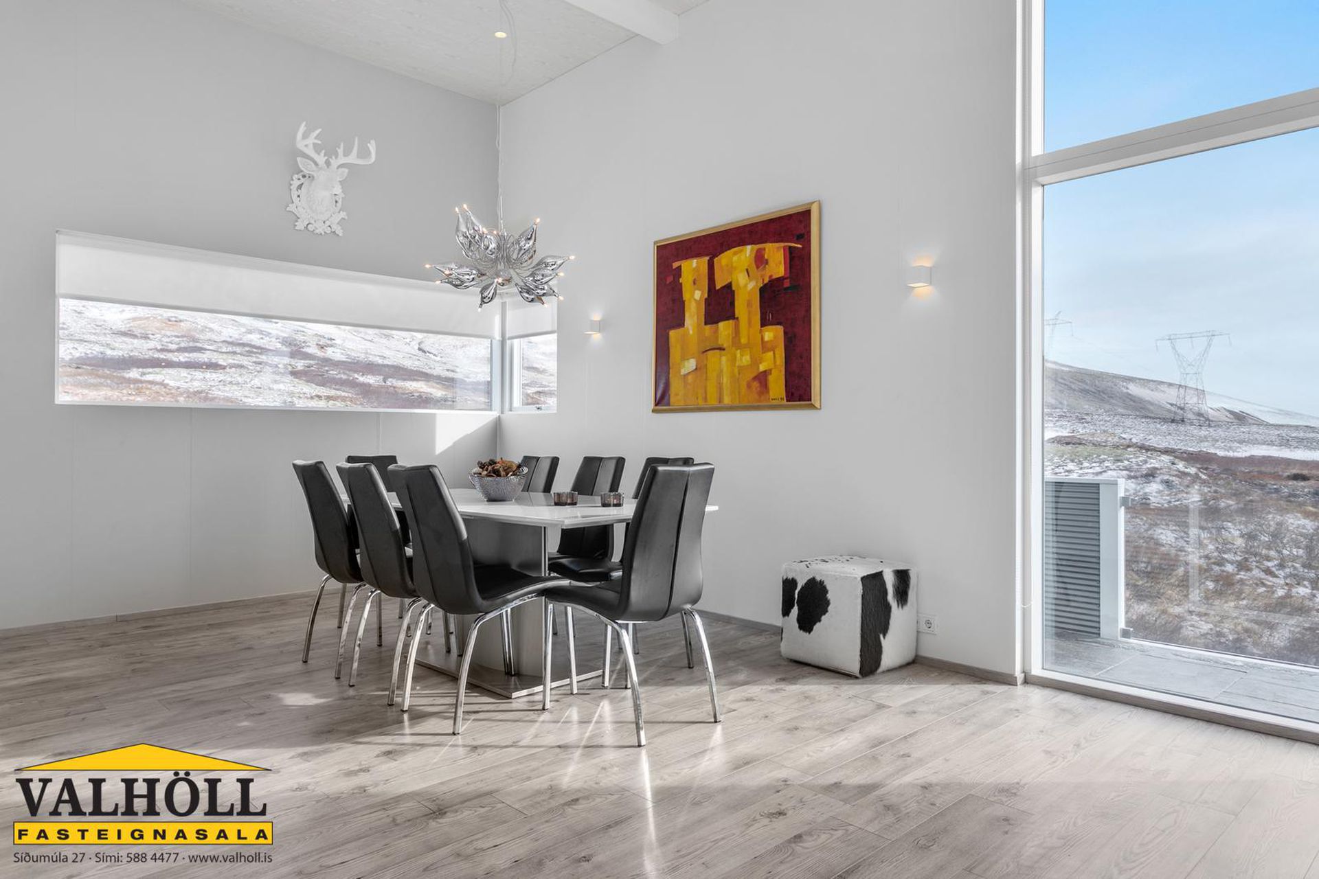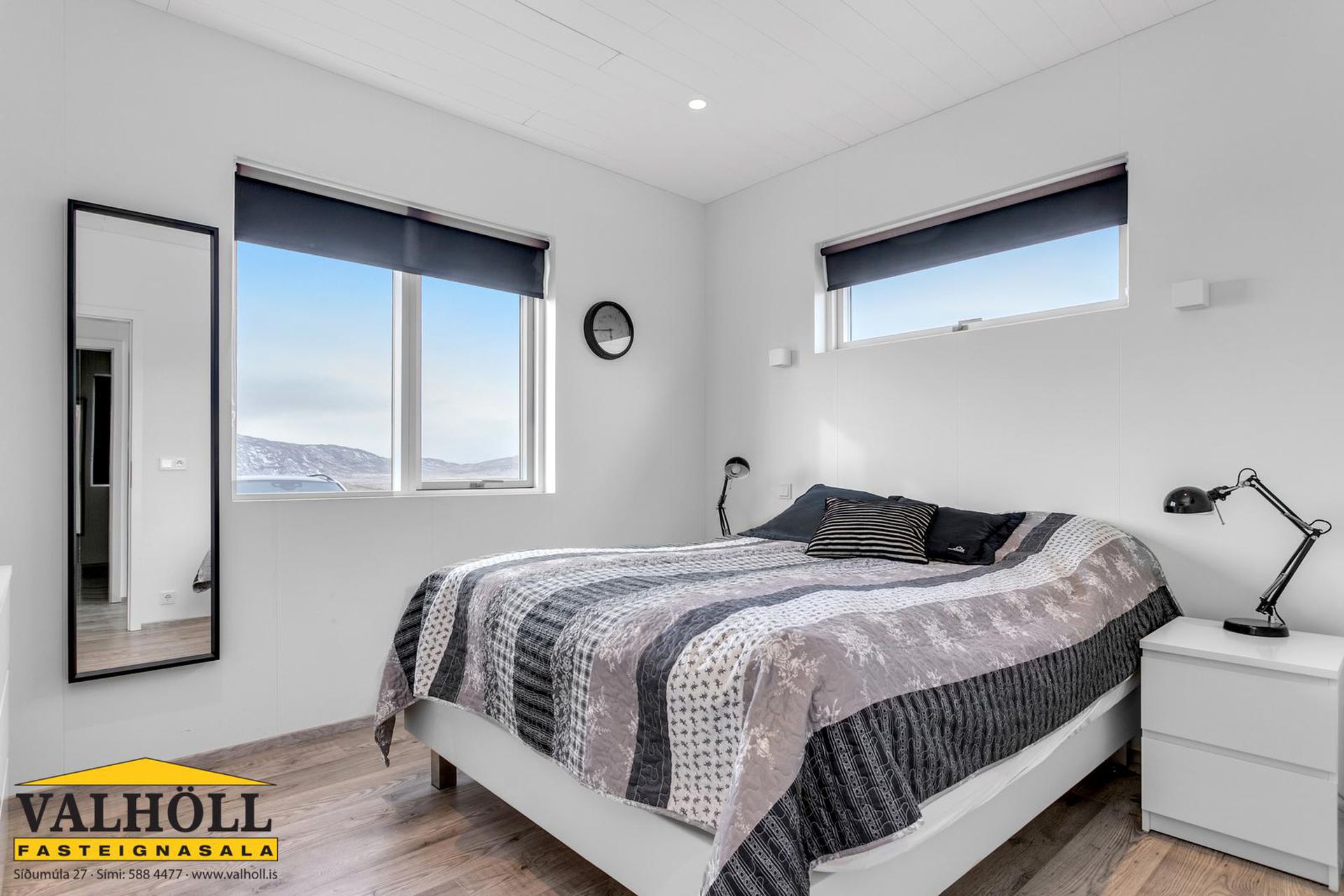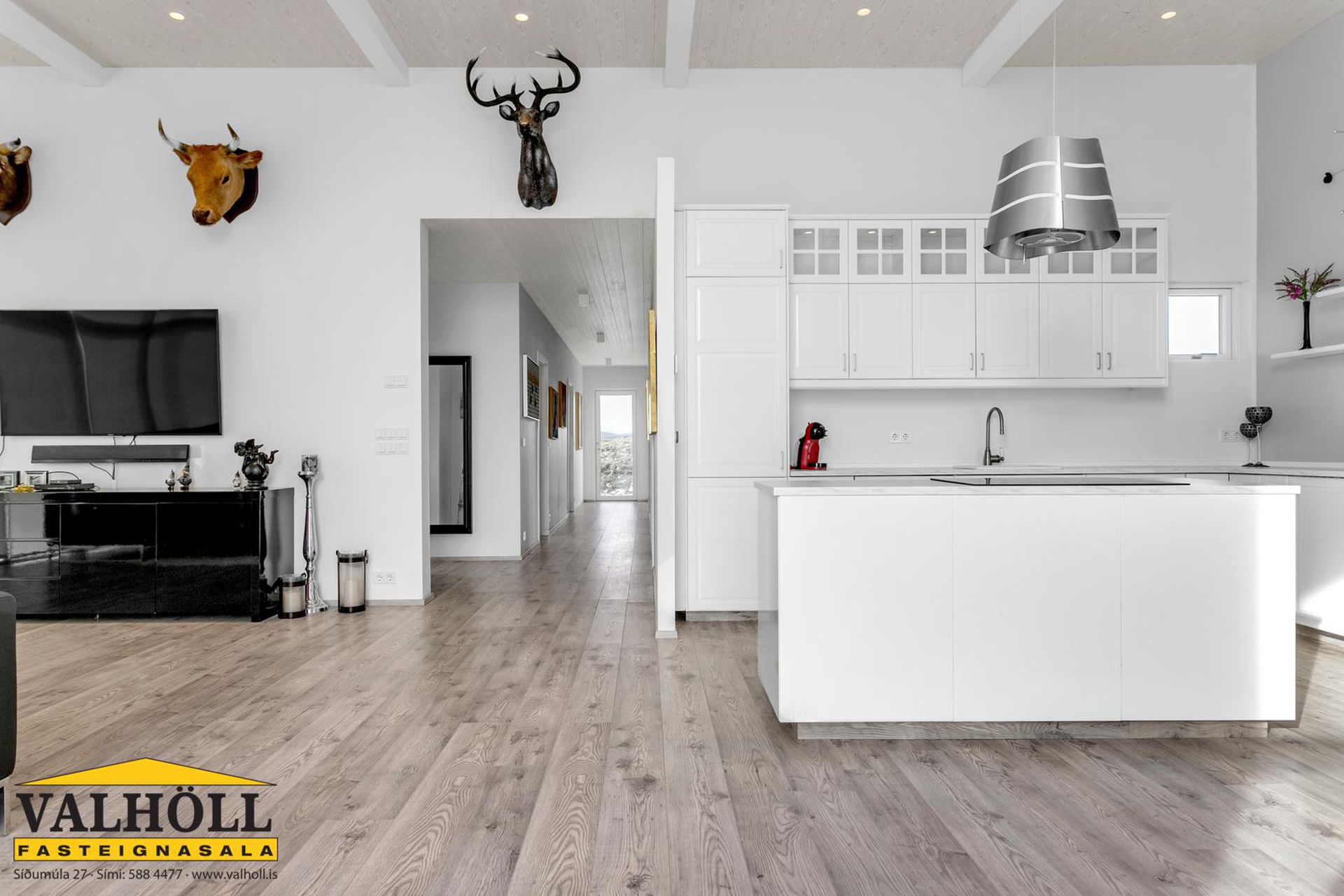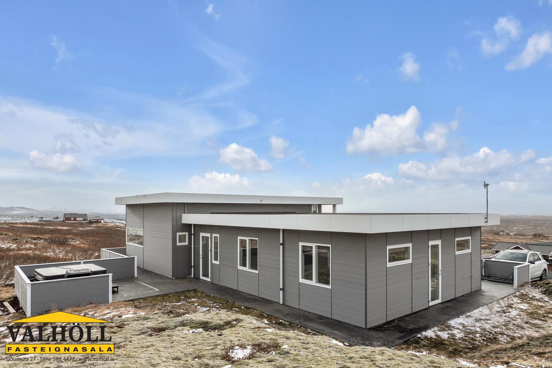 Nánari lýsing: Húsið er álkætt timburhús sem byggt er ofan á steypta sökkla og plötu með í steyptum gólfhitalögnum. Húsið skiptist í forstofu með góðum fataskápum, þvottahús/geymslu, svefnherbergisgang með fjórum rúmgóðum svefnherbergjum, baðherbergi, þaðan sem útgengt er út á verönd með heitum potti og rúmgott alrými sem samanstendur af glæsilegu eldhúsi með eyju, stofu og borðstofu. Alrýmið er með góðri lofthæð og er sérstaklega bjart með stóra glugga á alla vegu sem flestir eru gólfsíðir. Rafdrifnar gardínur. Á gólfum er fallegt parket að frátöldu baðherbergi sem er flísalagt. Allt efnisval og frágangur til fyrirmyndar. Stór hluti innbús getur fylgt með í kaupunum. Hitaveita er í húsinu. Gatan er aðgangsstýrð með hliði. Falleg steypt verönd umleikur húsið með stimpluðu mynstri.