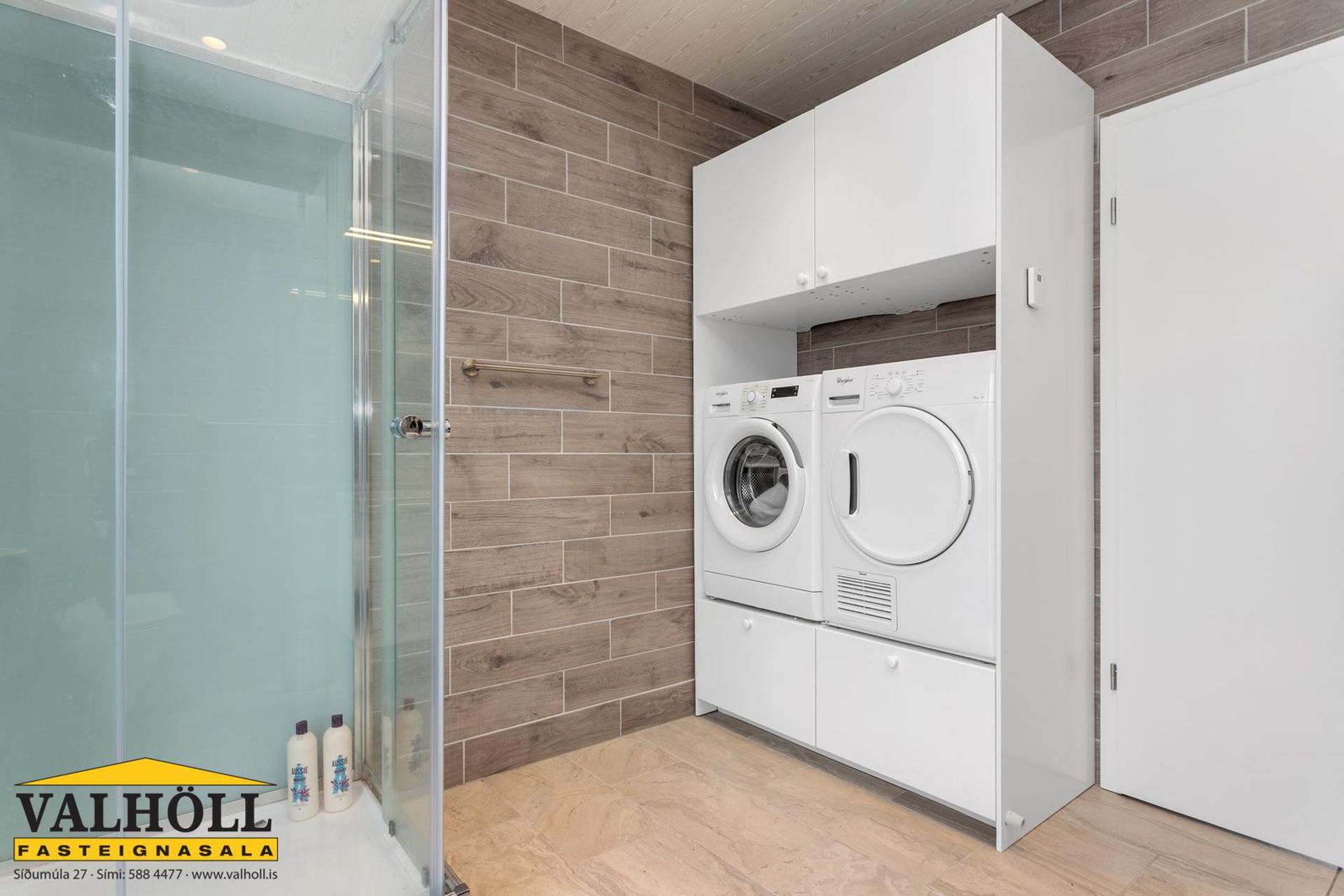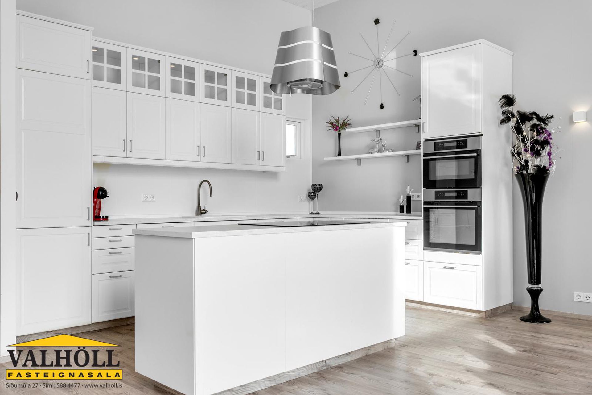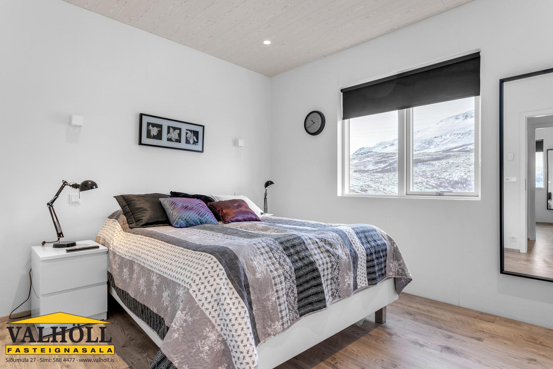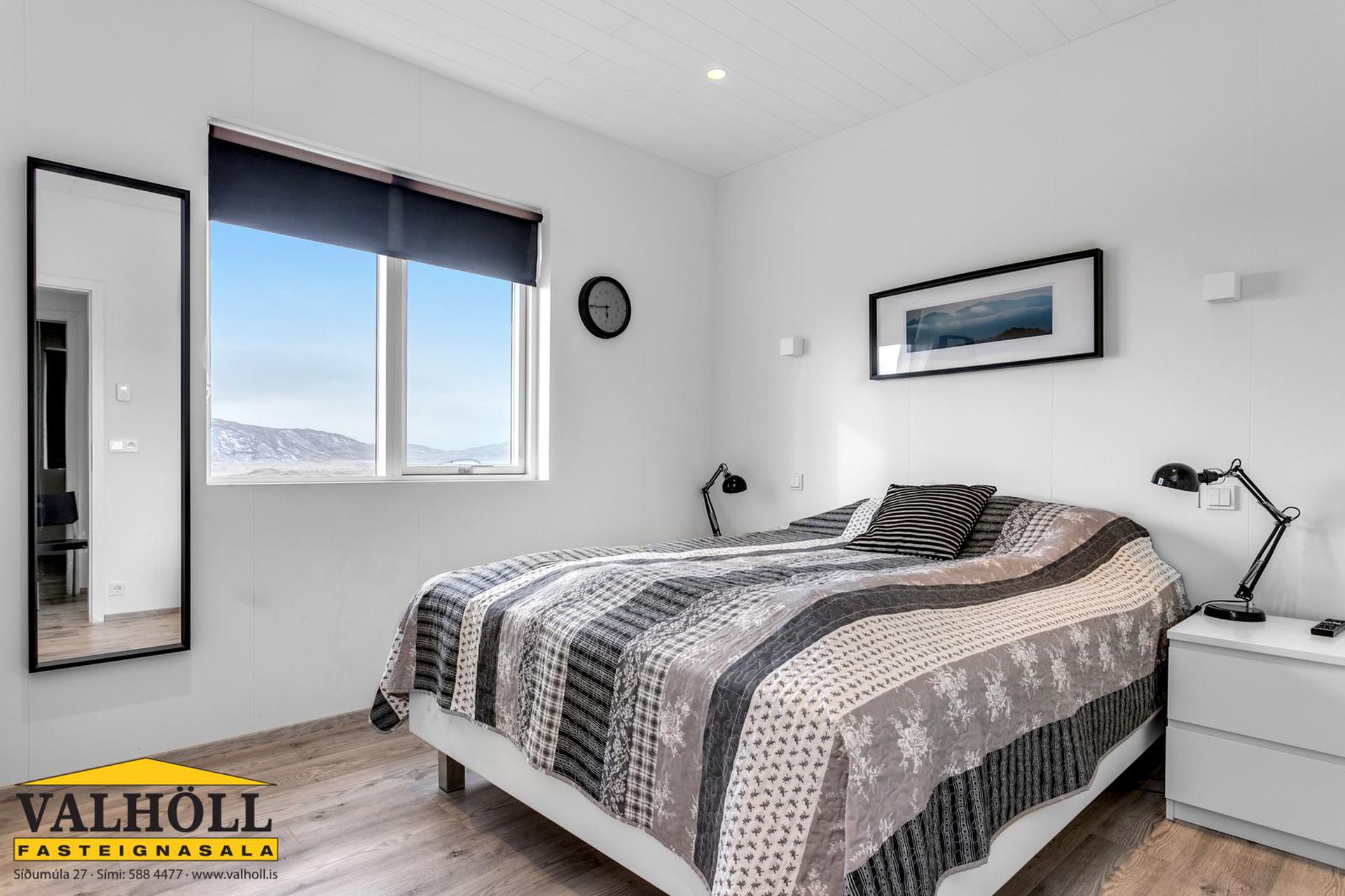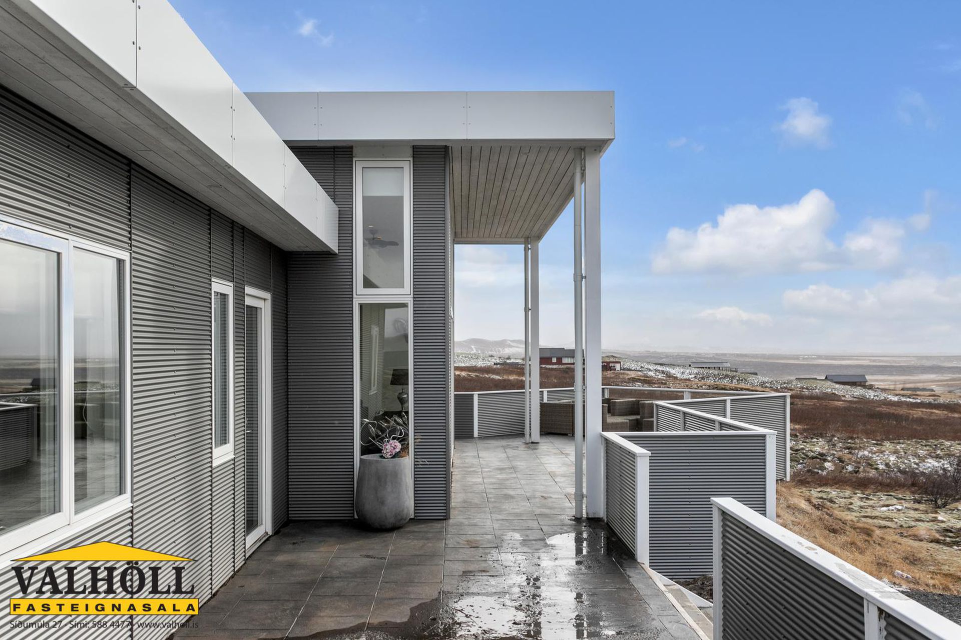 Nánari lýsing: Húsið er álkætt timburhús sem byggt er ofan á steypta sökkla og plötu með í steyptum gólfhitalögnum. Húsið skiptist í forstofu með góðum fataskápum, þvottahús/geymslu, svefnherbergisgang með fjórum rúmgóðum svefnherbergjum, baðherbergi, þaðan sem útgengt er út á verönd með heitum potti og rúmgott alrými sem samanstendur af glæsilegu eldhúsi með eyju, stofu og borðstofu. Alrýmið er með góðri lofthæð og er sérstaklega bjart með stóra glugga á alla vegu sem flestir eru gólfsíðir. Rafdrifnar gardínur. Á gólfum er fallegt parket að frátöldu baðherbergi sem er flísalagt. Allt efnisval og frágangur til fyrirmyndar. Stór hluti innbús getur fylgt með í kaupunum. Hitaveita er í húsinu. Gatan er aðgangsstýrð með hliði. Falleg steypt verönd umleikur húsið með stimpluðu mynstri.