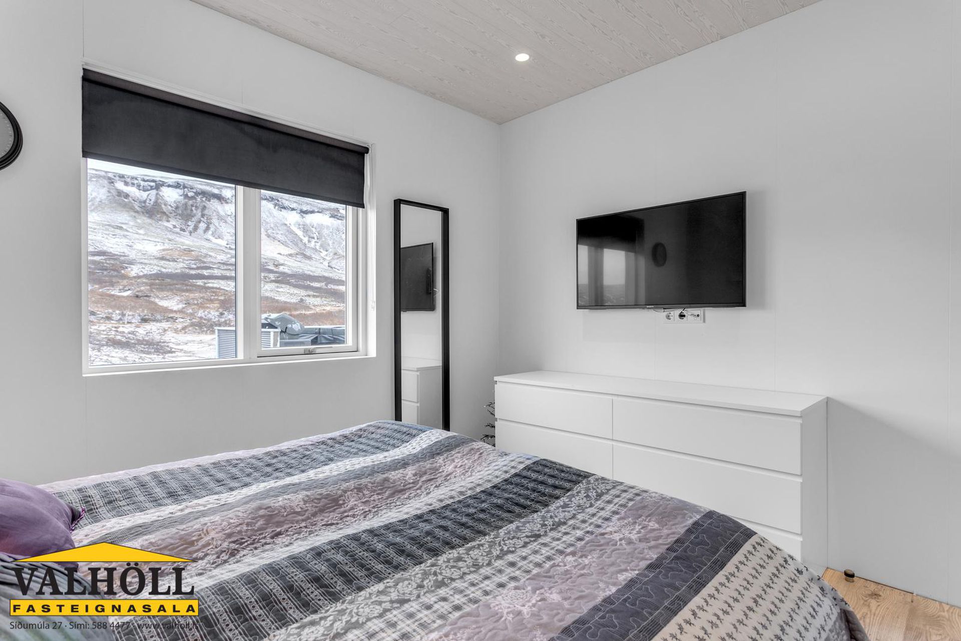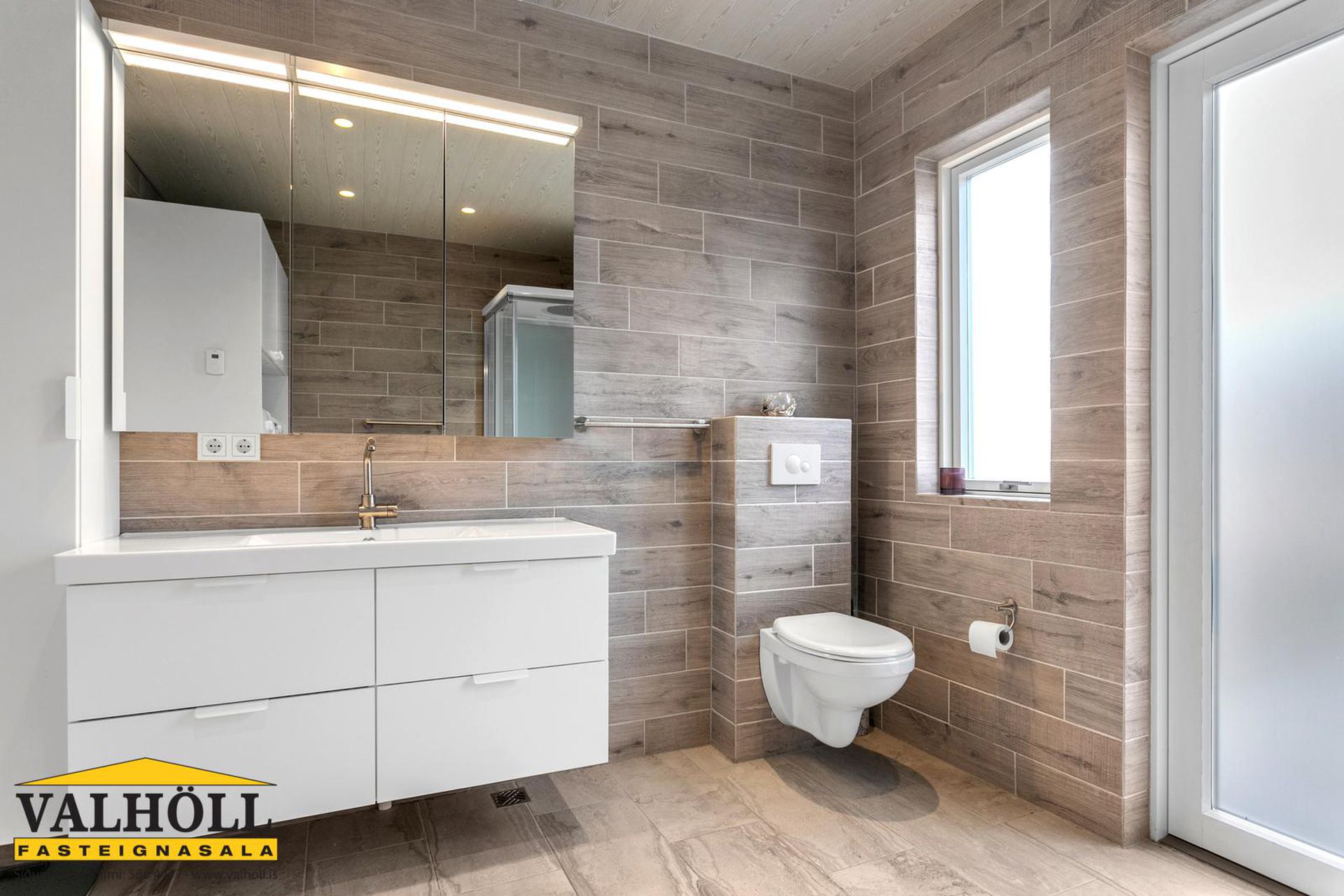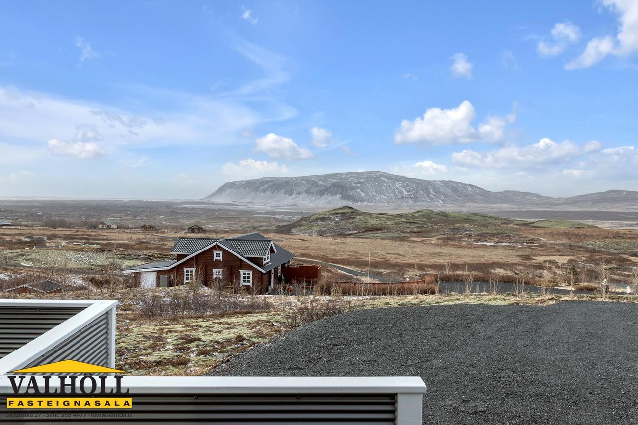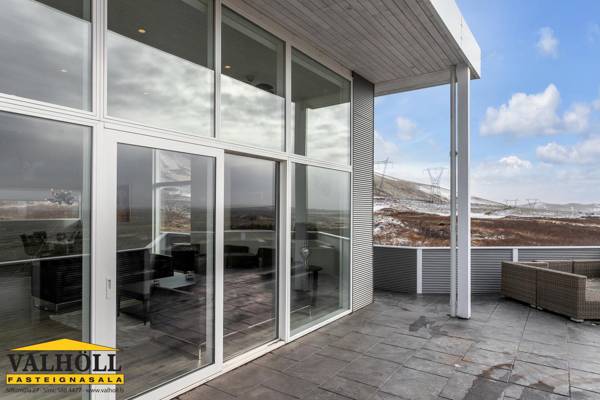Nánari lýsing: Húsið er álkætt timburhús sem byggt er ofan á steypta sökkla og plötu með í steyptum gólfhitalögnum. Húsið skiptist í forstofu með góðum fataskápum, þvottahús/geymslu, svefnherbergisgang með fjórum rúmgóðum svefnherbergjum, baðherbergi, þaðan sem útgengt er út á verönd með heitum potti og rúmgott alrými sem samanstendur af glæsilegu eldhúsi með eyju, stofu og borðstofu. Alrýmið er með góðri lofthæð og er sérstaklega bjart með stóra glugga á alla vegu sem flestir eru gólfsíðir. Rafdrifnar gardínur. Á gólfum er fallegt parket að frátöldu baðherbergi sem er flísalagt. Allt efnisval og frágangur til fyrirmyndar. Stór hluti innbús getur fylgt með í kaupunum. Hitaveita er í húsinu. Gatan er aðgangsstýrð með hliði. Falleg steypt verönd umleikur húsið með stimpluðu mynstri.