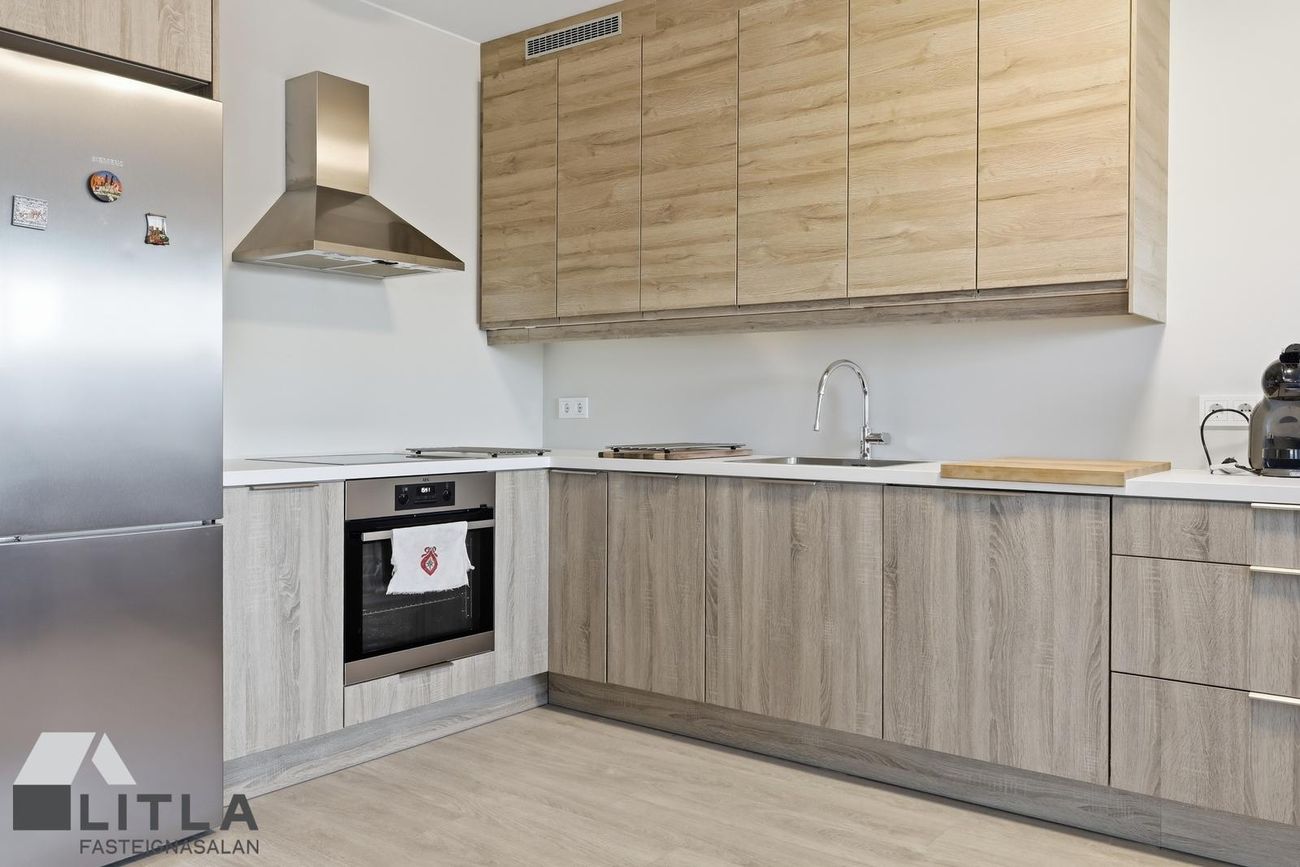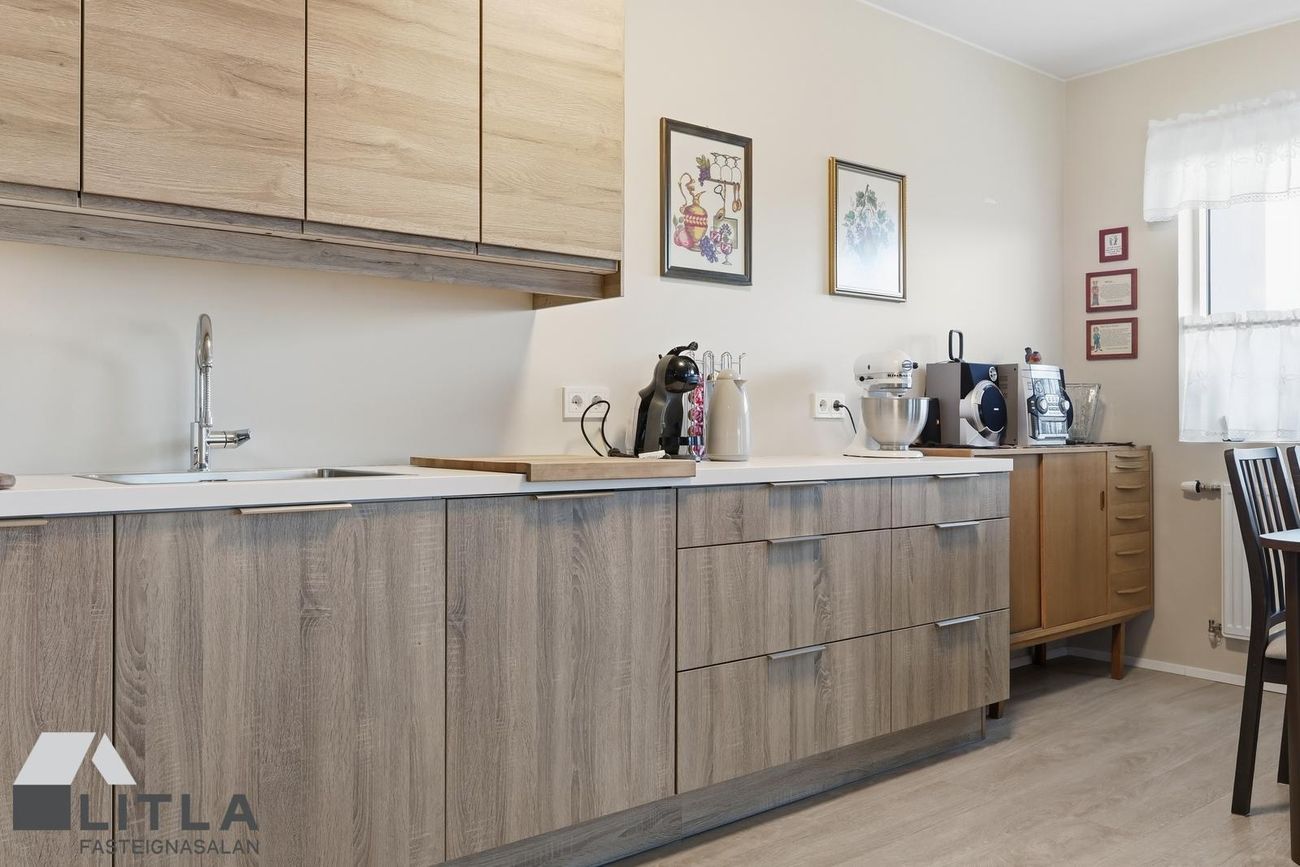 Eldhús / stofa í sameiginlegu opnu rými með harðparketi, eldhúsinnrétting með viðaráferð, innbyggð uppþvottavél, bakaraofn, helluborð og háfur. Útgengt úr stofu á rúmgóðan pall.