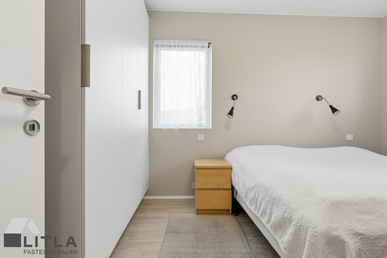 Hjónaherbergi með stórum fataskáp og harðparket á gólfi.