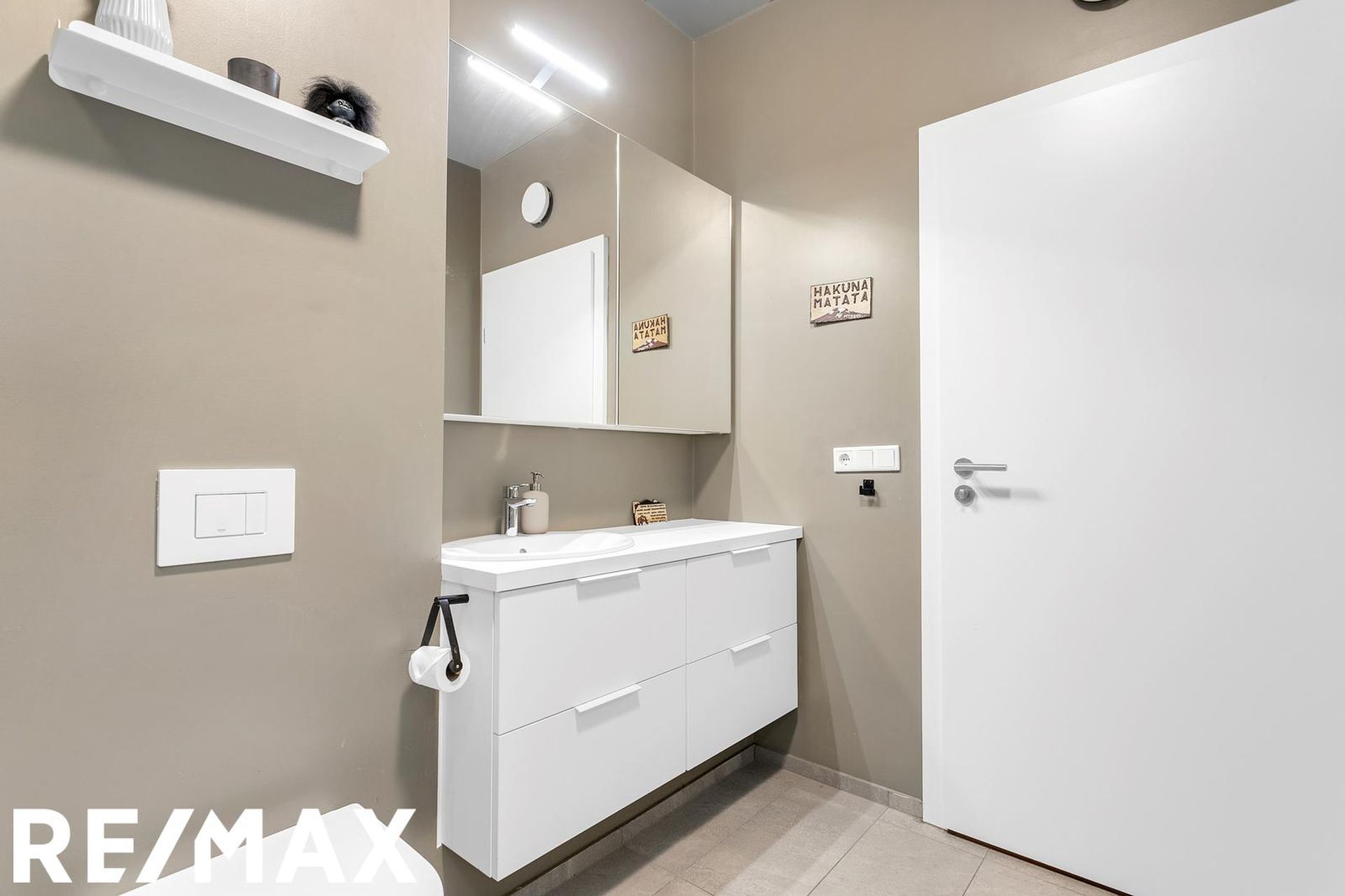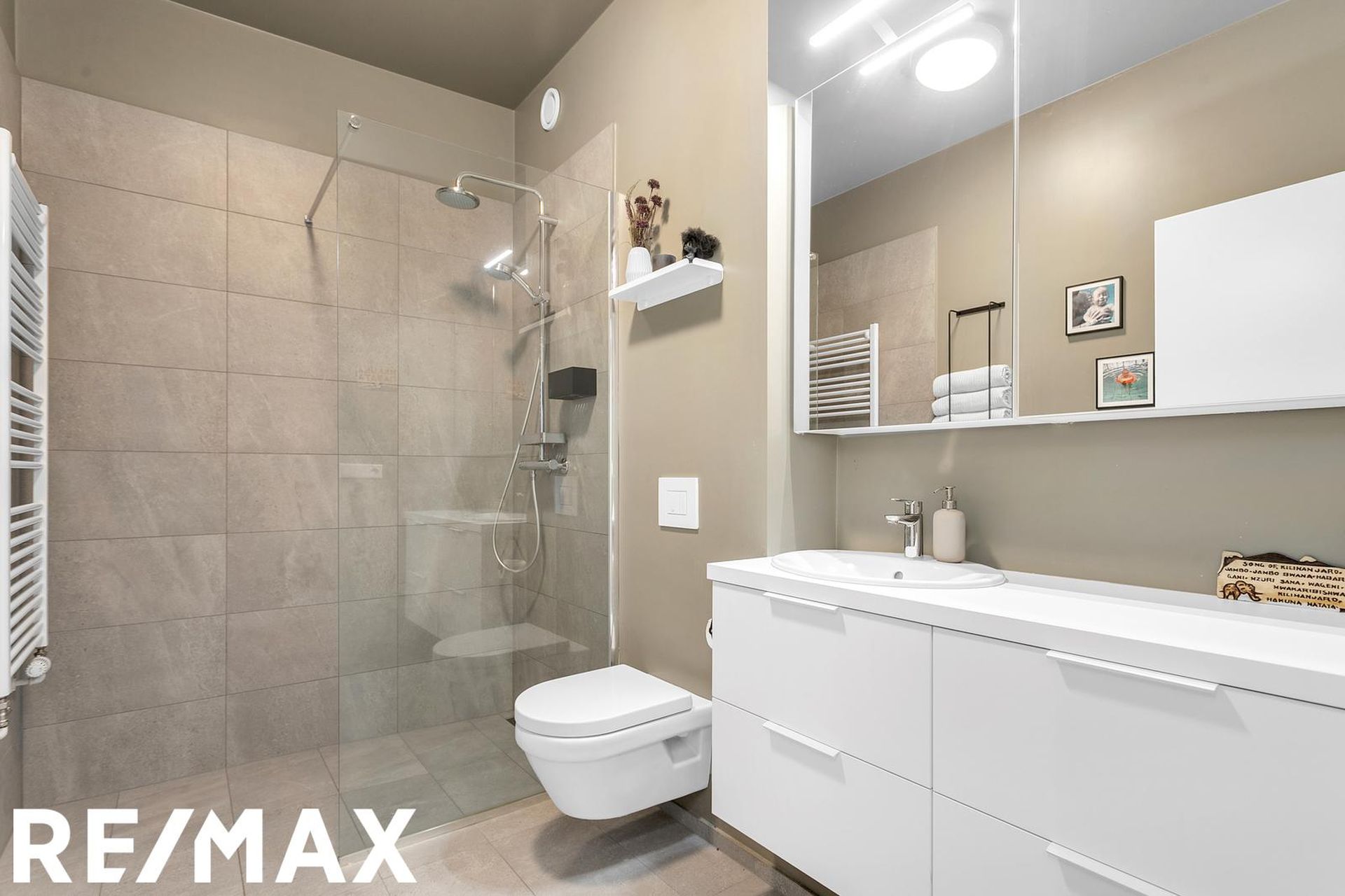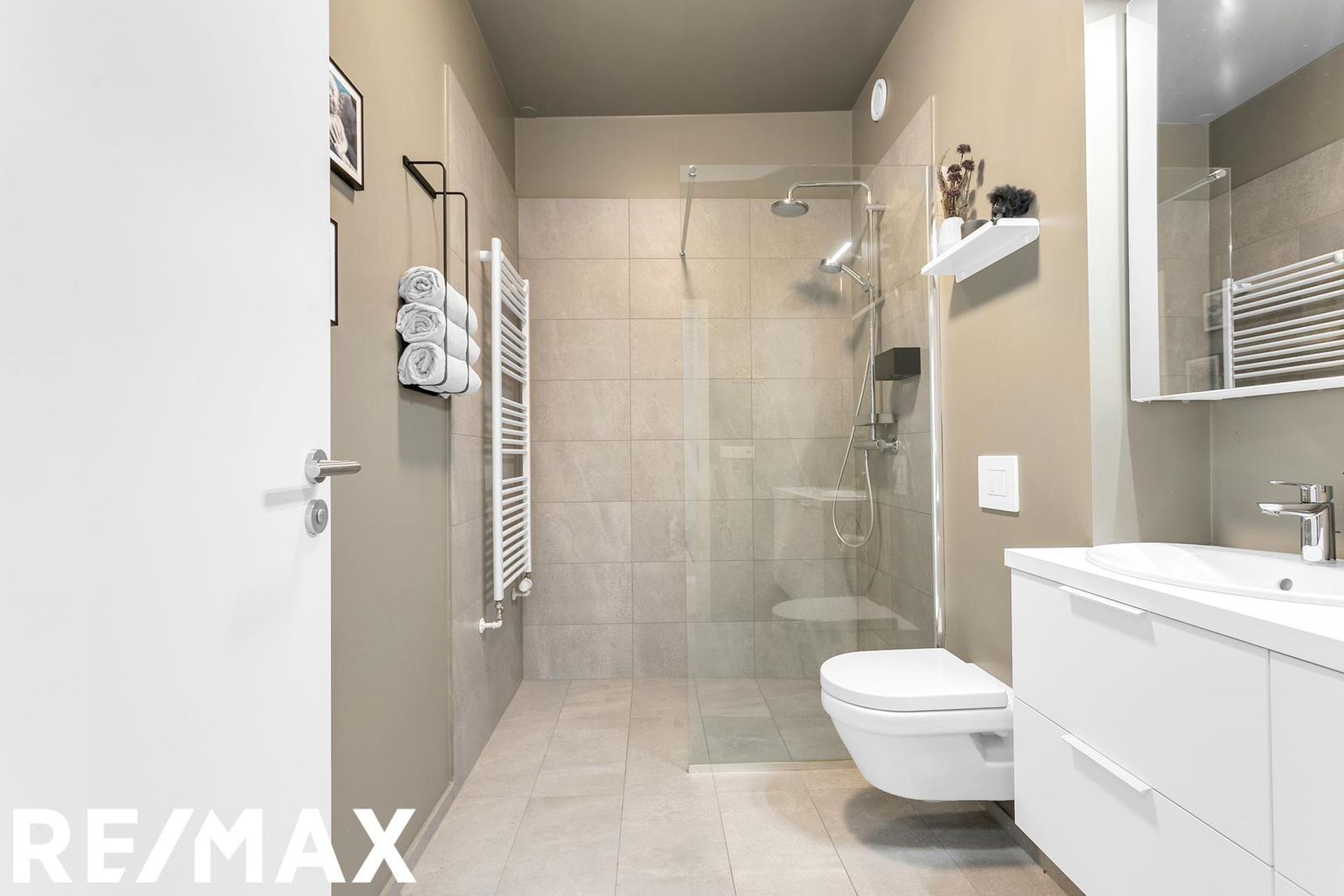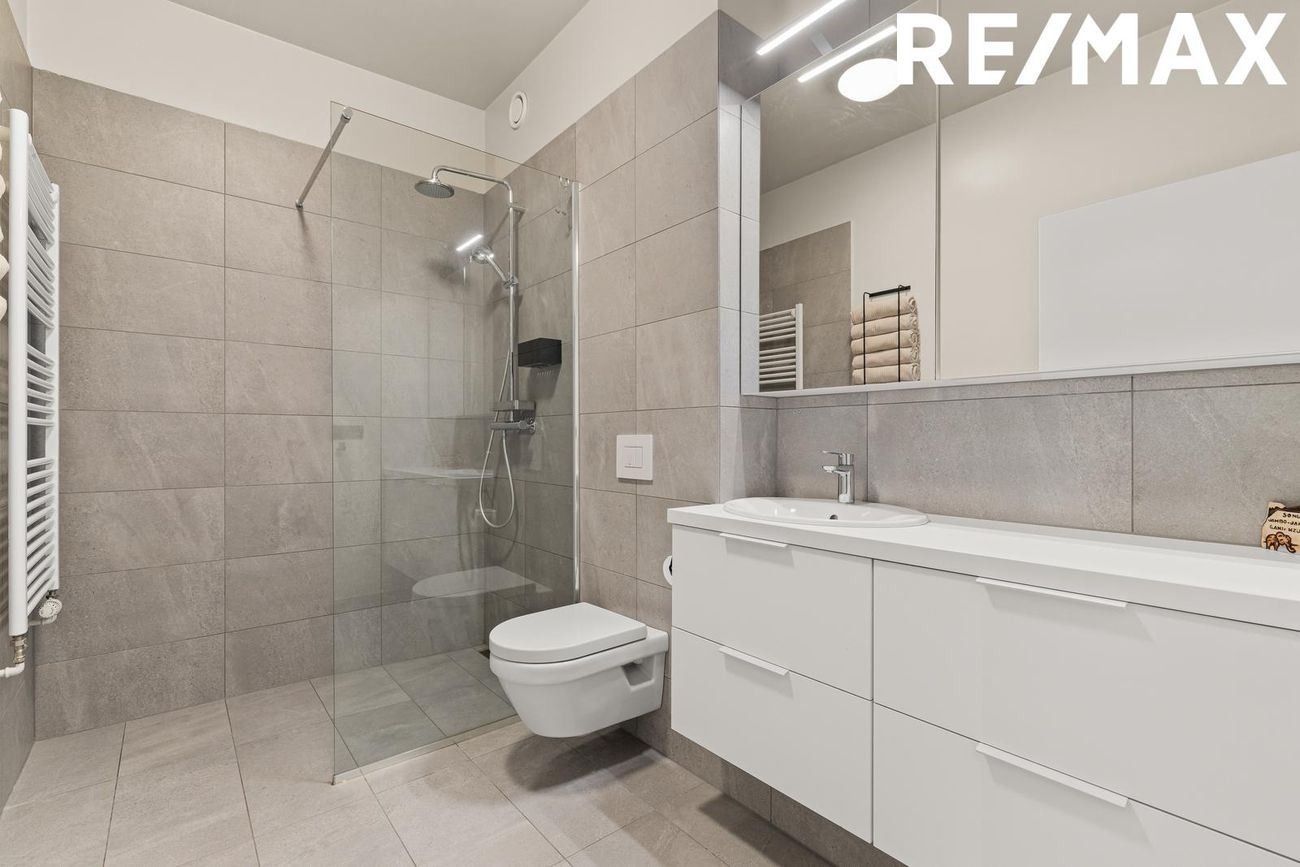 Baðherbergið er rúmgott með upphengdu salerni, rúmgóðri sturtu, góðri innréttingu undir og við handlaug, handklæðaofn, flísar á gólfi og upp á tvo veggi; í sturtu, við handlaug og salerni.