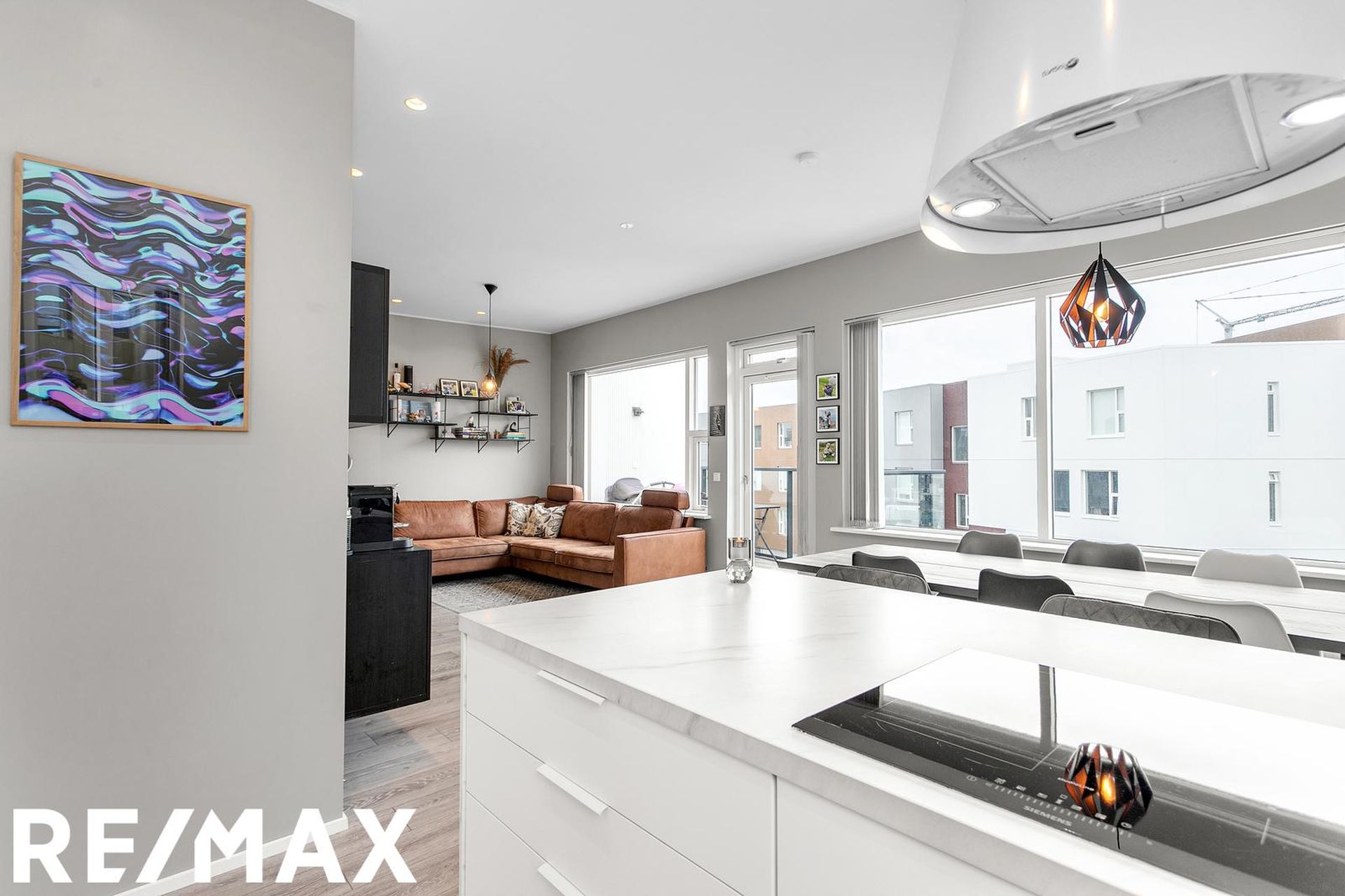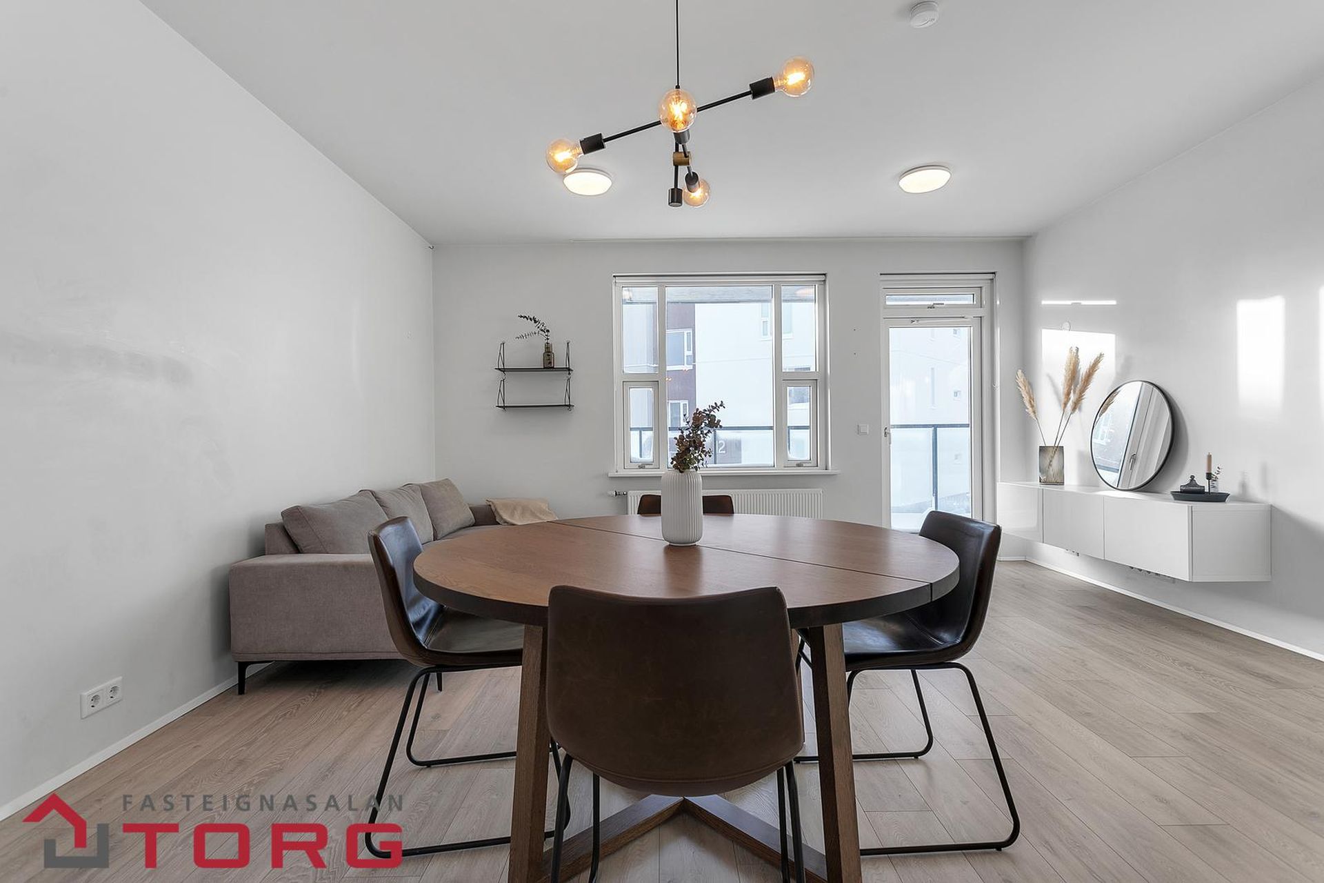 Stofan, borðstofan og eldhús eru á vinstri hönd í björtu opnu rými með glugga bæði til suðurs og vesturs.