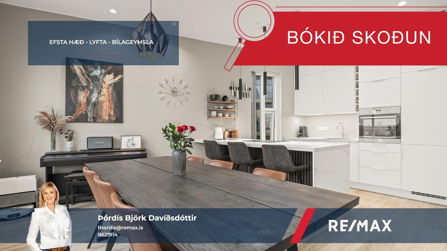 Í húsinu er lyfta og sérmerkt bílastæði í bílageymslu. RAFHLEÐSLUSTÖÐ er í bílastæðinu og fylgir með í kaupunum.Allar nánari upplýsingar og bókun á skoðun veitir Þórdís Björk löggiltur fasteigna- og skipasali s: 862-1914 á milli kl. 10 og 18 alla virka daga eða á netfangið thordis@remax.is SMELLTU HÉR og þú færð SÖLUYFIRLIT SAMSTUNDIS* AUKIN LOFTHÆÐ ca 265 cm *