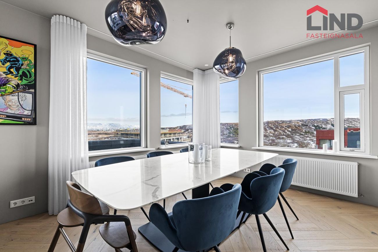 Nýtt á skrá! Glæsileg útsýnis þakíbúð með tæplega 50fm þaksvölum með heitum potti, þremur svefnherbergjum, tveimur baðherbergjum og þremur bílastæðum í bílakjallara.Lind fasteignasala / Heimir Hallgrímsson lögg. fasteignasali (heimir@fastlind.is / 849-0672) kynnir til sölu stórglæsilega og vandaða 144,1 fermetra 4ja herb. þakíbúð (penthouse) á fjórðu hæð (404) í fallegu lyftuhúsi byggðu af ÞG Verk við Vinastræti 6 í Garðabæ. Íbúðin er björt og sérlega vel skipulögð með þremur stórum svefnherbergjum. Aukin lofthæð er yfir allri íbúð. Tvö baðherbergi eru í íbúðinni og er annað staðsett inn af hjónaherbergi. Þvottaherbergi er staðsett innan íbúðar og sjónvarpsrými sem hefur verið stúkað af að hluta með fallegum sérsmíðuðum trébitum og dökk bæsuðum panelvegg.