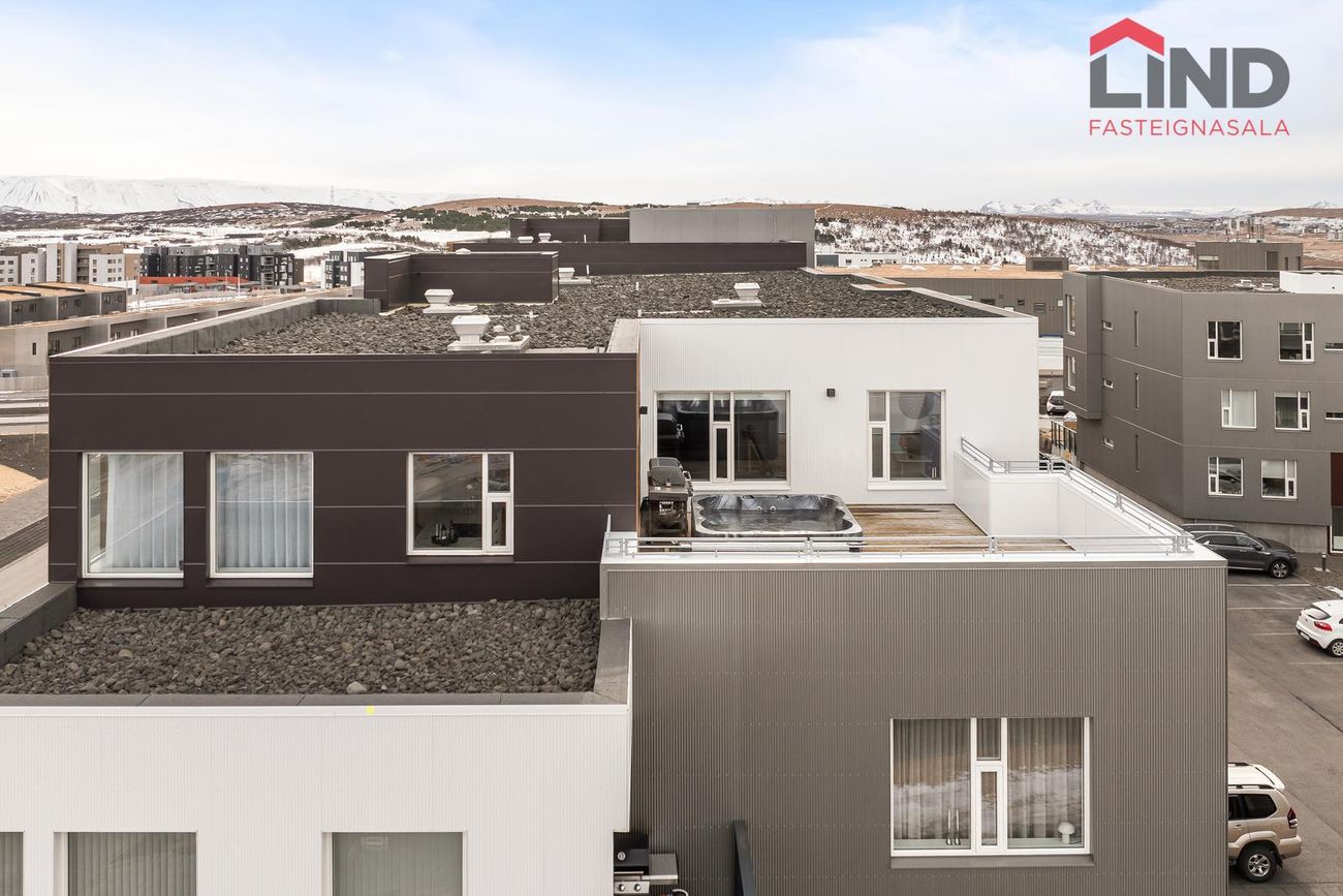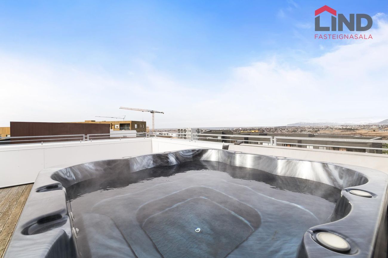 Íbúðin er með 46 fermetra þaksvölum með viðar svalagólfi og heitum potti með stórbrotnu útsýni yfir höfuðborgarsvæðið, út á sundin og til fjalla (m.a. Esjunni, Móskarðshnjúkum, Skarðsheiði að Heiðmörk og Bláföllum). Íbúðinni fylgir þrjú stæði í bílakjallara (tvö staðsett á besta stað við inngang sameignar). Geymslan er stór eða 18,7 fermetrar að stærð.
