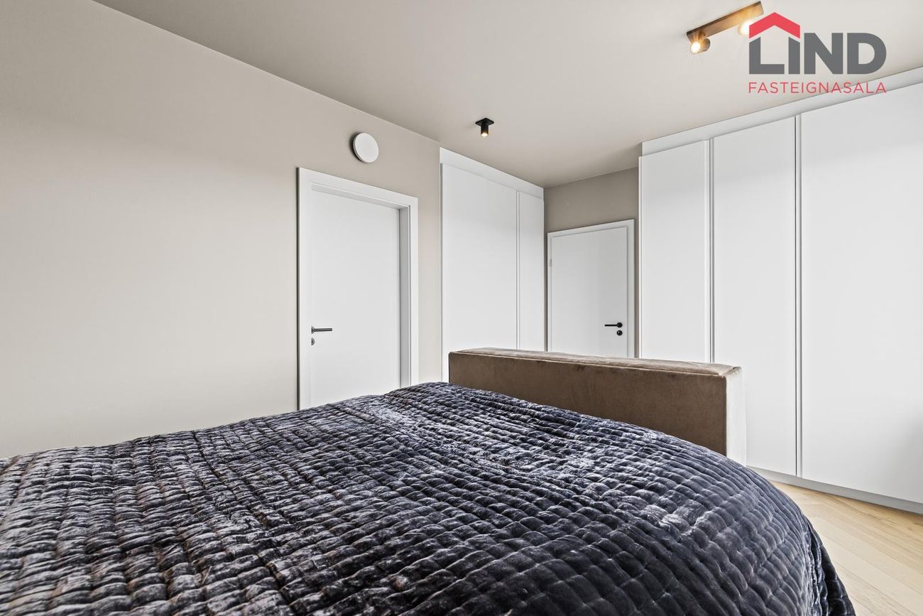 Hjónaherbergi: Með fiskibeinaparketi á gólfi og góðum fataskápum frá GKS. Gluggar til austurs með afar glæsilegu útsýni að Heiðmörk. Gengið er inn í baðherbergi I frá hjónaherbergi.