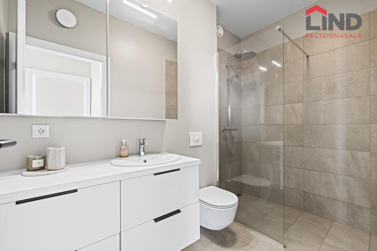 Baðherbergi II: Með fallegum flísum á gólfi og hluta veggja. Flísalögð sturta með glerþili. Innrétting frá GKS með speglaskáp fyrir ofan. Upphengt salerni og handklæðaofn. Vélræn útloftun.